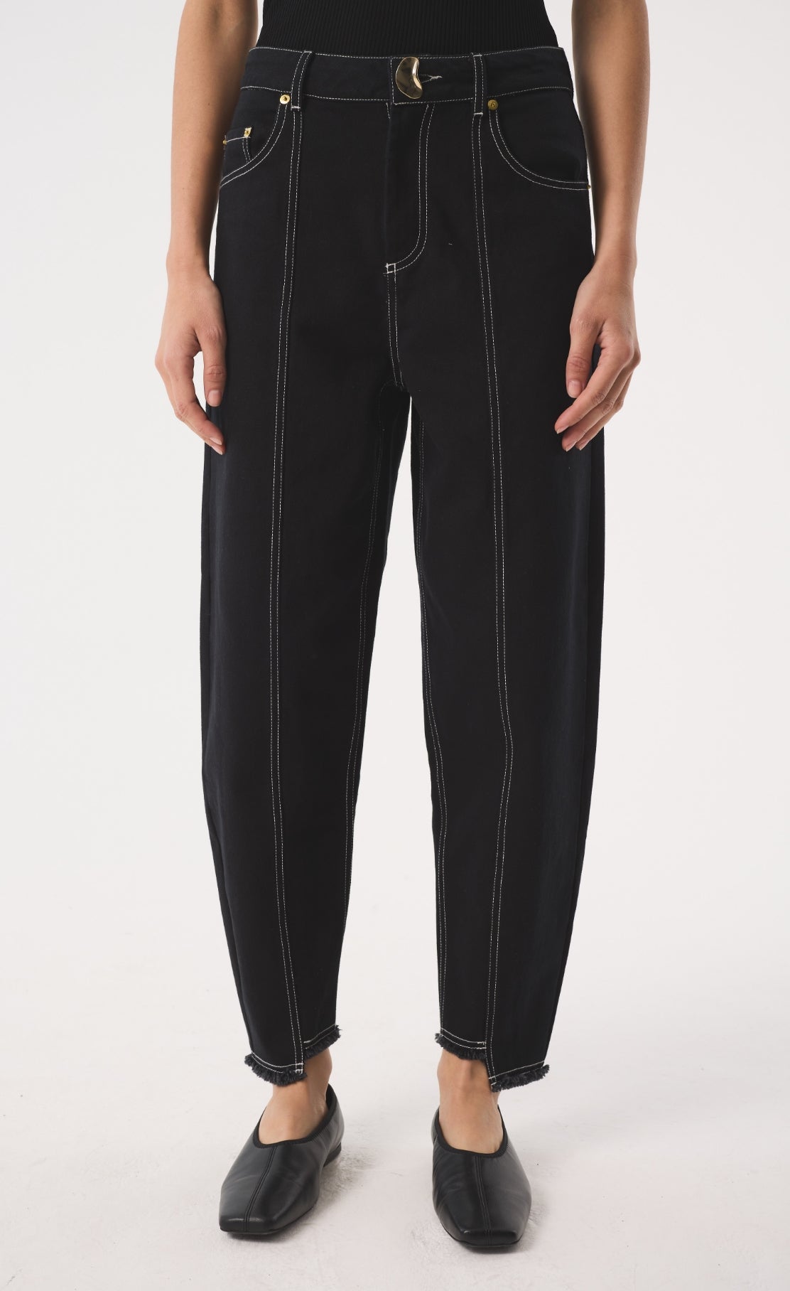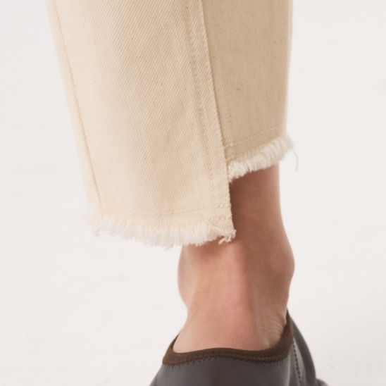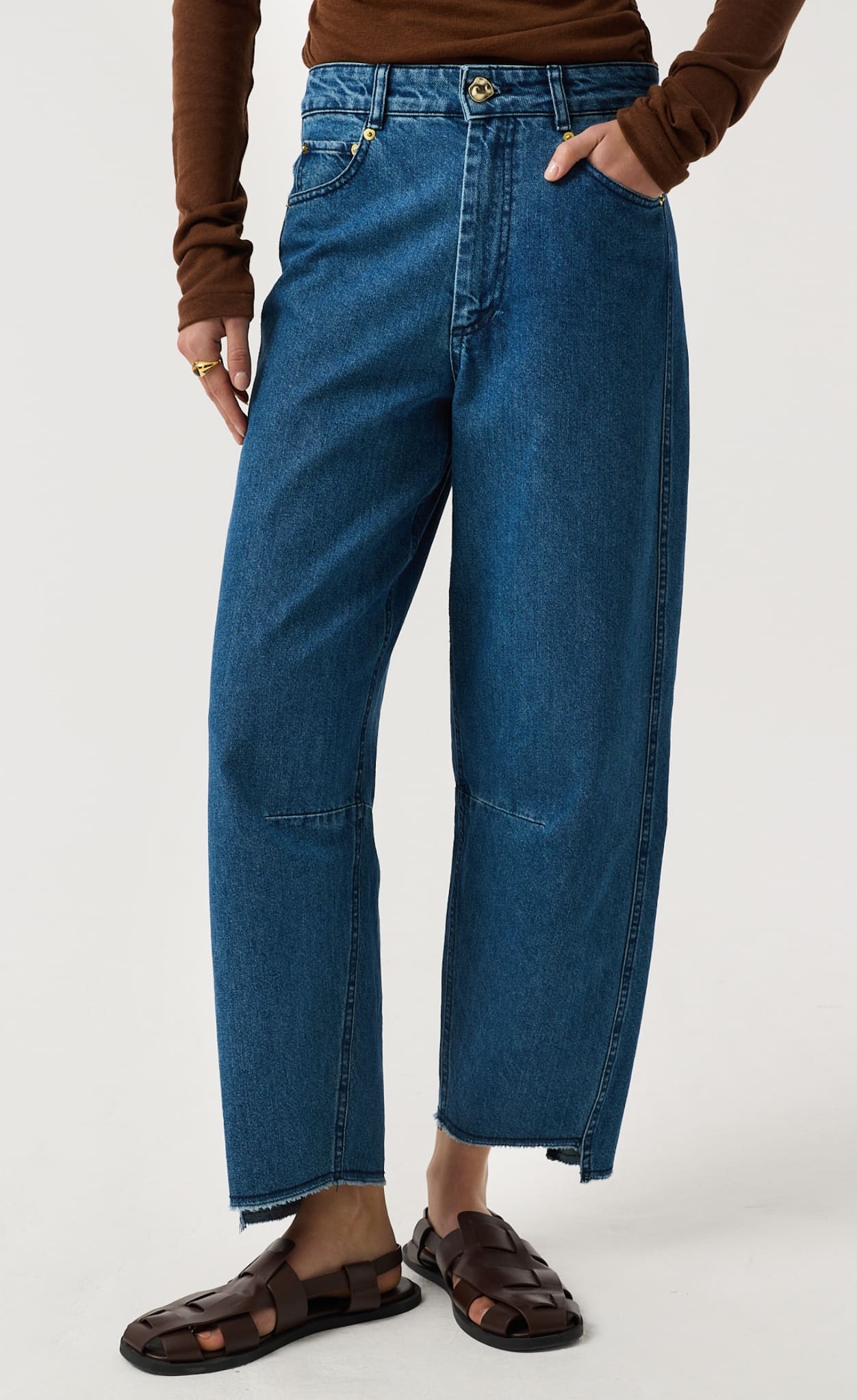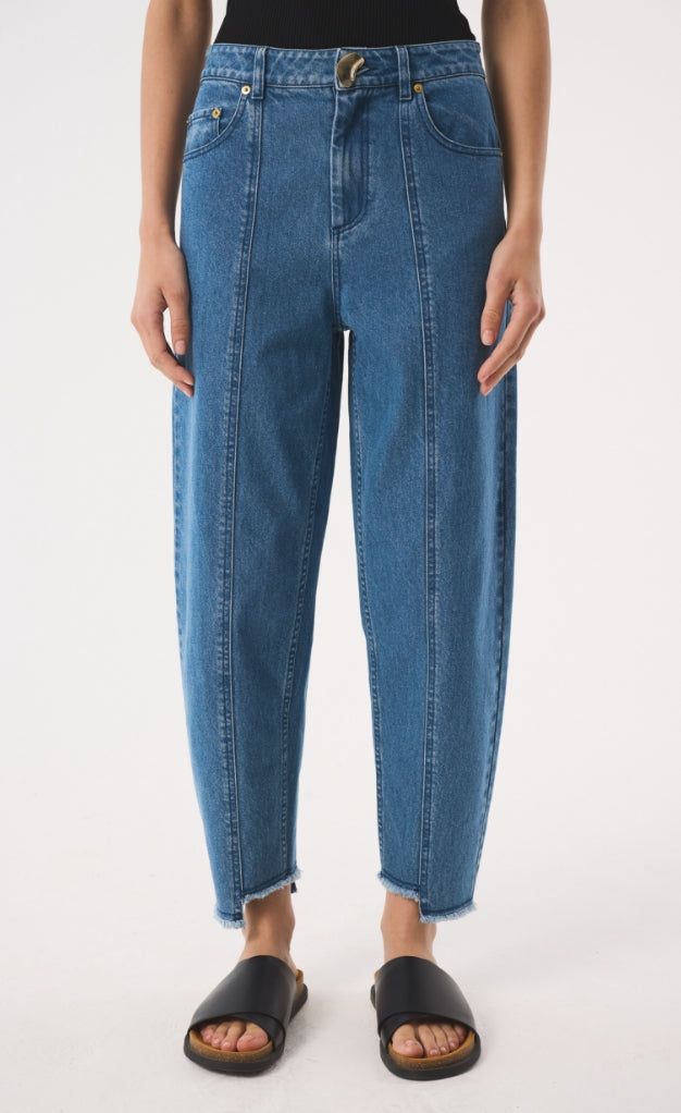 Our signature jean, Sol's distinctive silhouette is characterised by a slim barrel leg that gently tapers to a cropped, narrow asymmetric frayed hem at the ankle, creating a subtle curve that offers a modern, sculptural 'barrel' shape, Designed to be worn mid-rise on the waist, Sol is ideal for those seeking a modern, yet effortless style. Finished with our distinctive gold kidney hardware at the fly to bring elevation and distinction.
