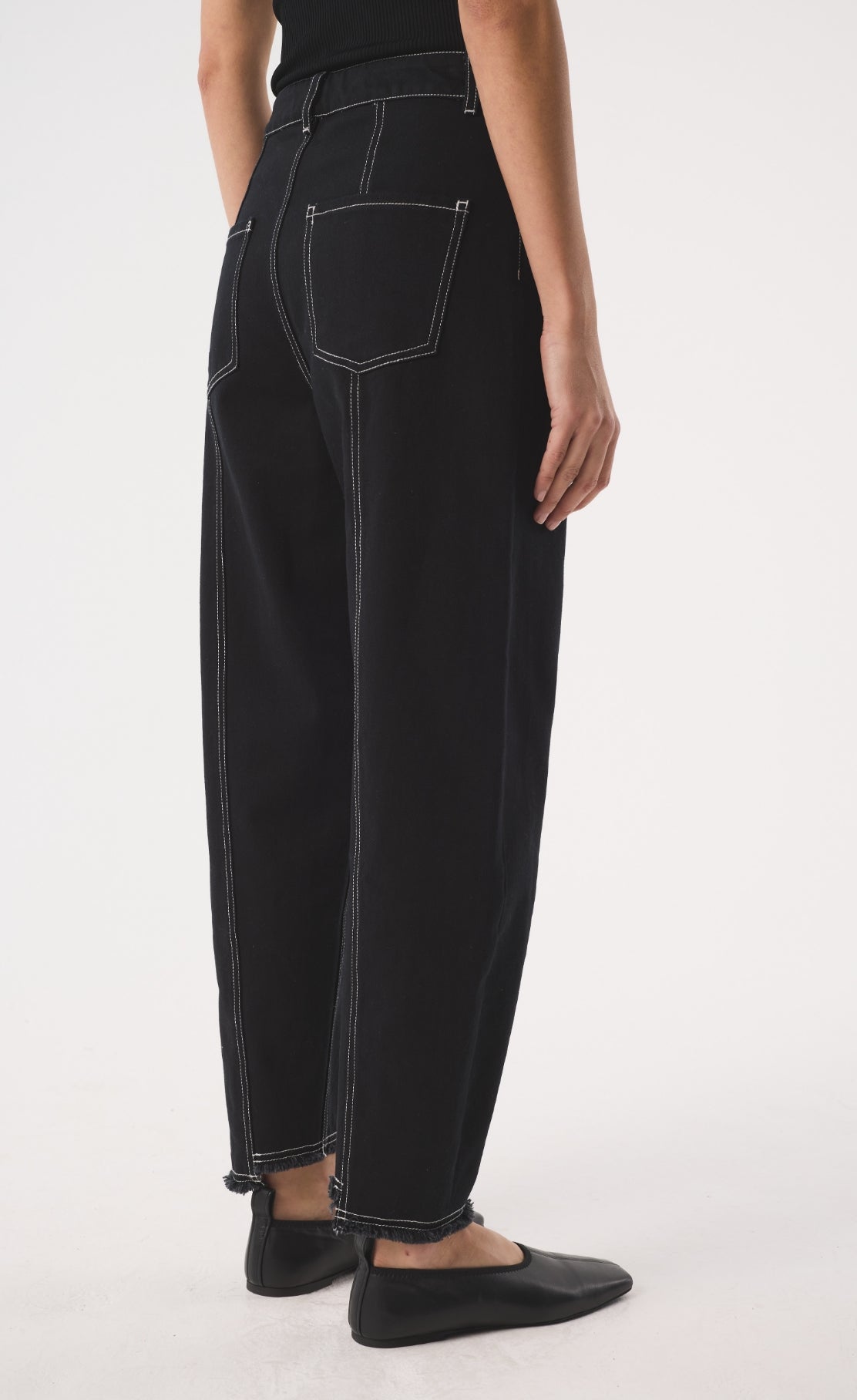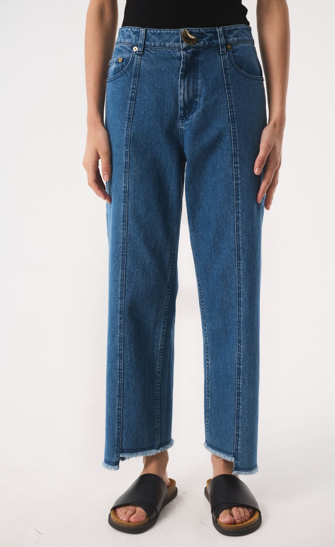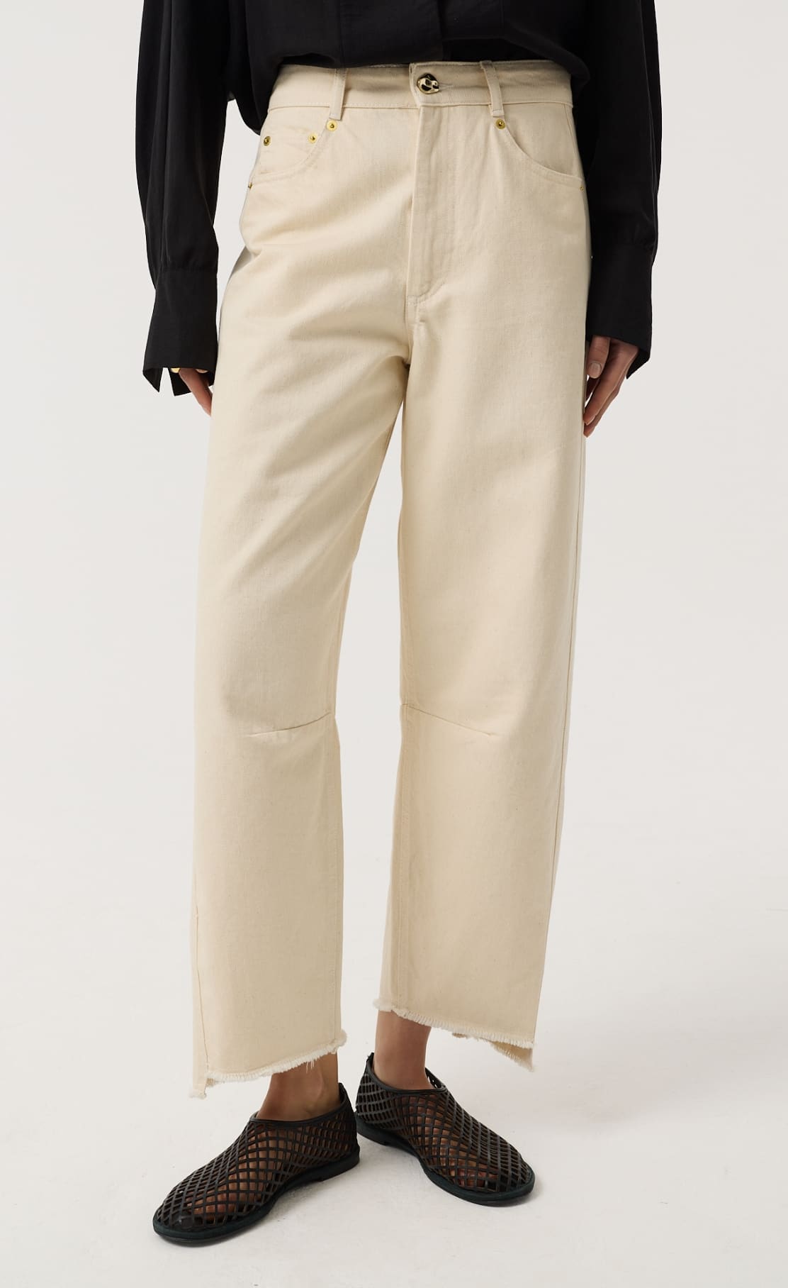 Our signature jean, Sol's distinctive silhouette is characterised by a slim barrel leg that gently tapers to a cropped, narrow asymmetric frayed hem at the ankle, creating a subtle curve that offers a modern, sculptural 'barrel' shape, Designed to be worn mid-rise on the waist, Sol is ideal for those seeking a modern, yet effortless style. Finished with our distinctive gold kidney hardware at the fly to bring elevation and distinction.