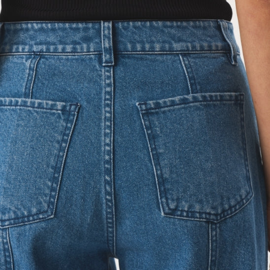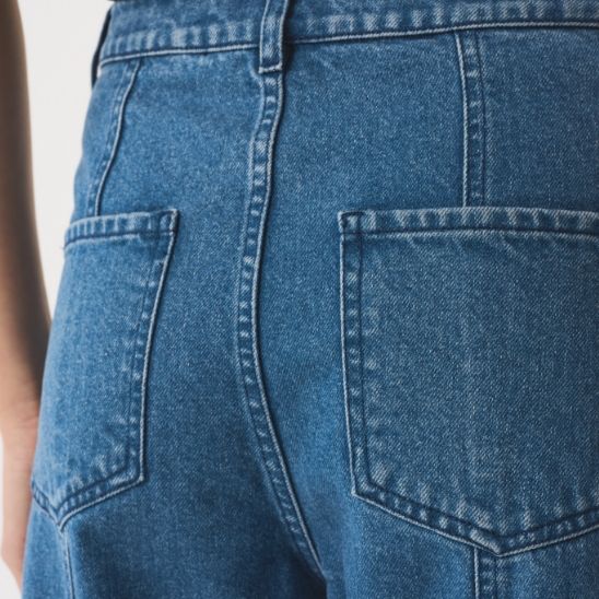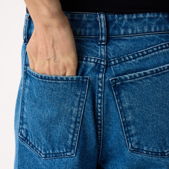 Our mid-wash blue denim is crafted from 100% certified recycled cotton, made from pre-and-post-consumer cotton waste. The mid-wash was achieved through the use of OZONE treatment, which uses approximately 50% less water than conventional methods while significantly reducing energy use, chemicals, enzymes, and abrasives.