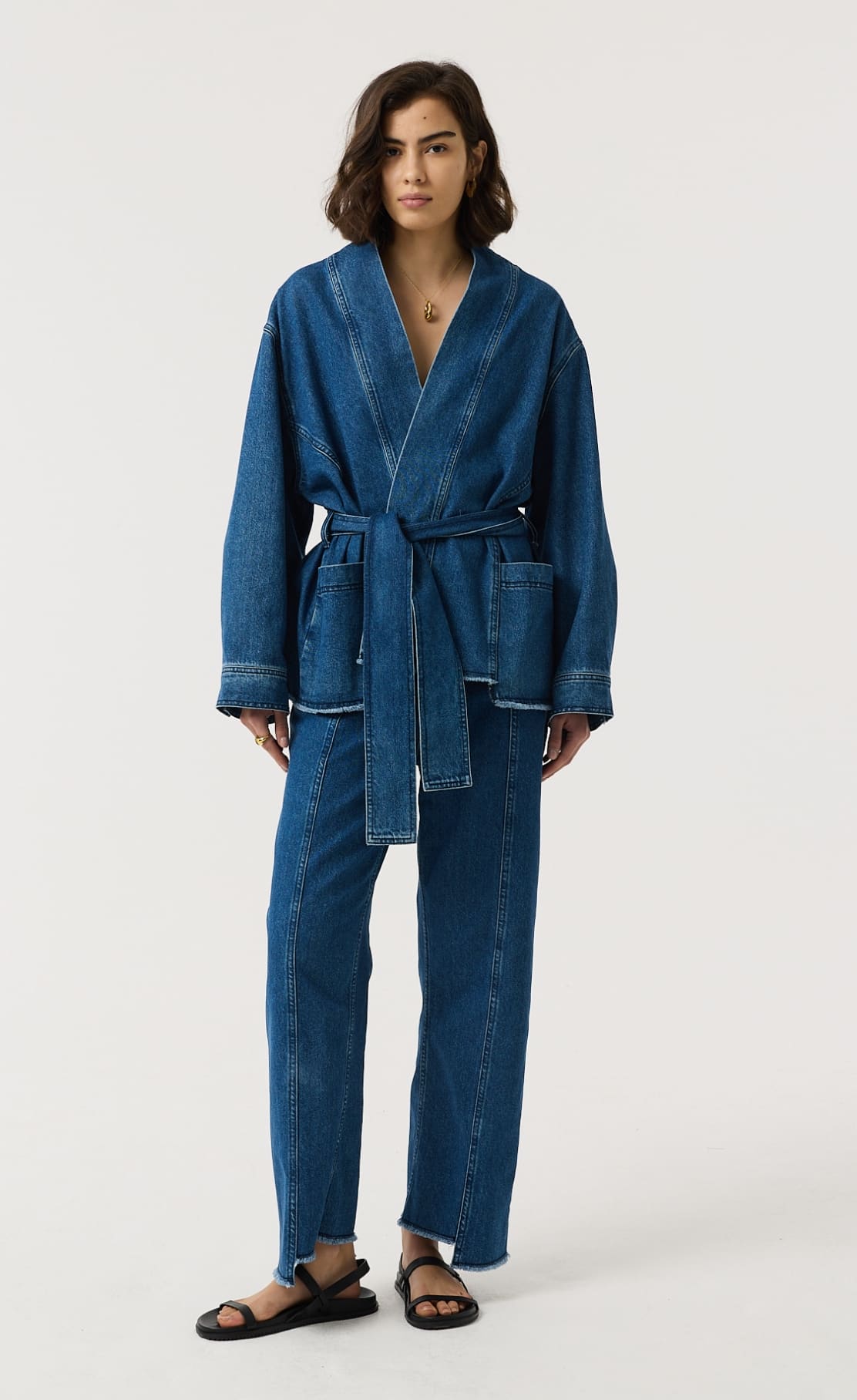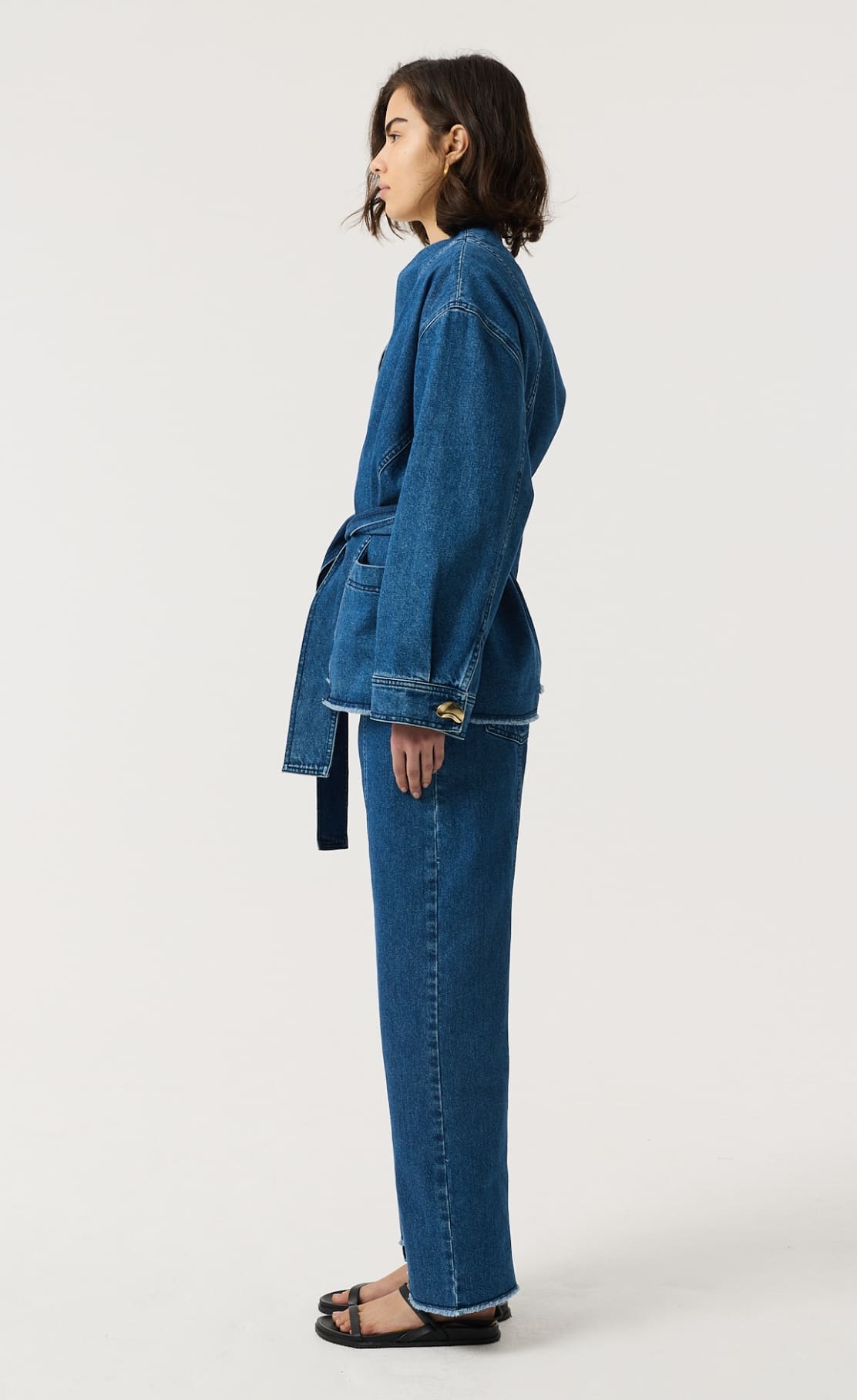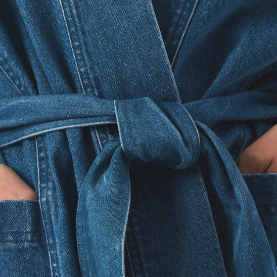 Anala is our kimono-style jacket in mid-wash blue recycled denim, designed with a soft wrap silhouette and tie belt for easy styling. Finished with our signature gold kidney buttons on the cuff for a modern, directional layer with a timeless feel.