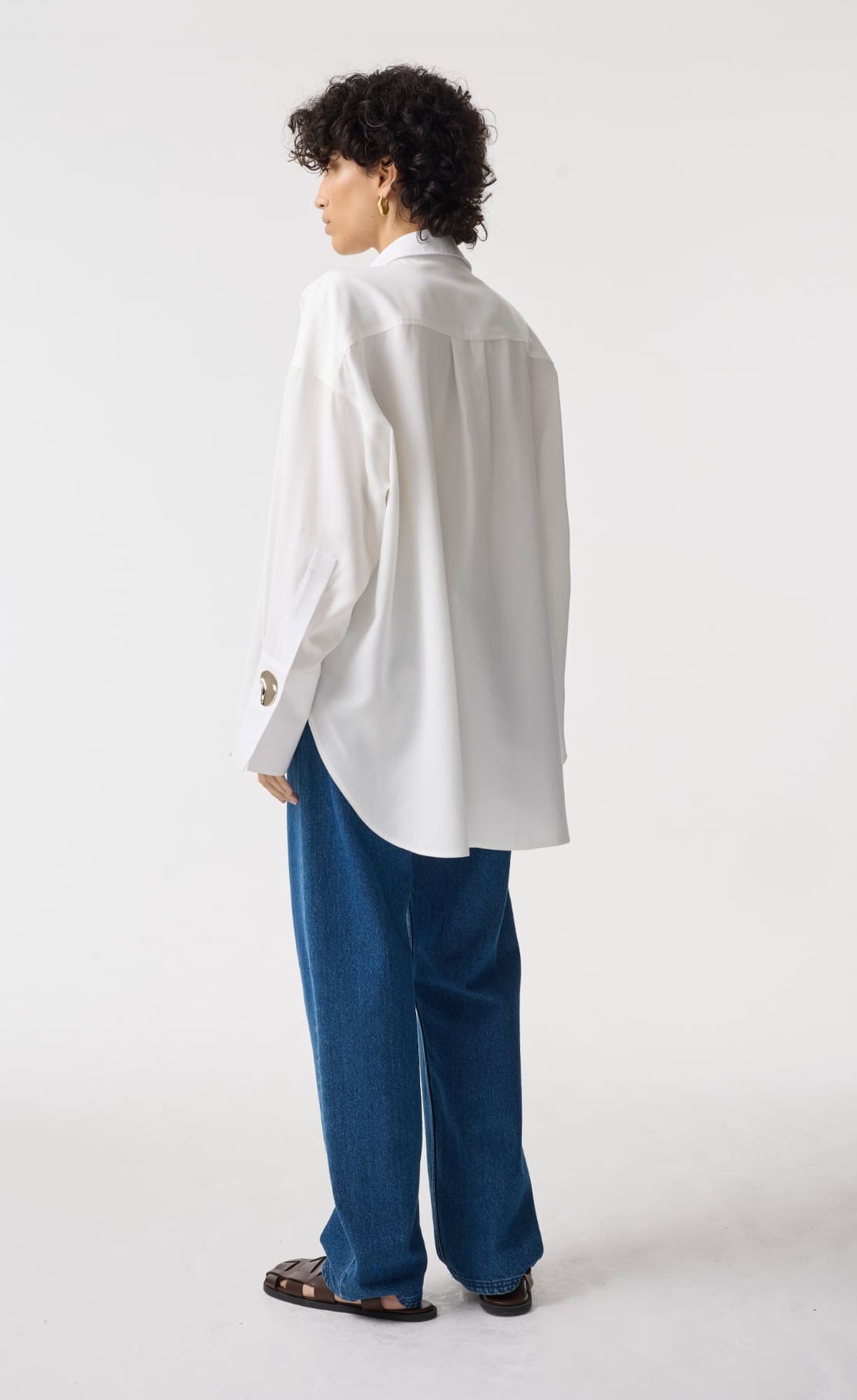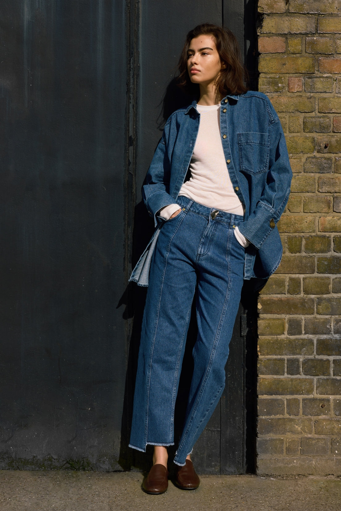 Fenella is our oversized denim shirt that can be worn alone or styled over layers as an overshirt. Available in a 100% recycled cotton mid-wash blue denim, or a 100% regenerative black cotton denim, both finished with our signature gold kidney button at the cuff, Fenella pairs perfectly with our denim jeans for a full double denim look.