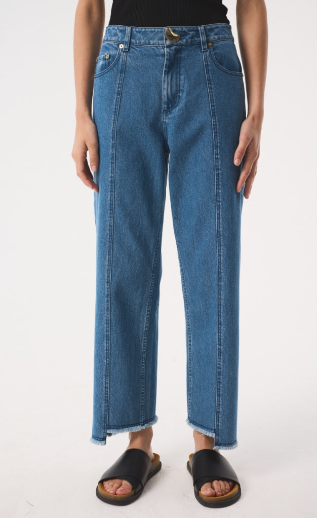 A reimagining of our signature jean, Sol Straight is a classic fit jean that sits on the waist, with a relaxed, straight leg that finishes in an asymmetric frayed hem, creating a longer, wider, straighter silhouette than our Sol Original. Finished with our distinctive gold kidney button hardware at the fly, Sol Straight is a year-round staple that pairs effortlessly with sandals or shoes in warmer months, and transitions seamlessly into winter styled with boots, flats or a heel for an elongated, flattering silhouette.