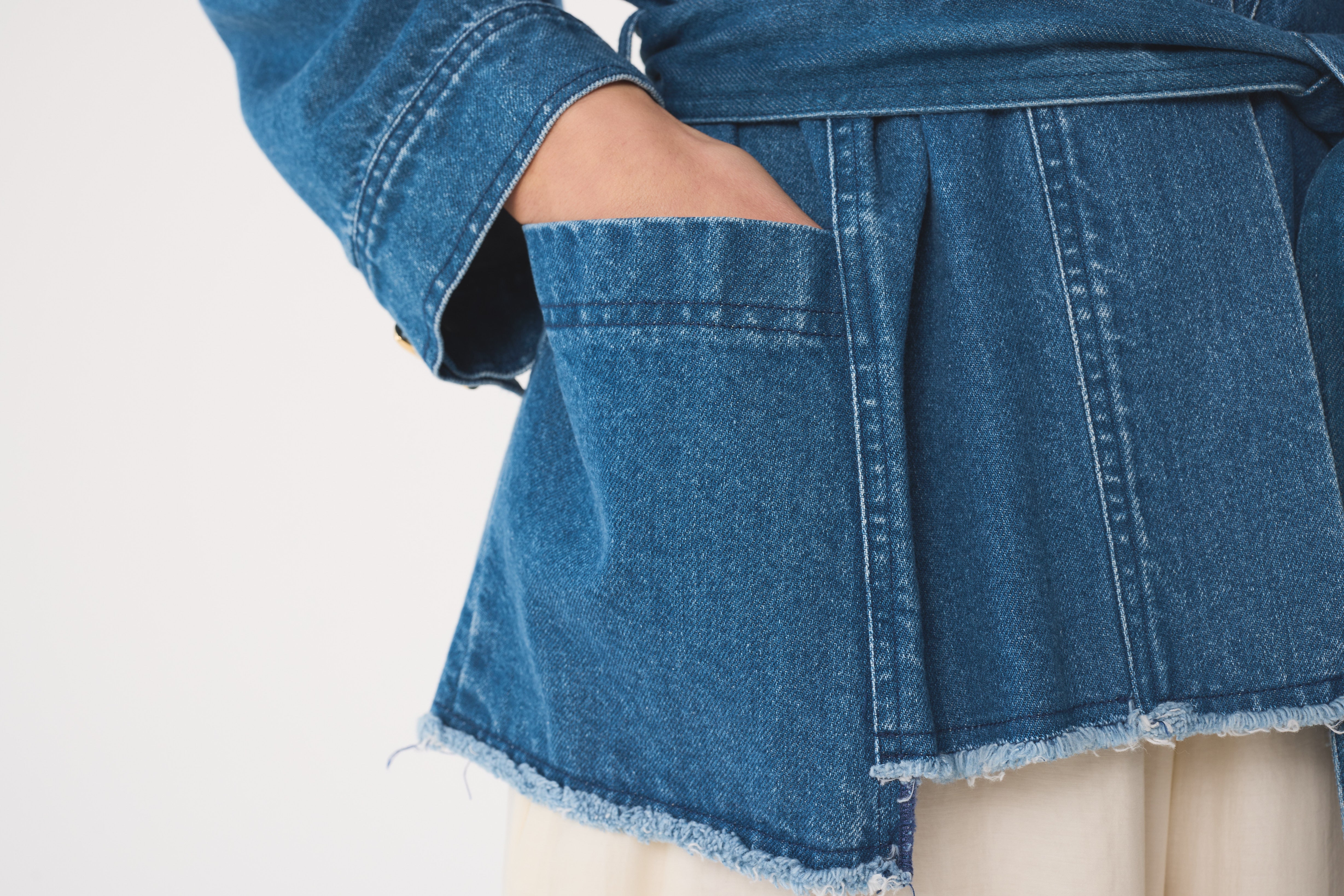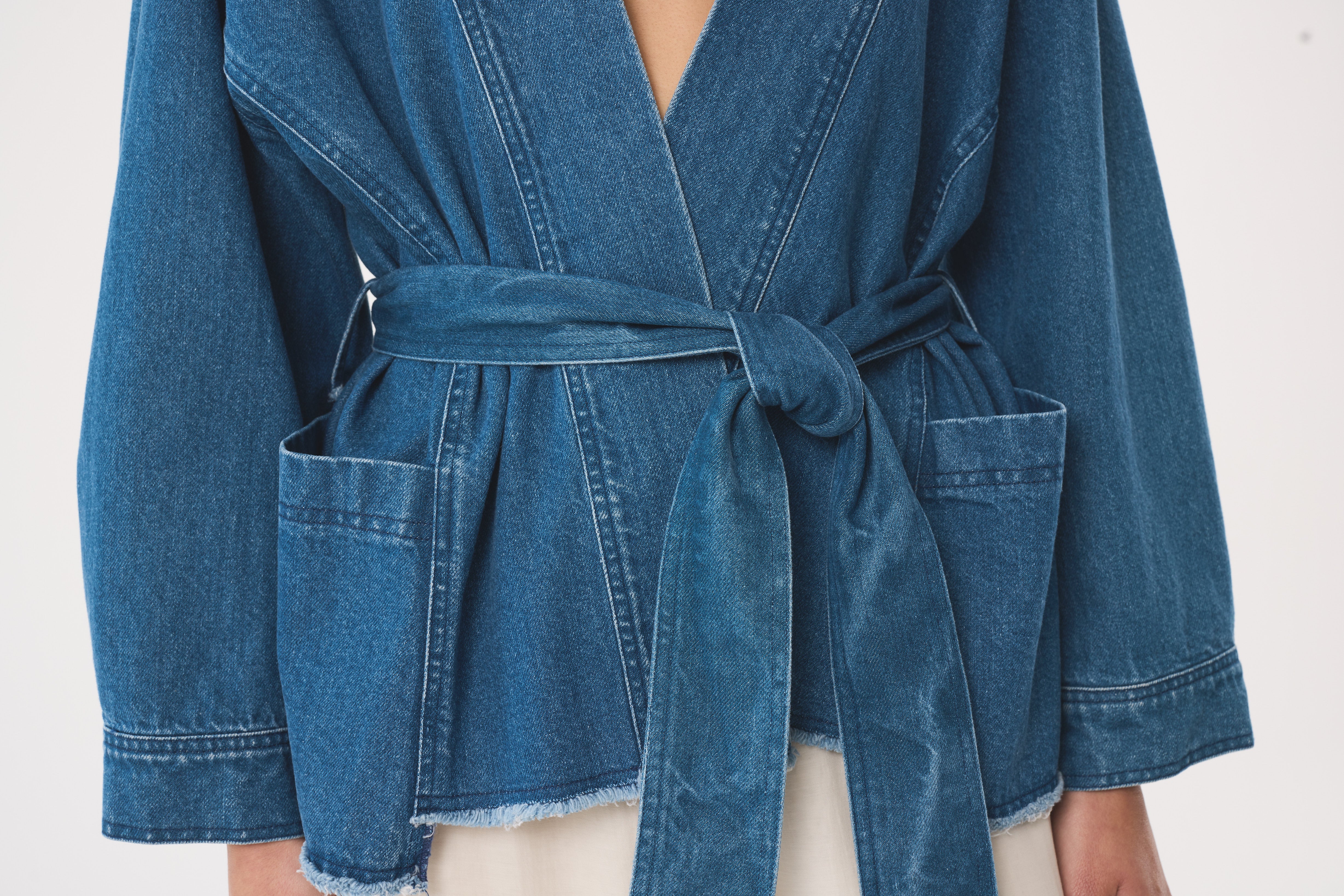 Anala is our kimono-style jacket in mid-wash blue recycled denim, designed with a soft wrap silhouette and tie belt for easy styling. Finished with our signature gold kidney buttons on the cuff for a modern, directional layer with a timeless feel.