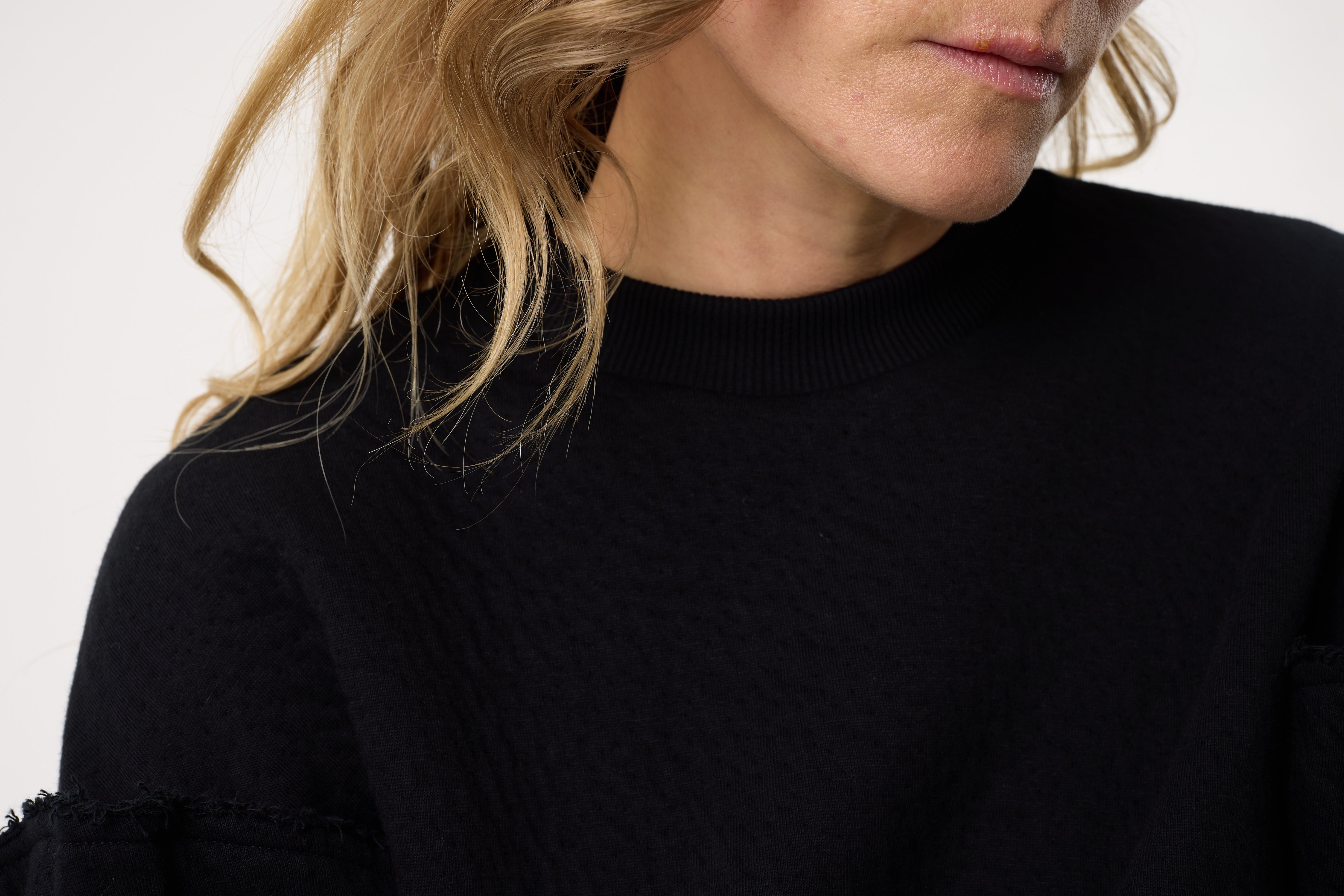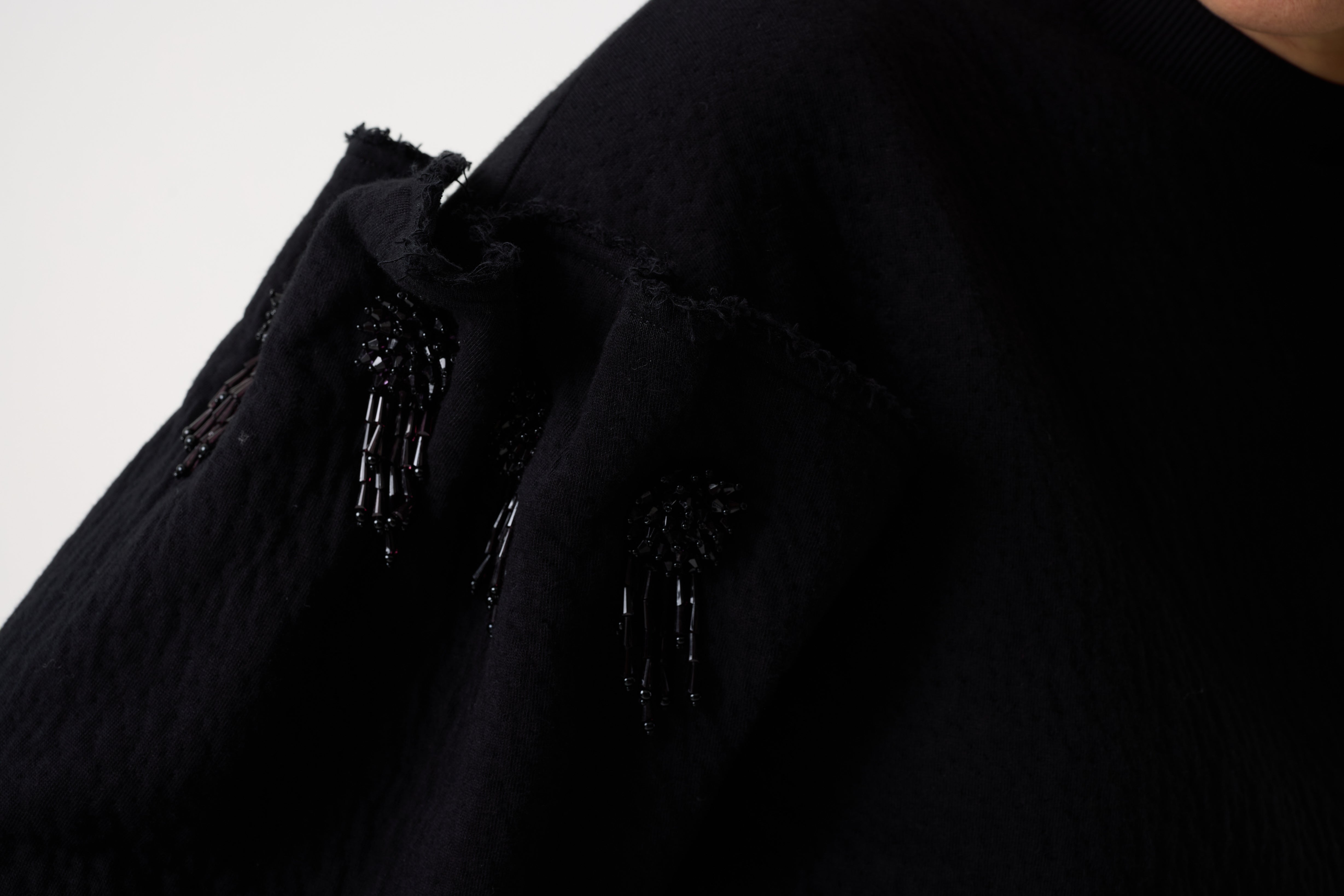 Aylin is a longer-line sweatshirt crafted from black interlock jacquard. Our iconic studded-shoulder detail has been reimagined with our bead cluster embellishment, elevating this casual winter staple for day to night dressing.
