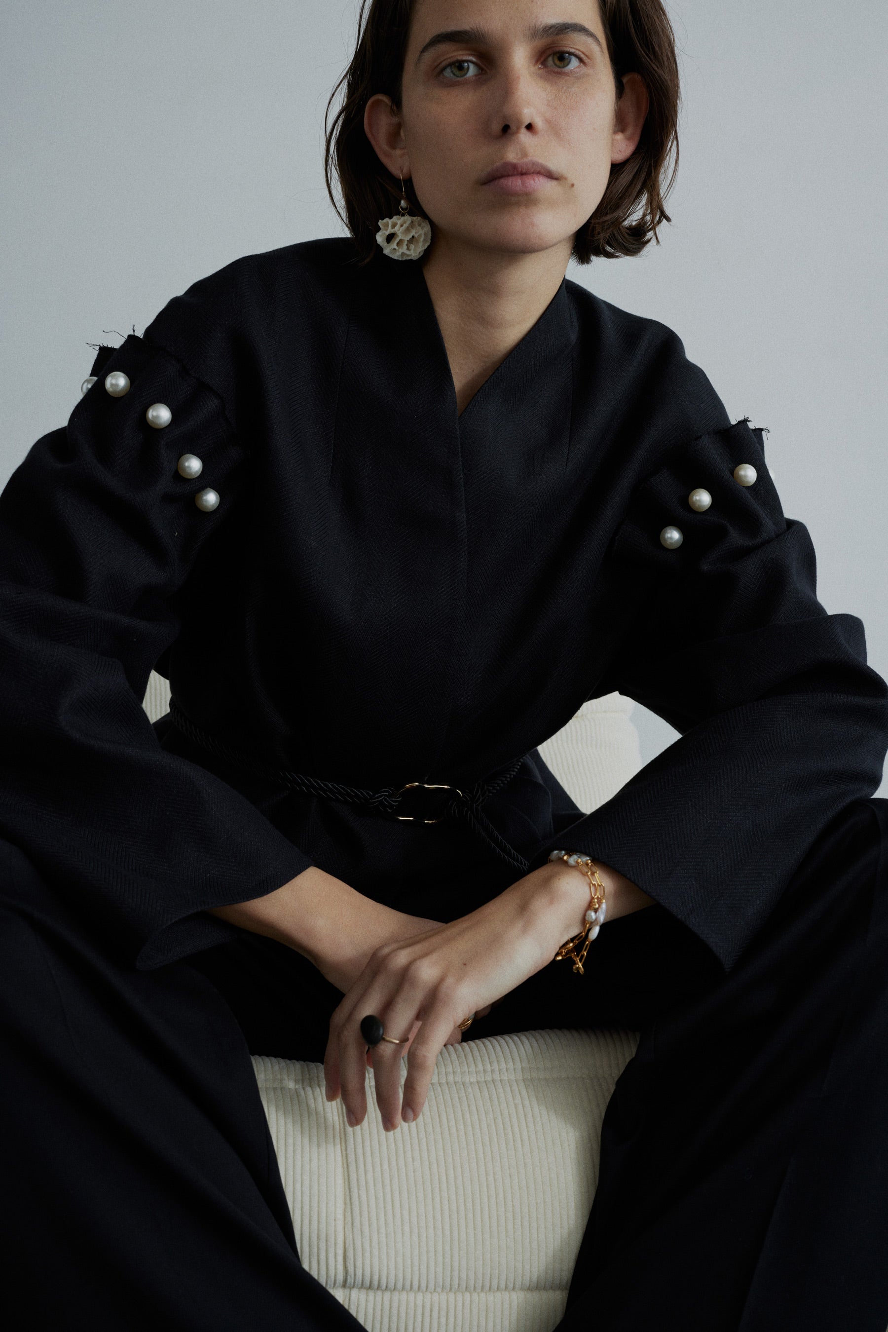 Our newest denim style has arrived. Blake is a wide barrel leg jean cut from a blend of undyed organic and recycled cotton in ecru. Designed with a mid-rise waist and a gently tapered leg, it finishes in a stepped, frayed hem that adds a subtle, deconstructed edge. A distinctive gold button brings a refined elevation to this everyday staple.