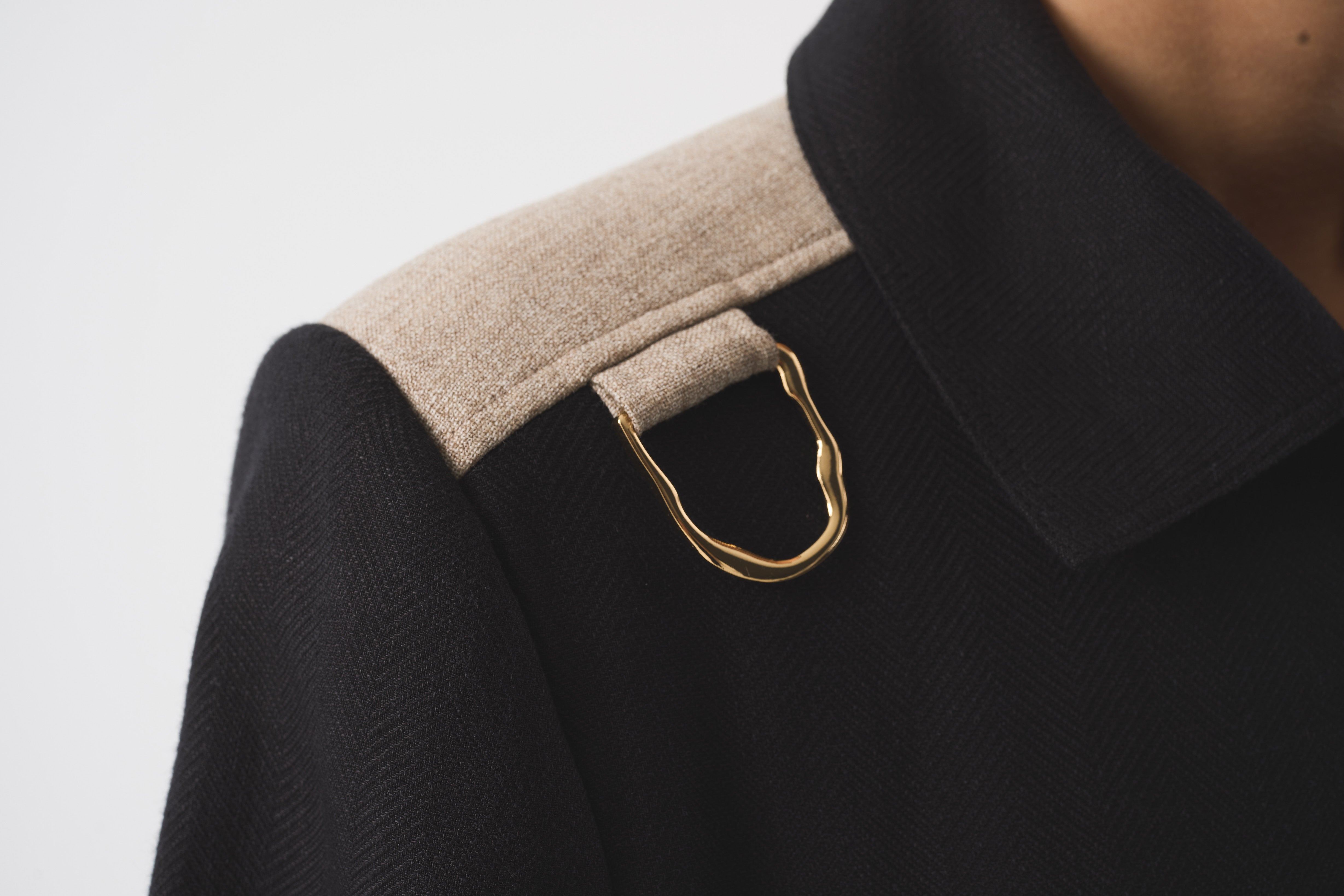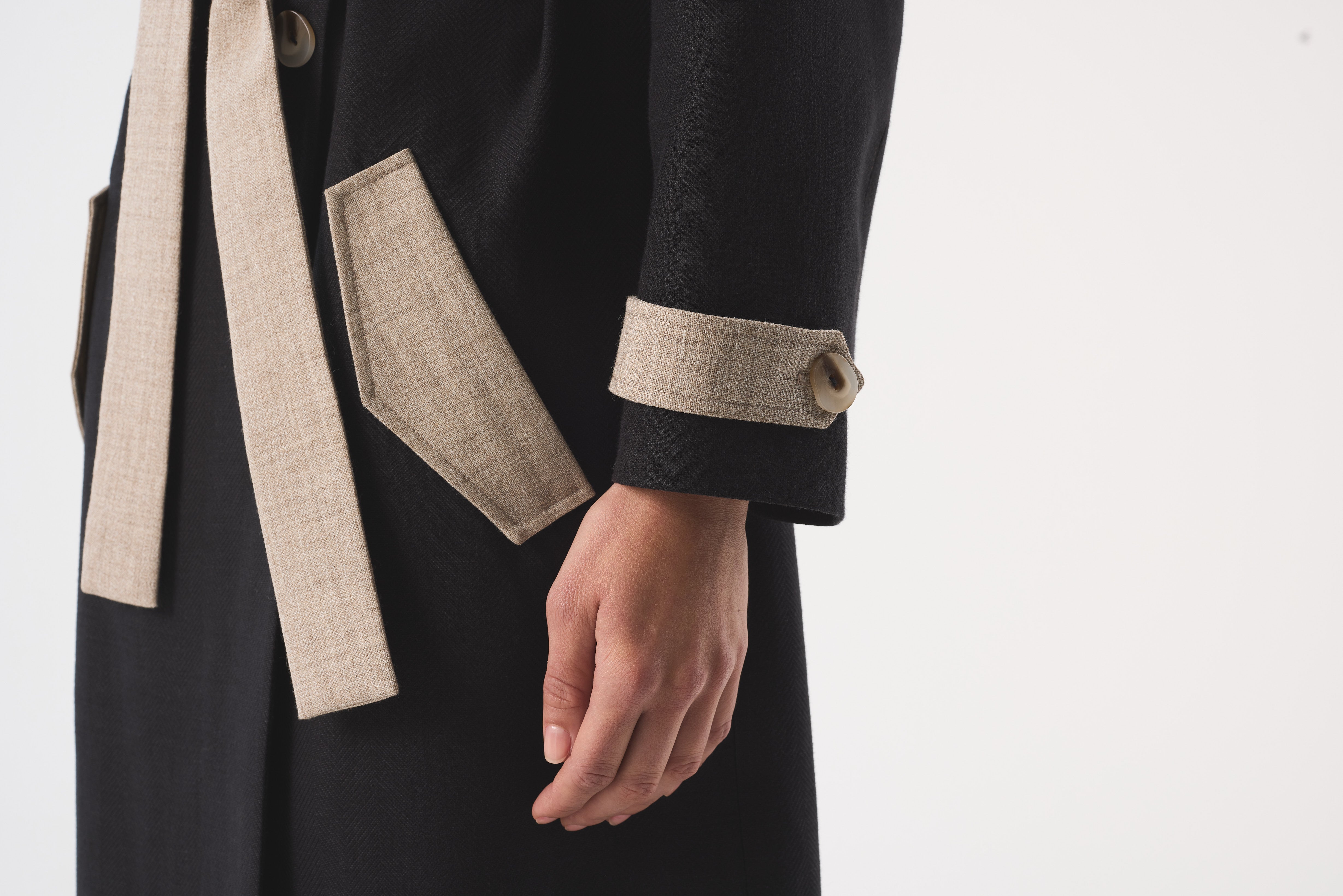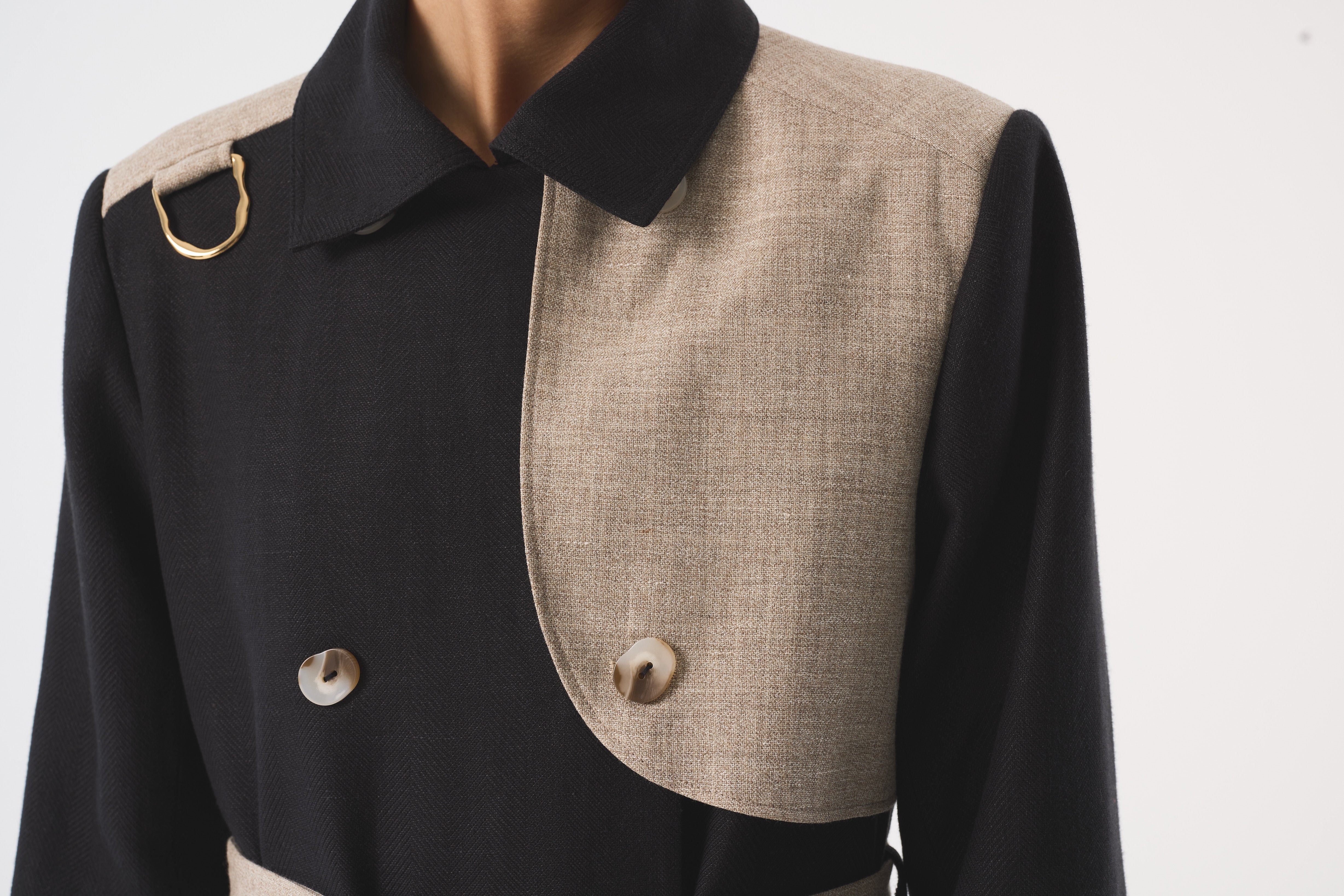 Chanah is our double breasted trench coat in black and grey undyed linen–wool–lyocell, finished with a gold D-ring, belt and a storm flap. Tailored with a strong shoulder and clean lines, it’s a timeless outer layer with a modern, minimal feel.