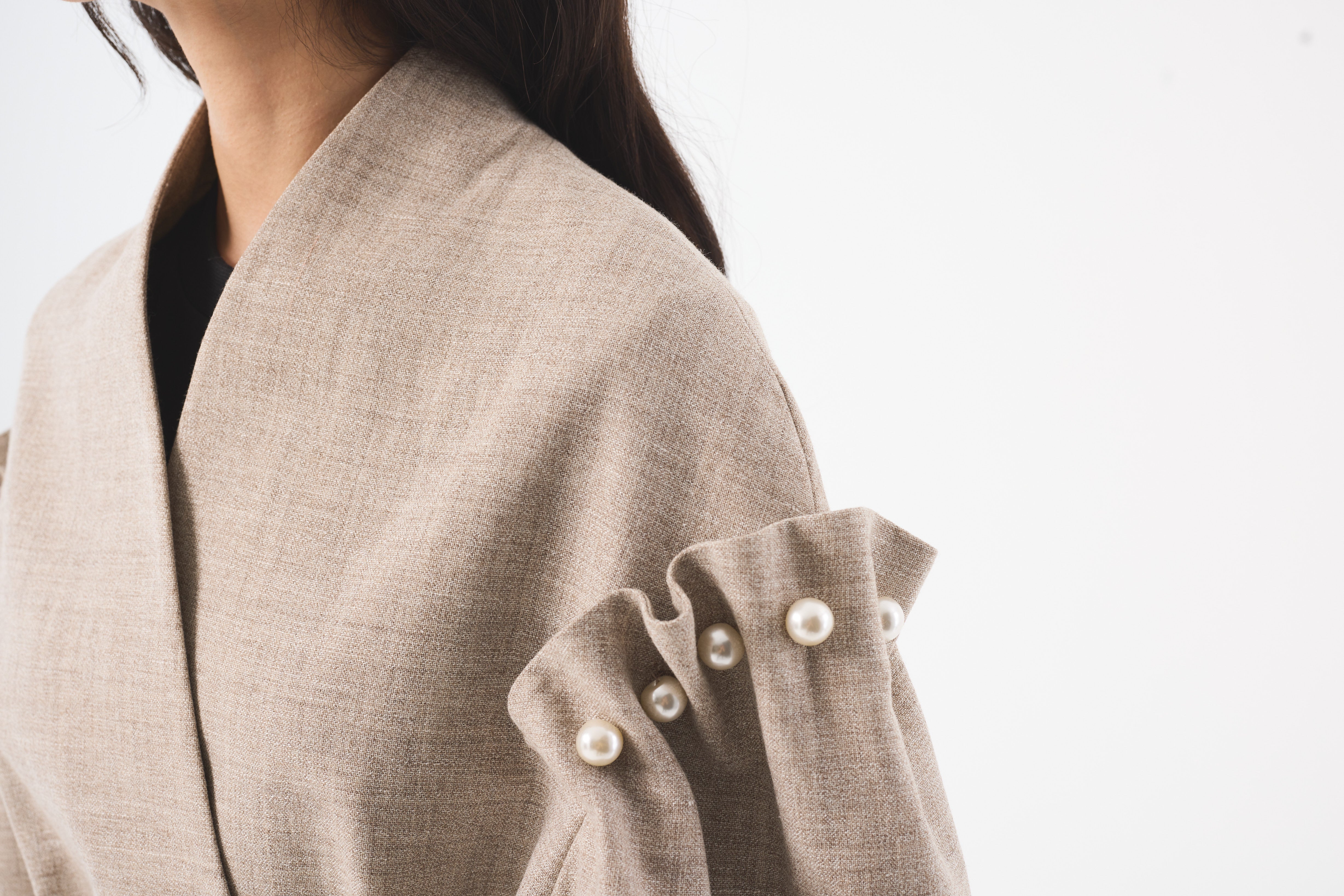 Dree is our light wrap coat in undyed grey wool linen blend, designed with a soft drape and effortless structure. Faux pearl buttons at the shoulder add a subtle point of detail, while the self-tie belt allows for flexible styling. A relaxed silhouette for easy layering through the seasons.
