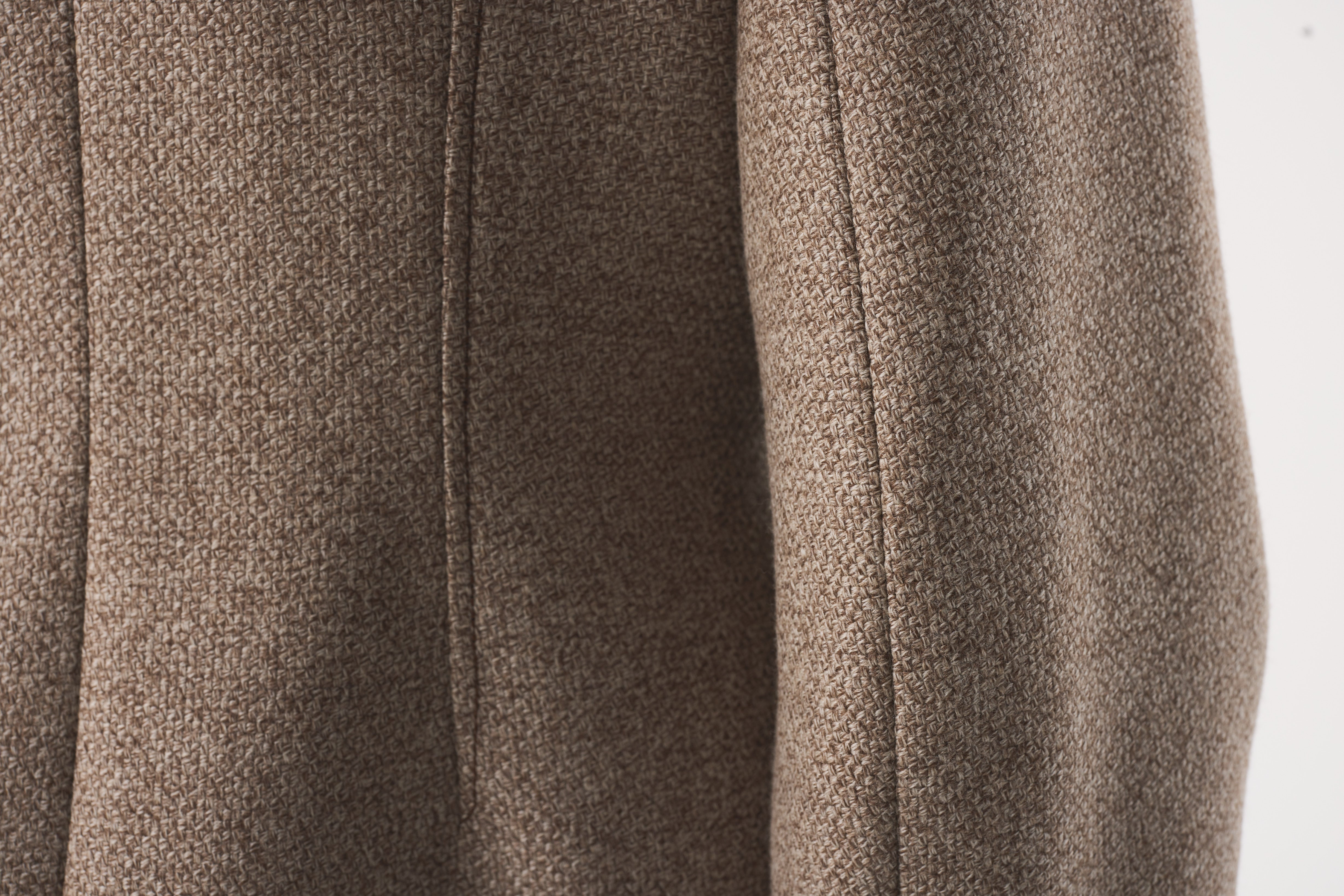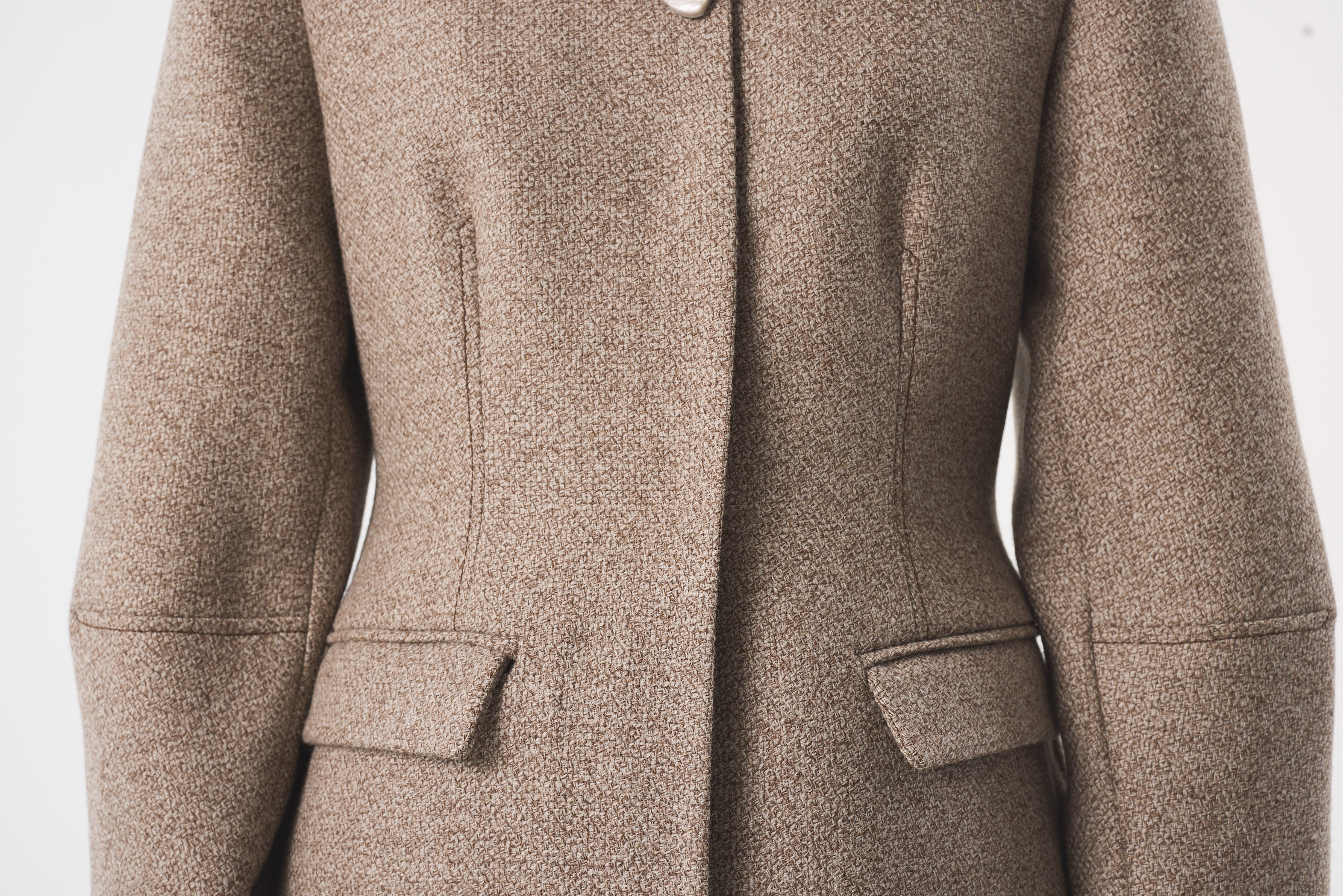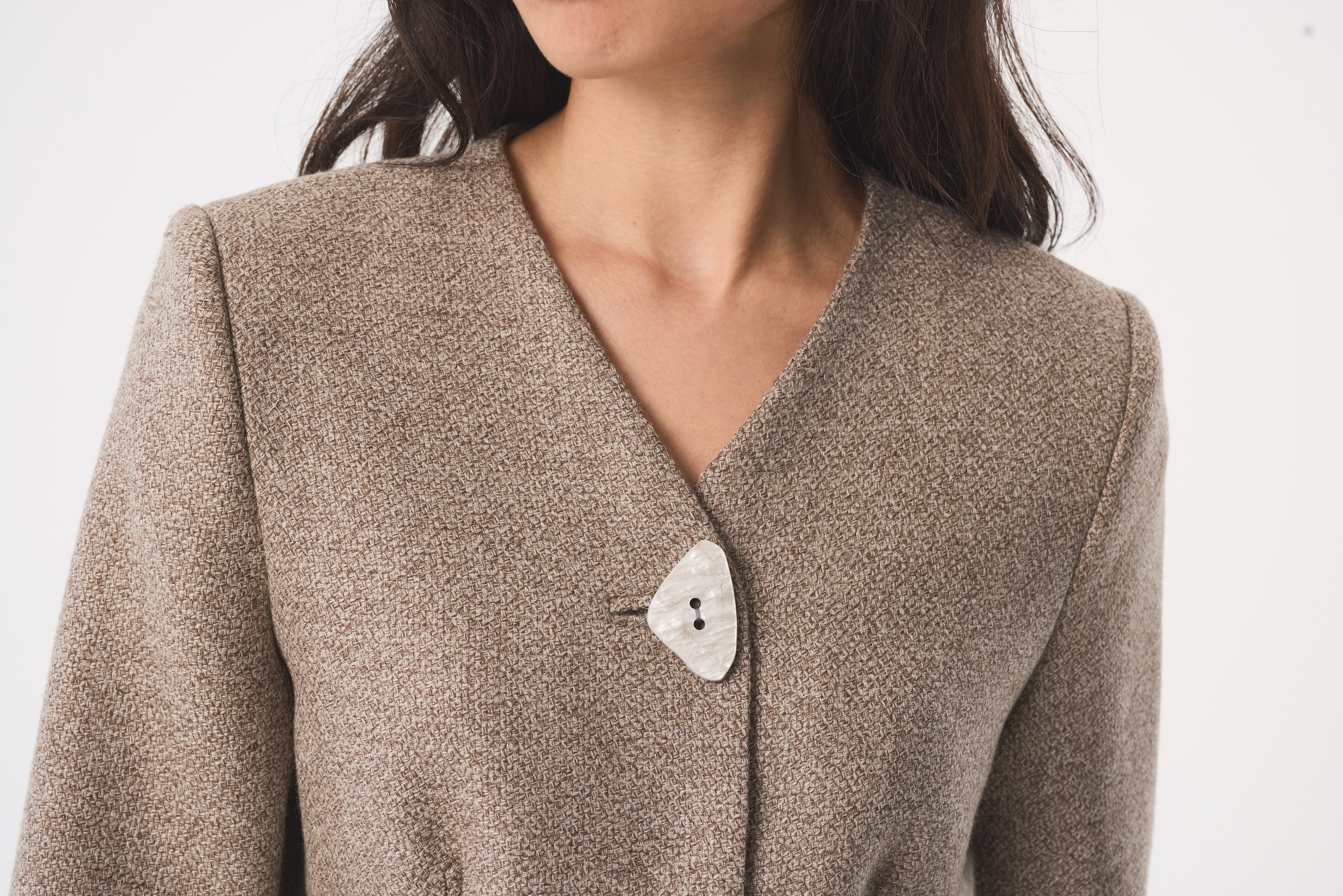 Elsie is our fitted jacket in undyed brown wool, tailored with a sculpted silhouette and sharp seam detailing through the sleeve. Finished with a single faux shell button at the neckline for a minimalist, elevated look.