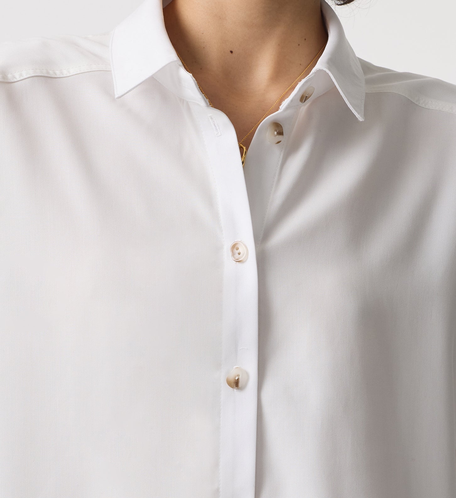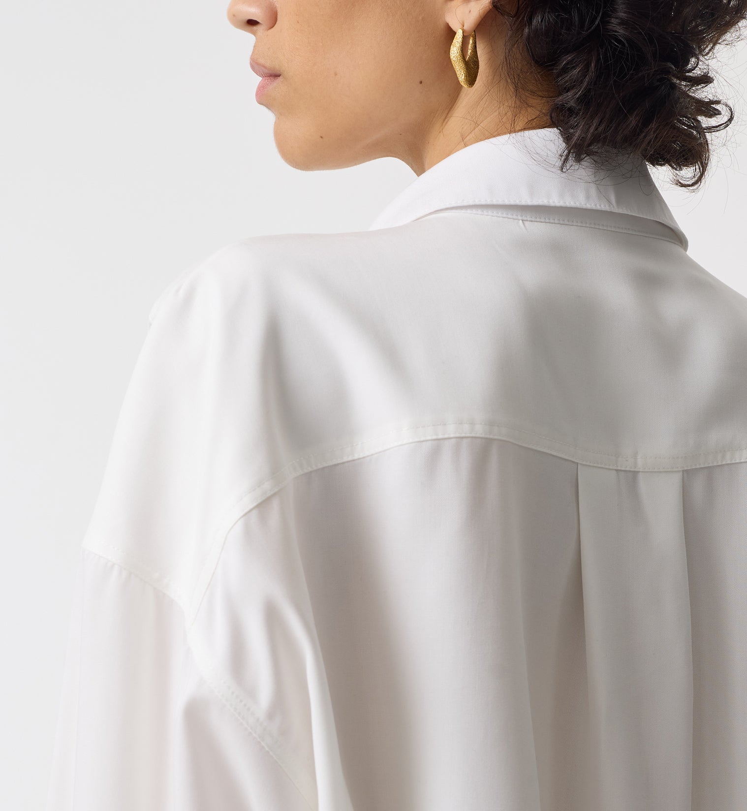 Fenella is an oversized shirt that can be worn alone or styled over layers as an overshirt. Crafted from a twill shirting fabric made from 100% TENCEL™ lyocell, and finished with our signature gold kidney button on the cuff, our Fenella white shirt is a wardrobe staple that can transfer effortlessly from work to weekend.