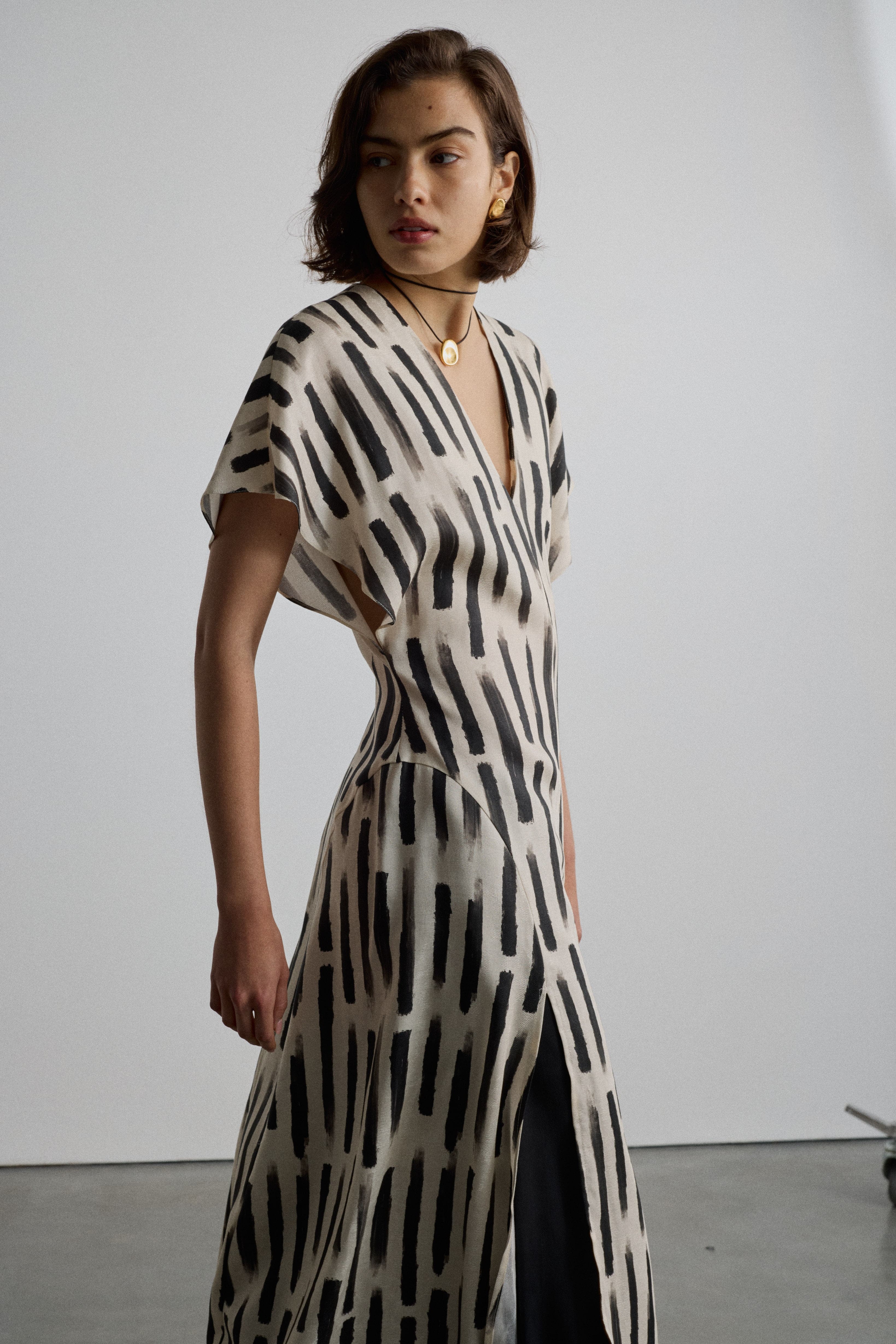 Hollie is a flowy summer dress, designed with a low V-neck, two high splits at the front and fluted short sleeves. Falling fluidly in a midaxi A-line skirt, Hollie is the perfect elevated dress for summer event season, crafted in monochrome painted brush-stroke printed TENCEL™ jacquard. Effortlessly takes you from weddings to warm-weather holidays.