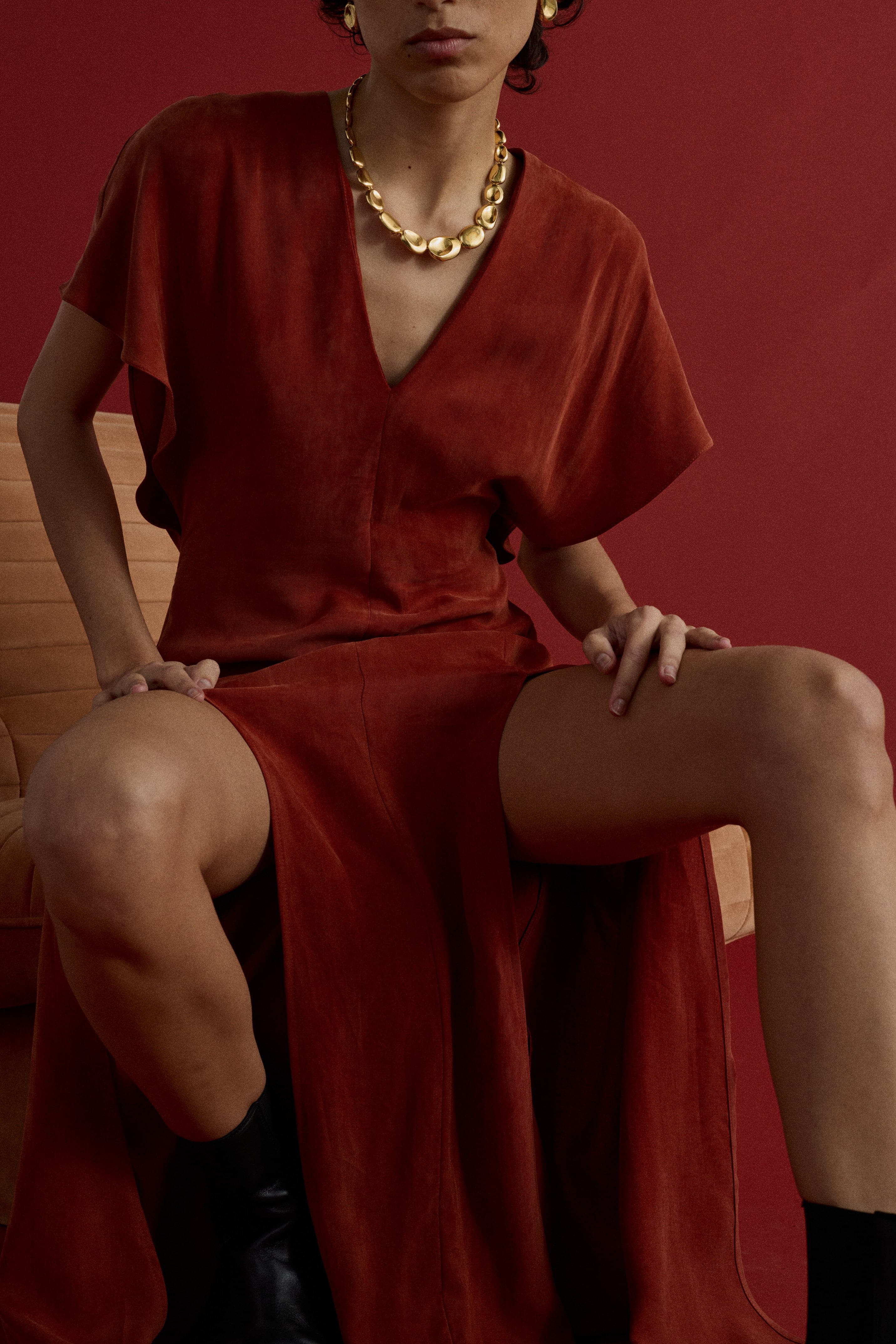 Hollie is a flowy summer dress, designed with a low V-neck, two high splits at the front and fluted short sleeves. Falling fluidly in a midaxi A-line skirt, Hollie is the perfect elevated dress for summer event season, crafted in terracotta TENCEL™ Lyocell Luxe. Effortlessly takes you from weddings to warm-weather holidays.