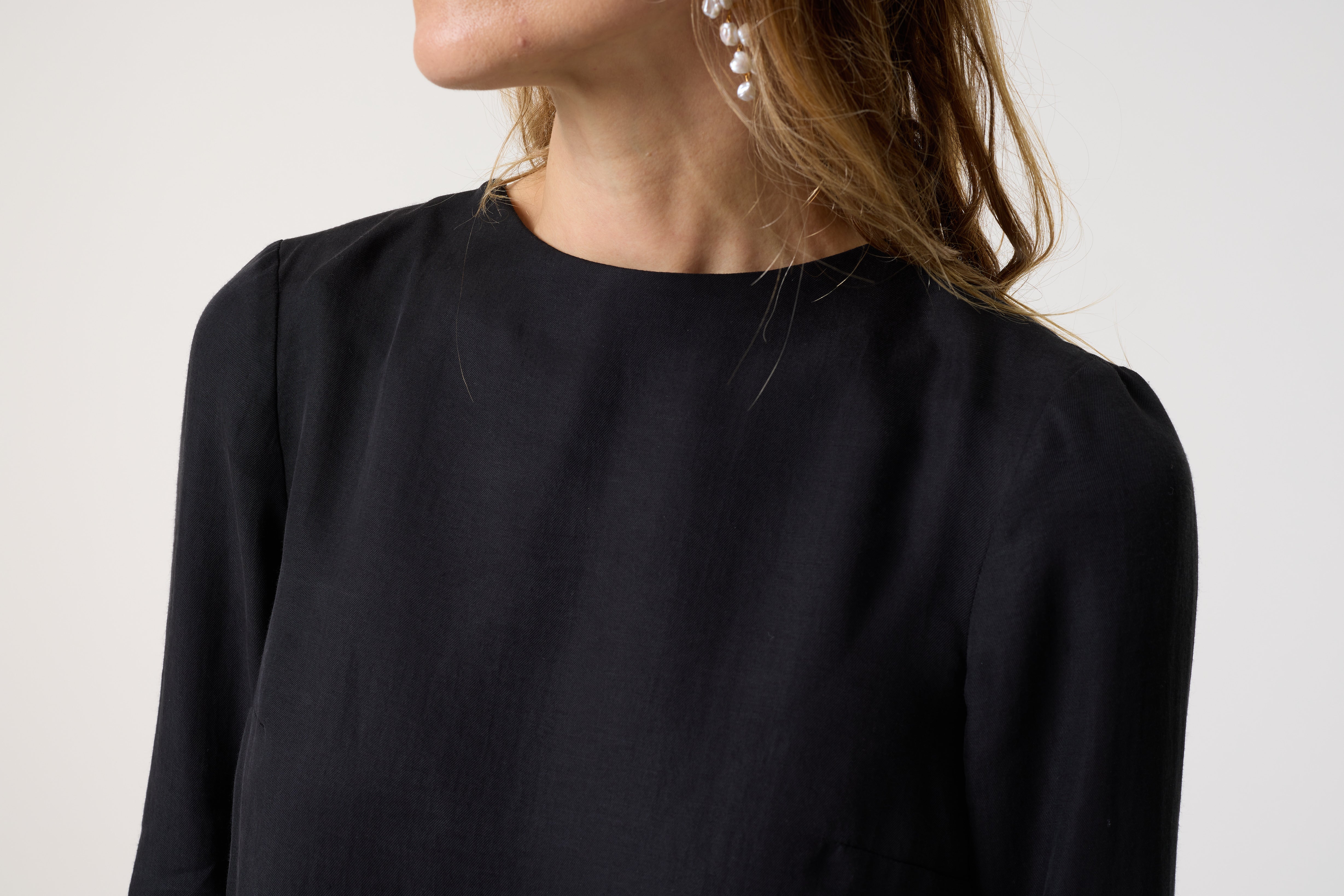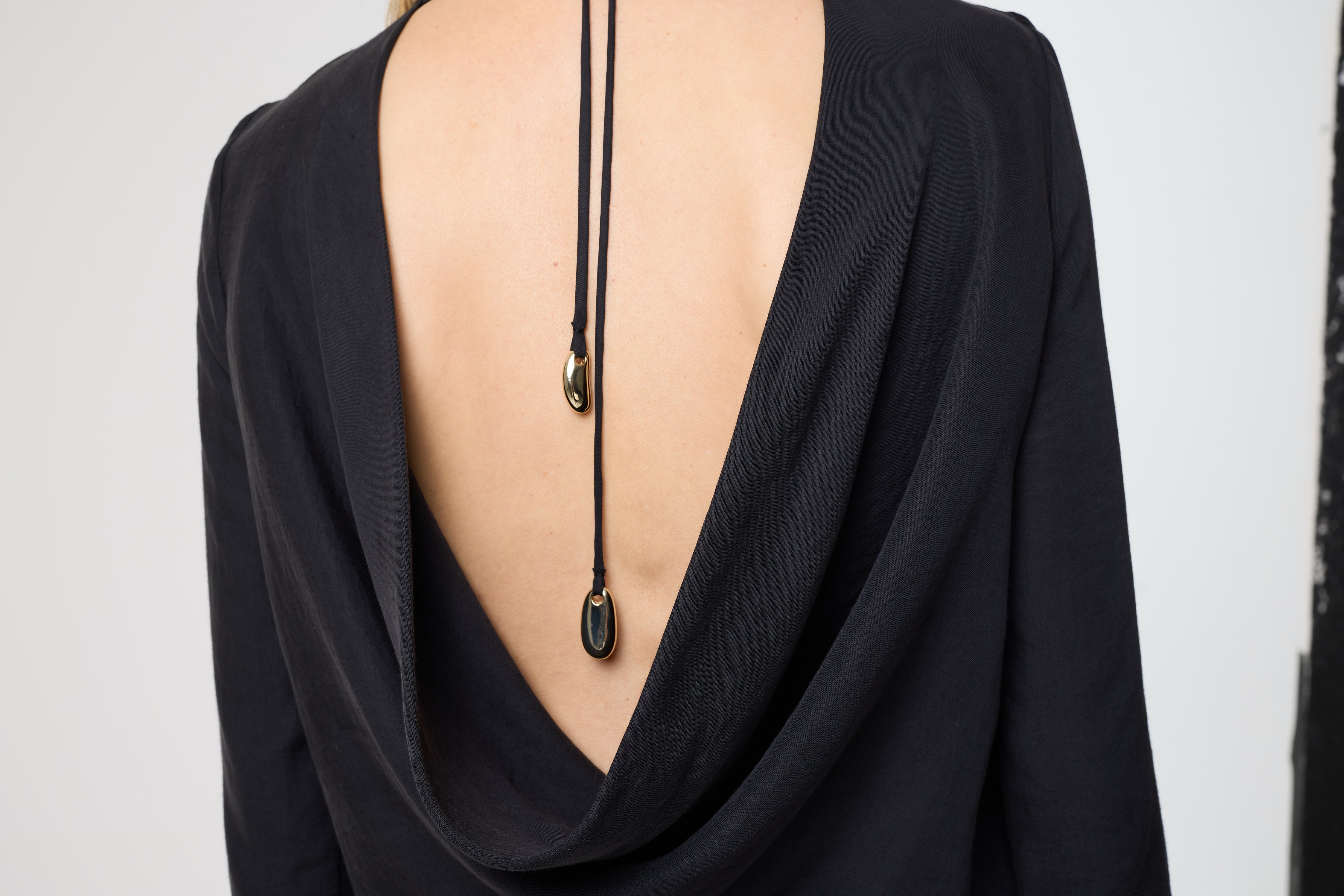 Lea is our effortlessly elegant long-sleeve black top crafted from soft satin TENCEL™ Luxe. Cut with a fluid draped cowl back that falls gracefully from the shoulders, it’s finished with brass pebble jewellery that adds a subtle, refined detail. Designed for a relaxed yet sophisticated fit that moves with ease, Lea is perfect for the party season.