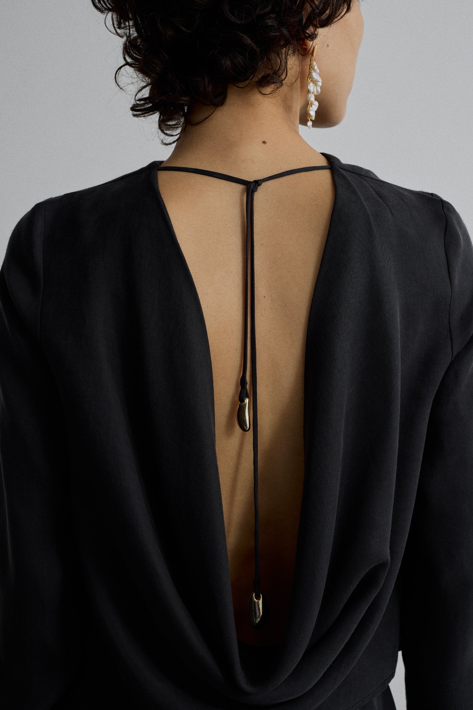 Lea is our effortlessly elegant long-sleeve black top crafted from soft satin TENCEL™ Luxe. Cut with a fluid draped cowl back that falls gracefully from the shoulders, it’s finished with brass pebble jewellery that adds a subtle, refined detail. Designed for a relaxed yet sophisticated fit that moves with ease, Lea is perfect for the party season.
