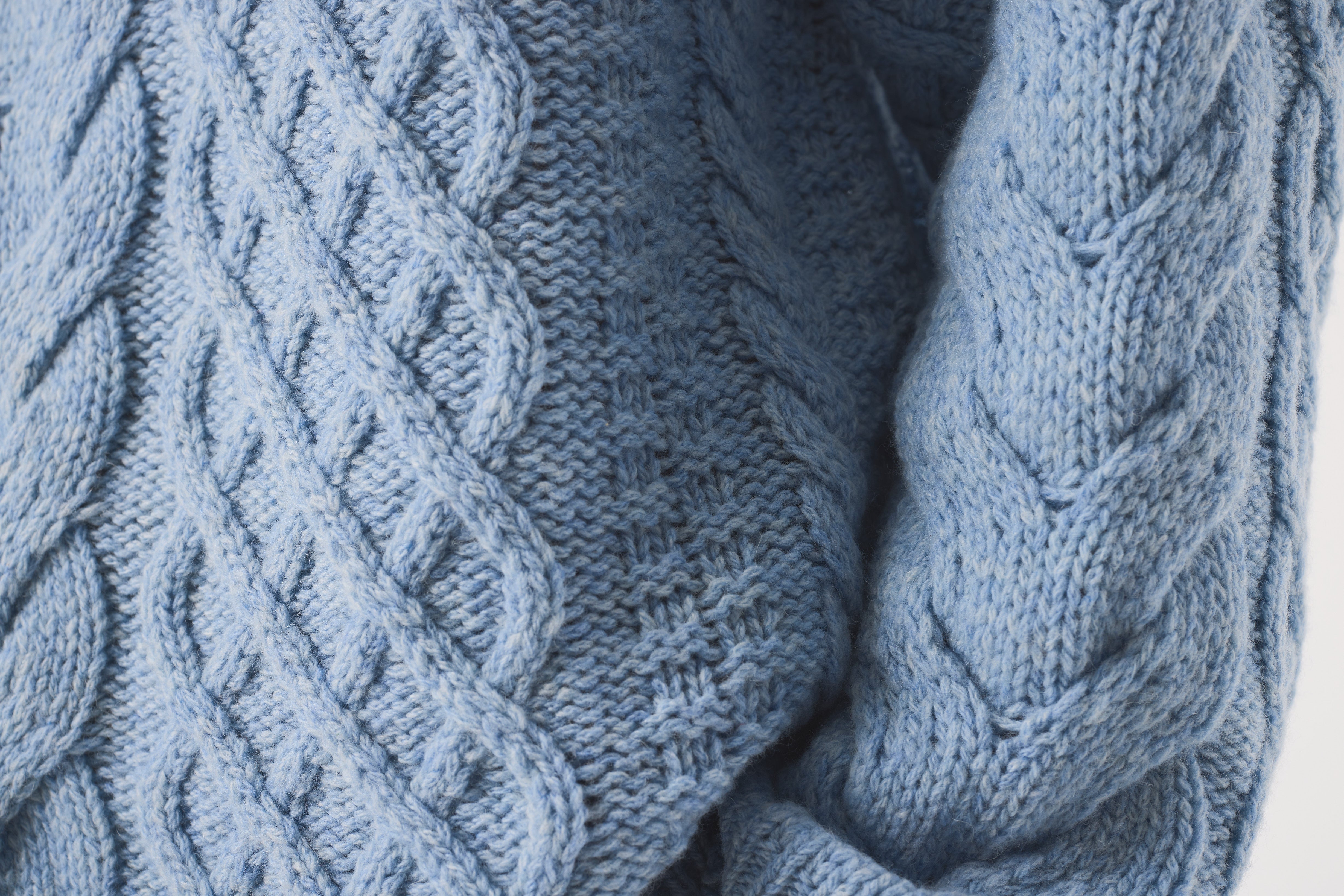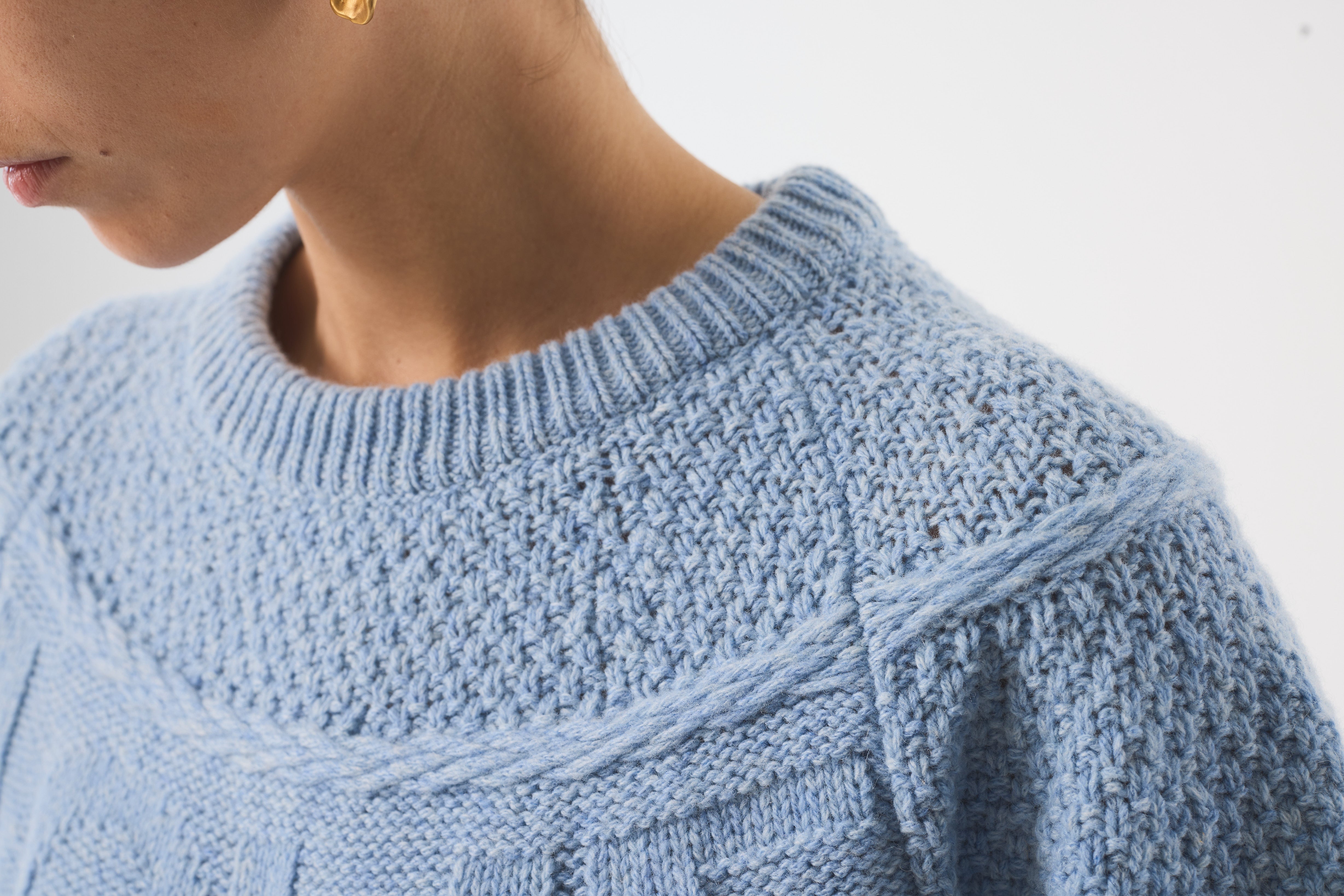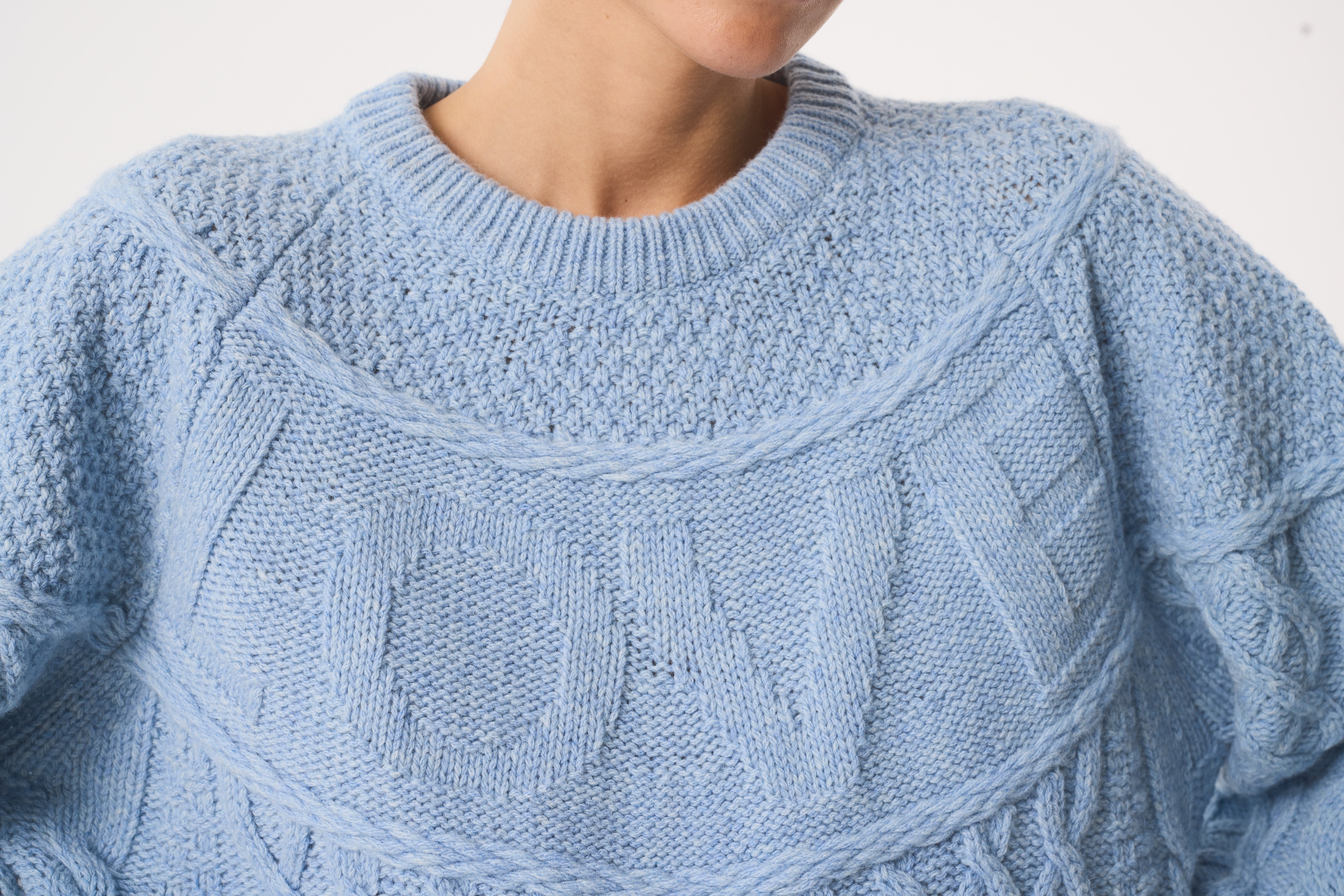 Love is our oversized jumper in blue marl, cable-knit with the ‘LOVE’ logo. Crafted in a soft RWS-certified merino wool and recycled nylon blend, it’s a cosy statement piece with heart.