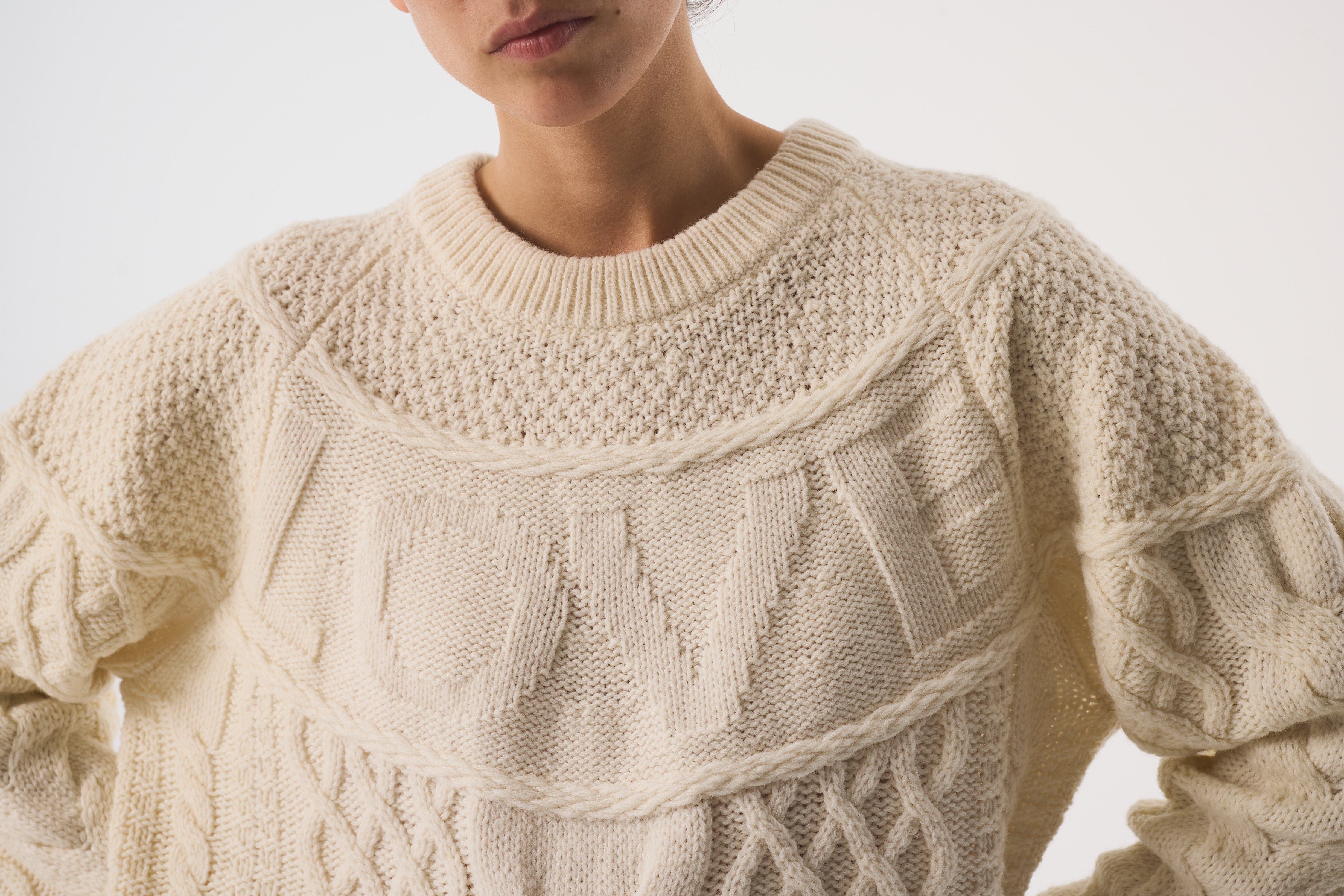 Love is our oversized jumper in ivory, cable-knit with the ‘LOVE’ logo. Crafted in a soft RWS-certified merino wool and recycled nylon blend, it’s a cosy statement piece with heart.