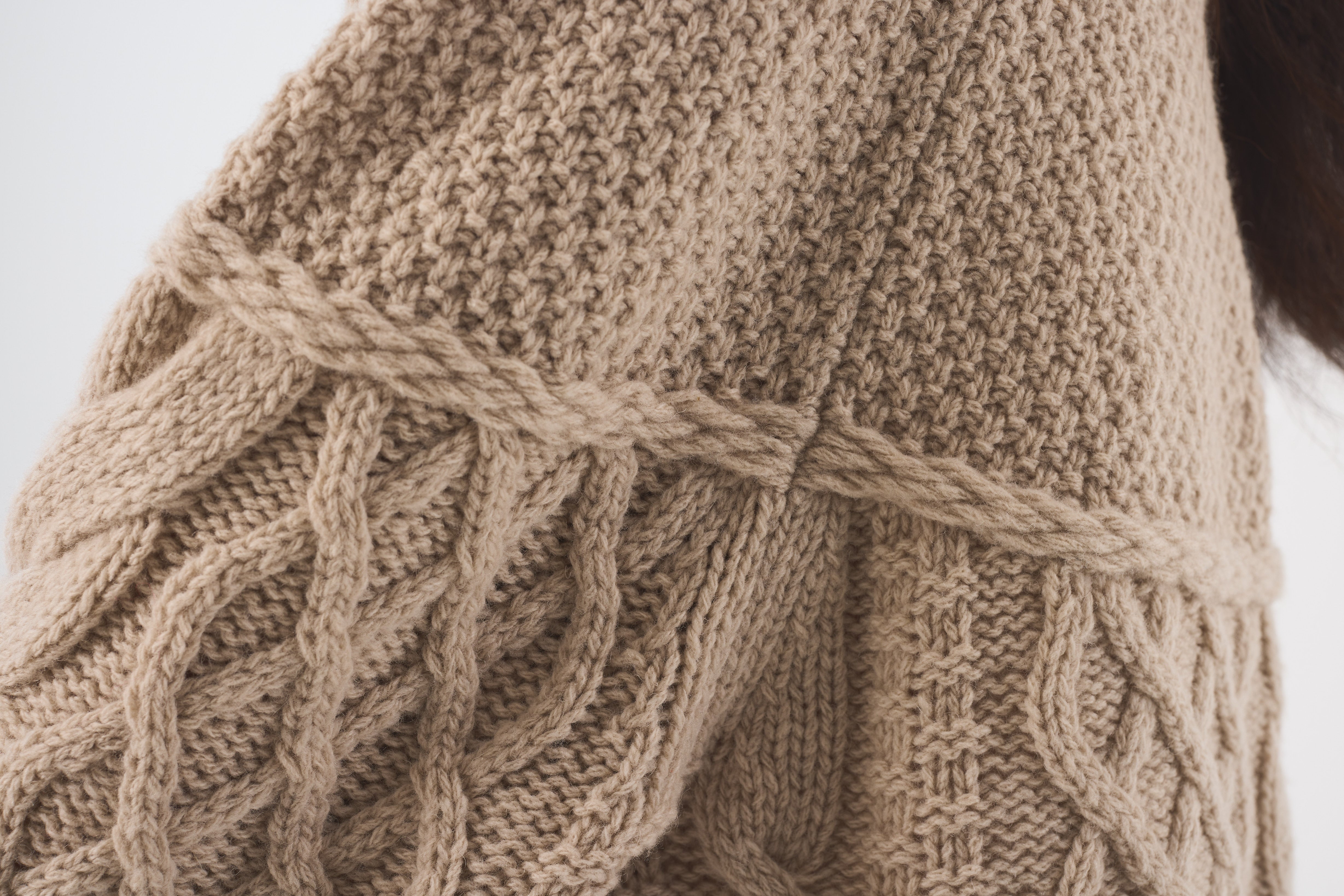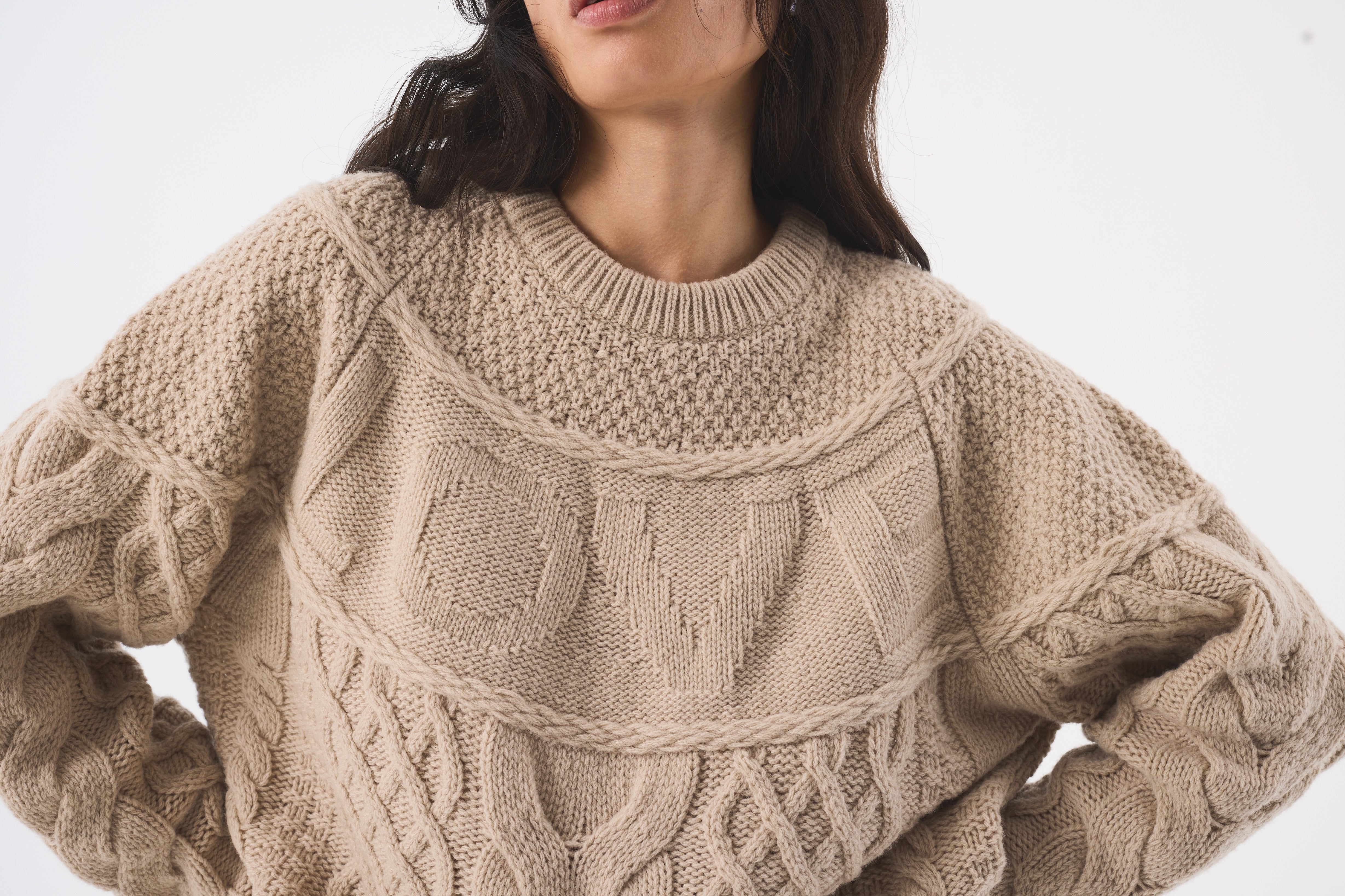 Love is our oversized jumper in oyster, cable-knit with the word ‘LOVE’ across the front. Crafted in a soft RWS-certified merino wool and recycled nylon blend, it’s a cosy statement piece with heart.