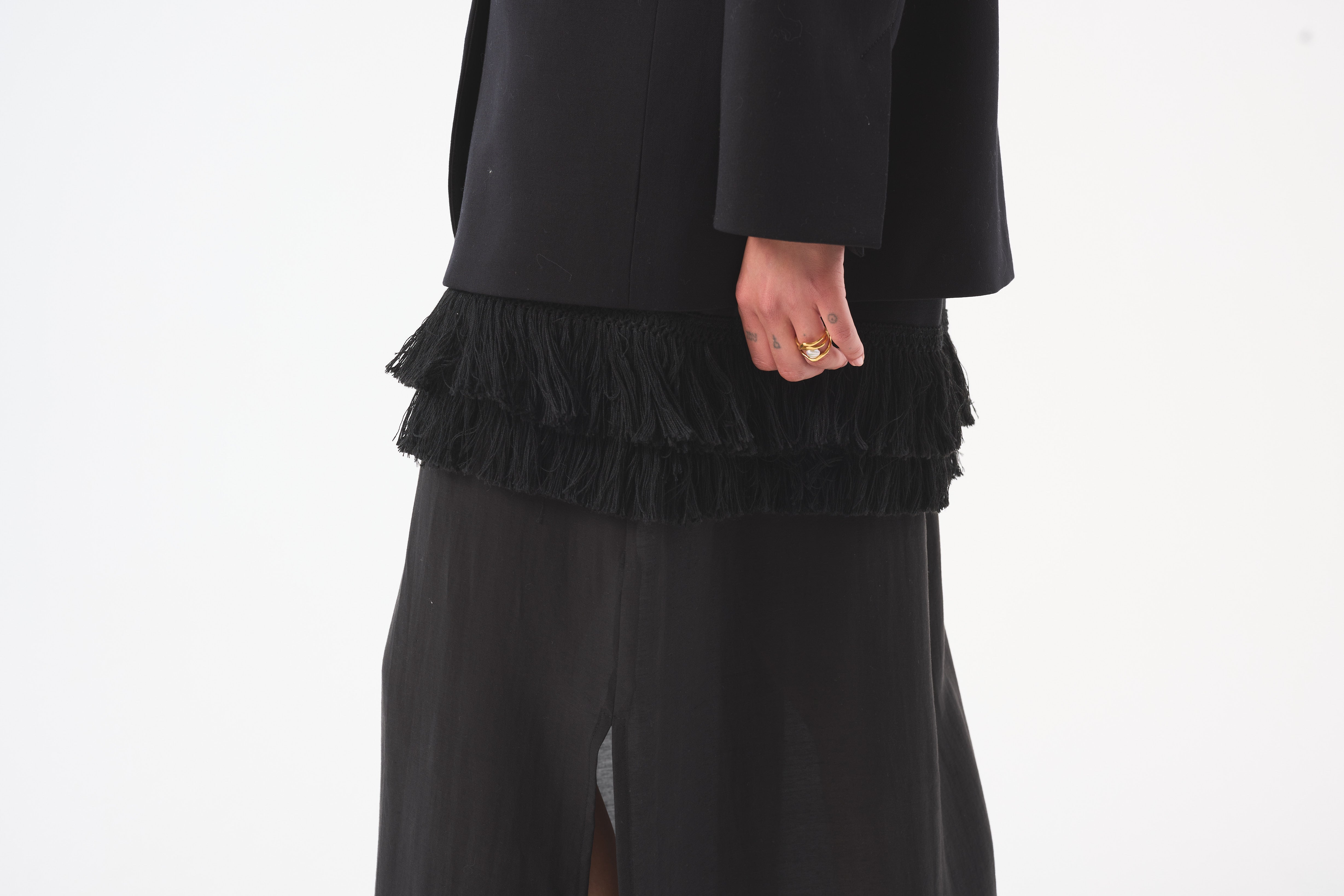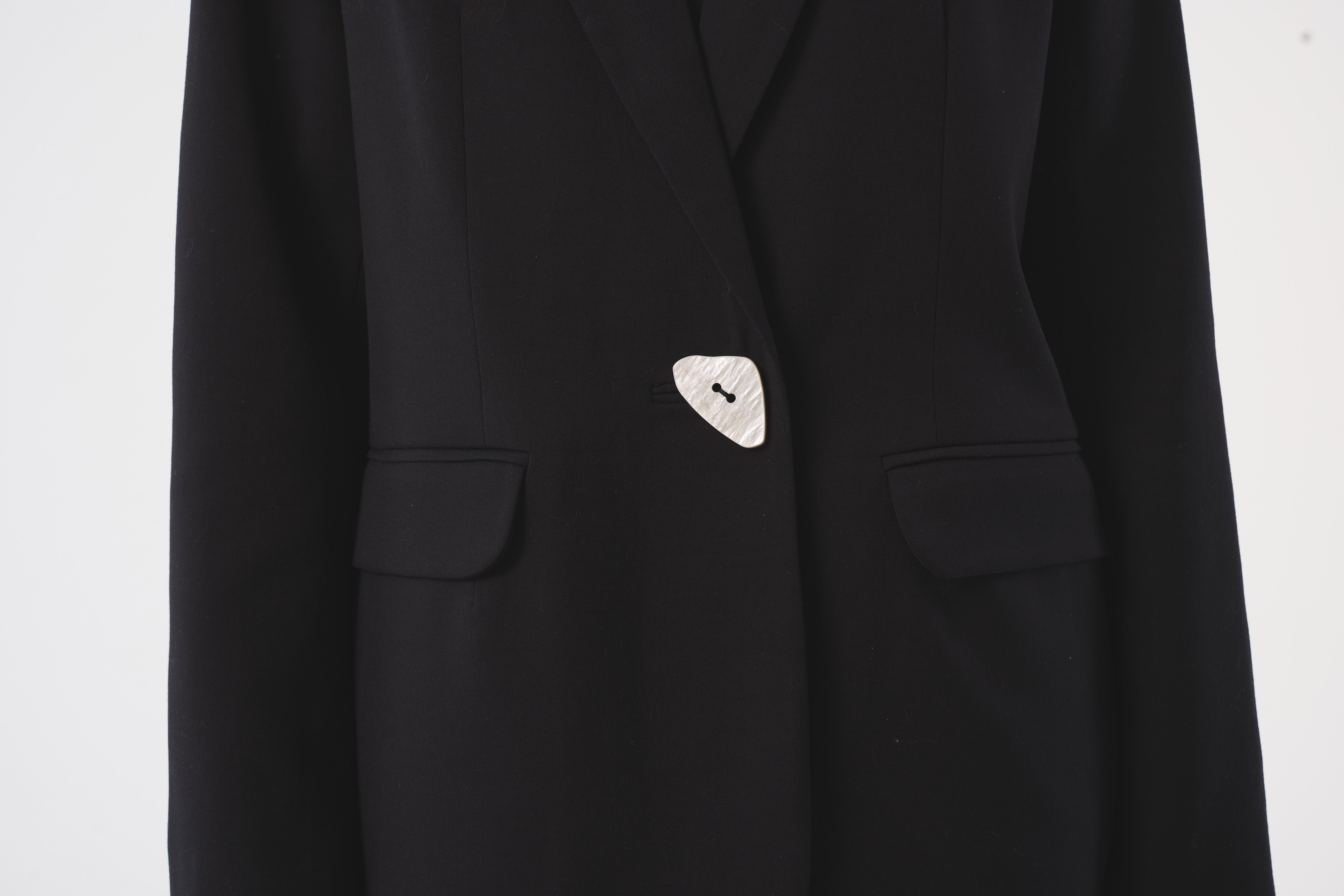 Noor is our signature jacket, cut from a soft black wool-TENCEL™ Lyocell blend. Finished with our distinctive faux shell button and designed with a relaxed, slightly oversized silhouette for modern ease.