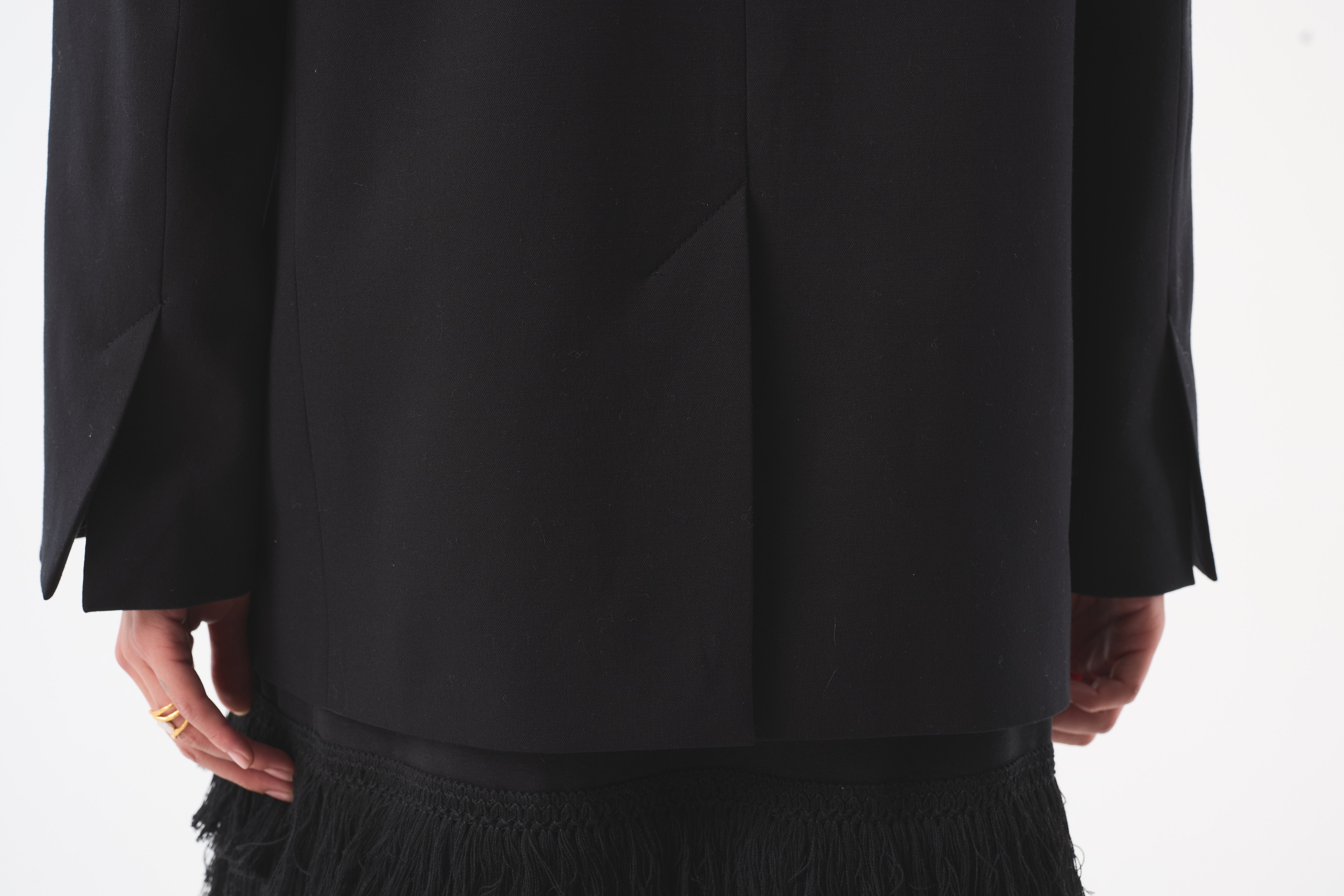 Noor is our signature jacket, cut from a soft black wool-TENCEL™ Lyocell blend. Finished with our distinctive faux shell button and designed with a relaxed, slightly oversized silhouette for modern ease.
