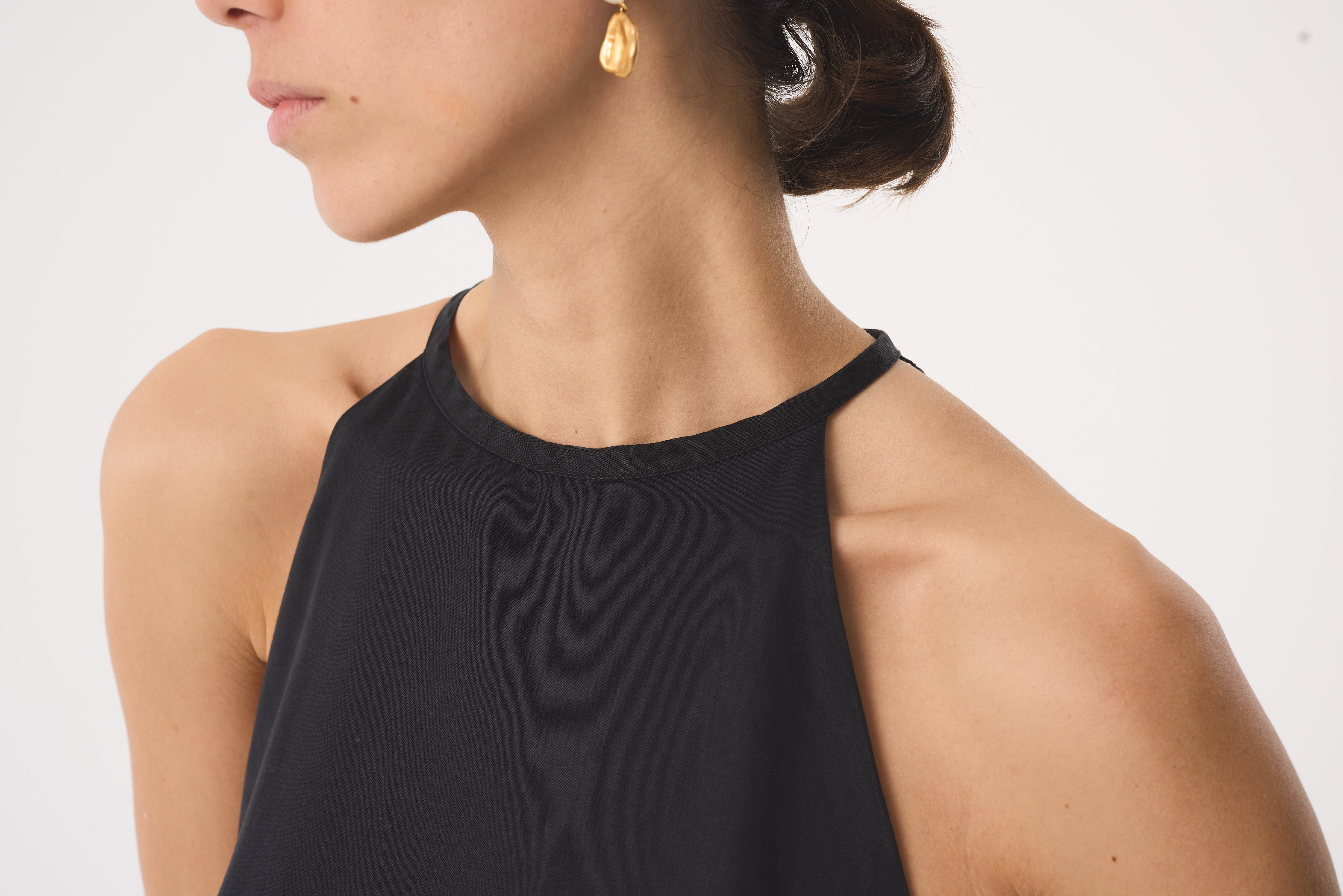 Odessa is our midi dress in washed black denim TENCEL™ Lyocell, detailed with delicate cotton-lace trim and side splits for ease and movement. Structured yet soft.