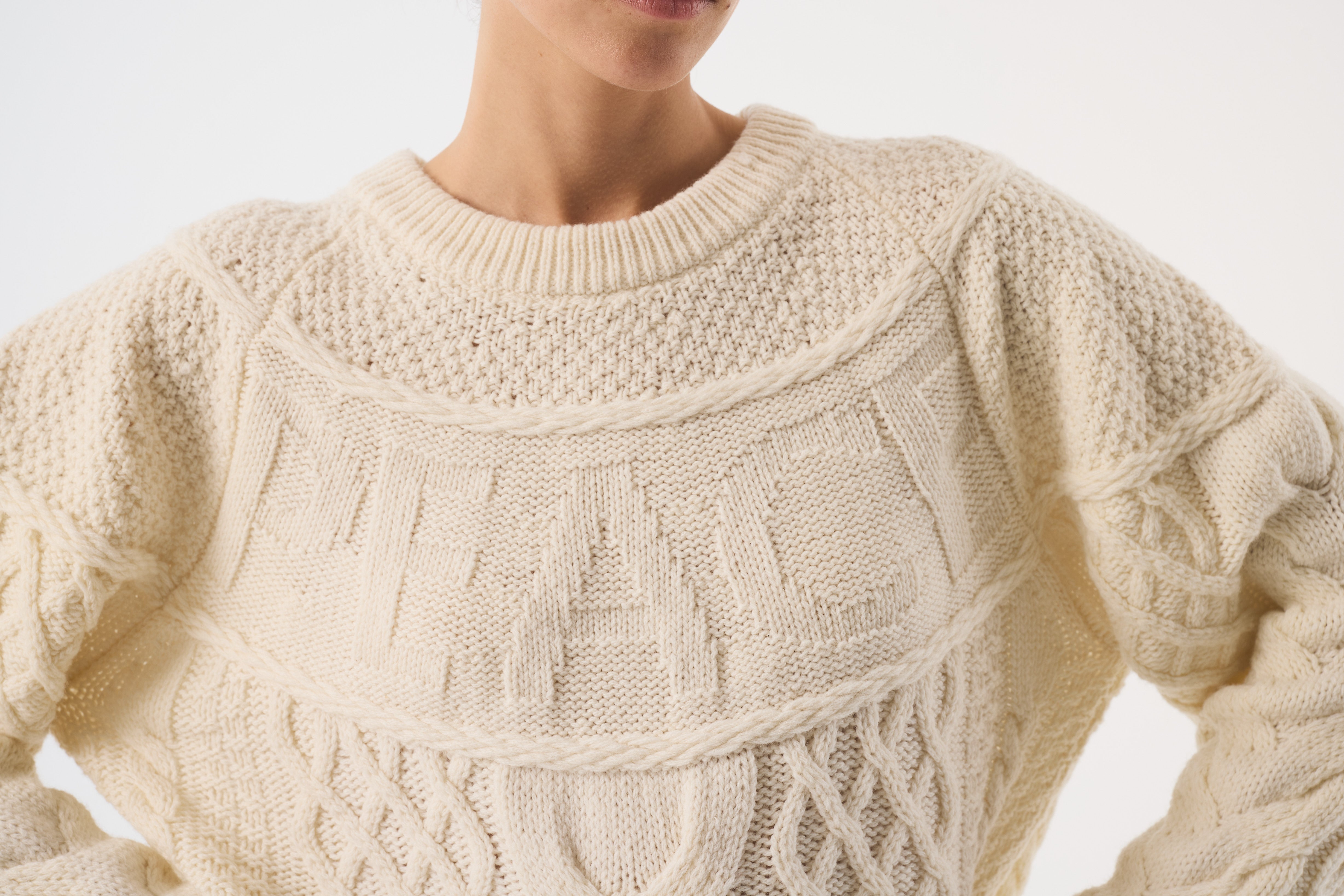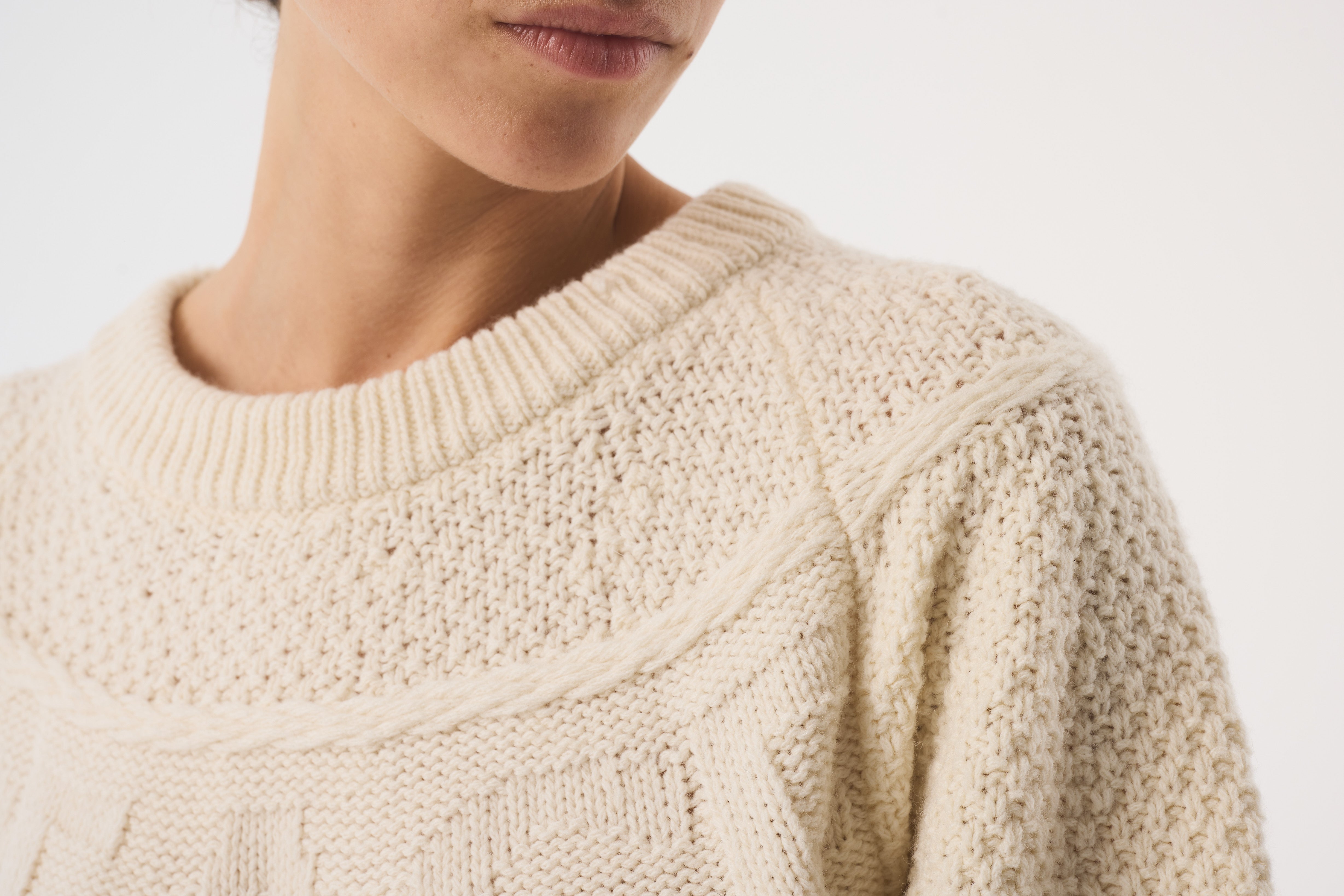 Peace is our oversized jumper in ivory cable-knit with the word ‘PEACE’ subtly knitted into the design. Crafted in a soft RWS-certified merino wool and recycled nylon blend, it’s a cosy statement piece with heart.