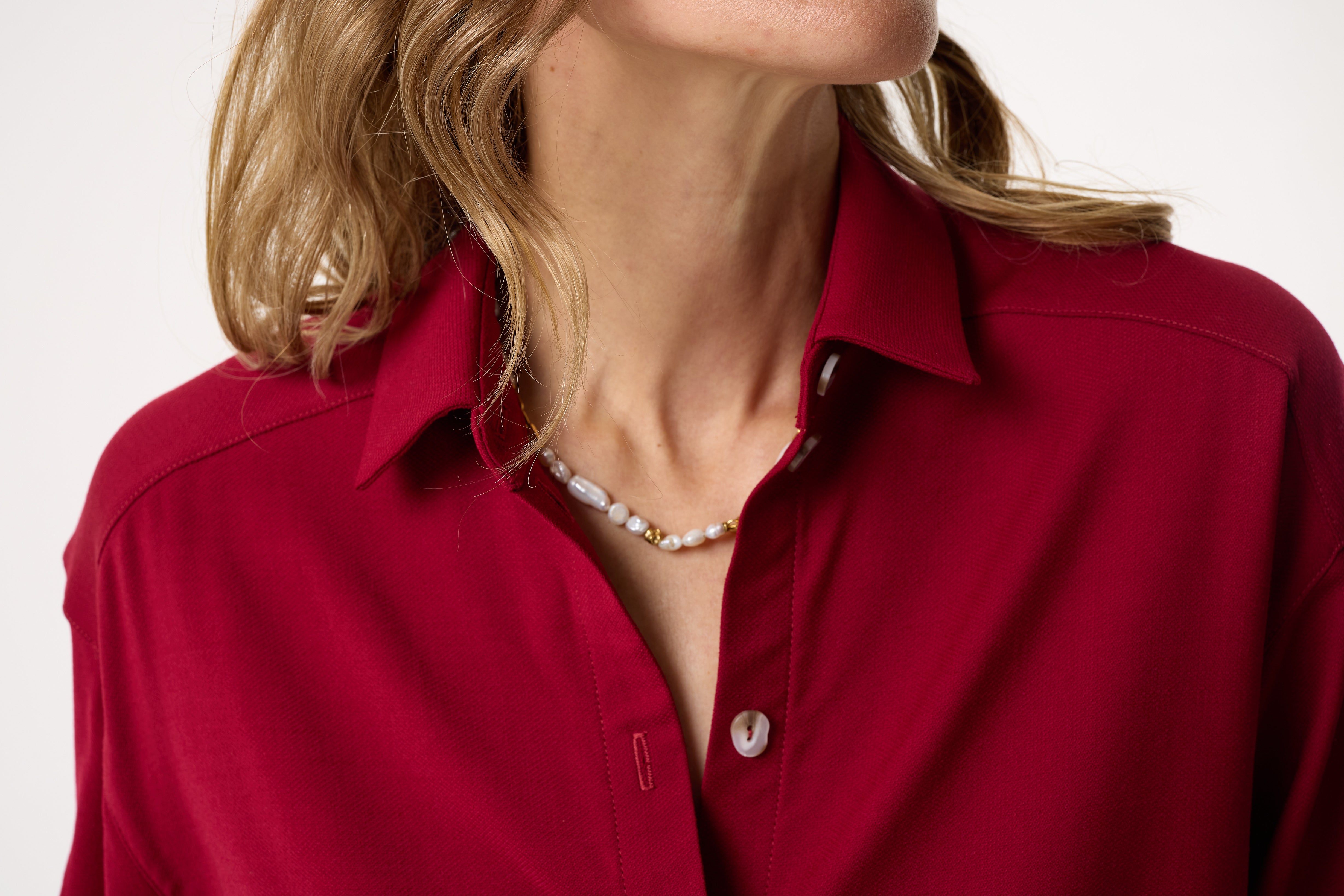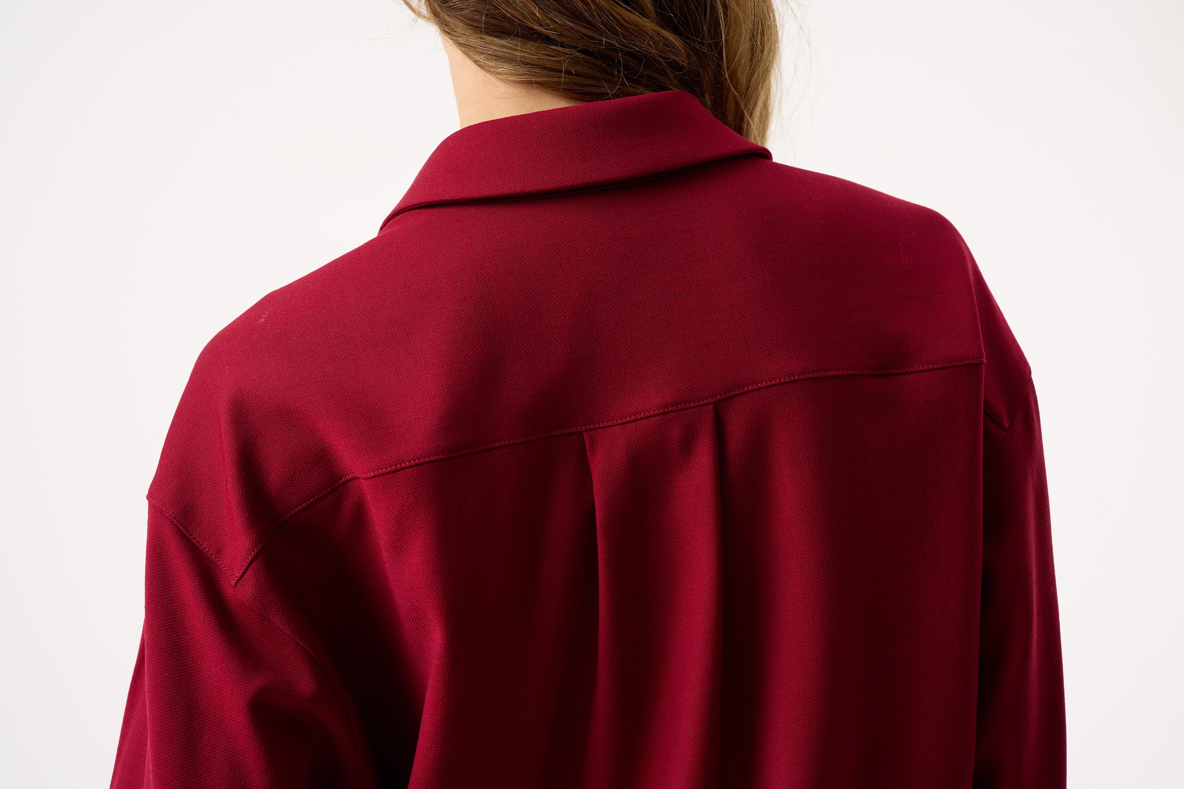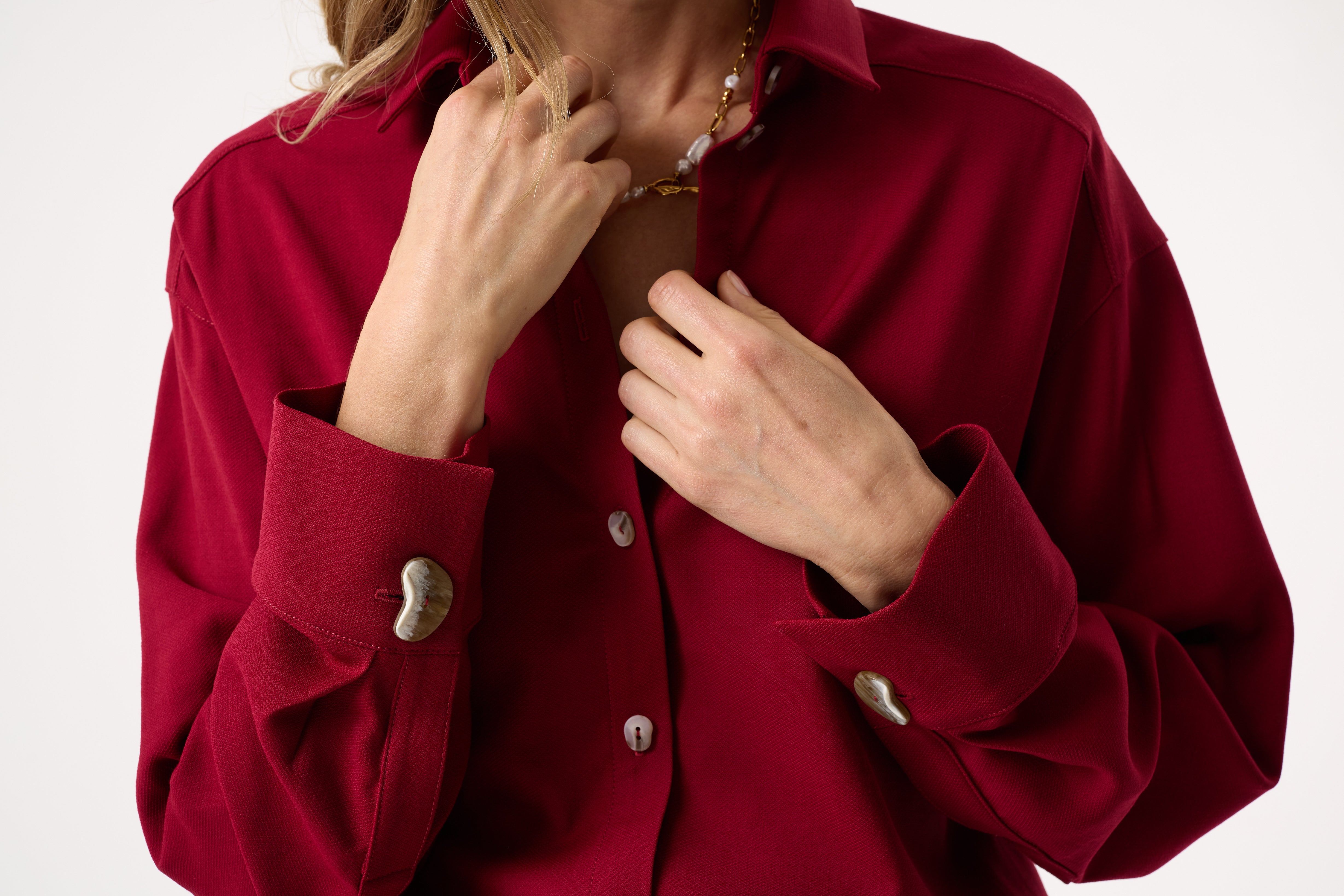 Robyn is a tailored shirt crafted from soft wool in our deep red shade, finished with our brown brushed kidney button on the cuff. Effortless and versatile for modern layering, Robyn pairs perfectly with our coordinating Perla Deep Red Trousers.