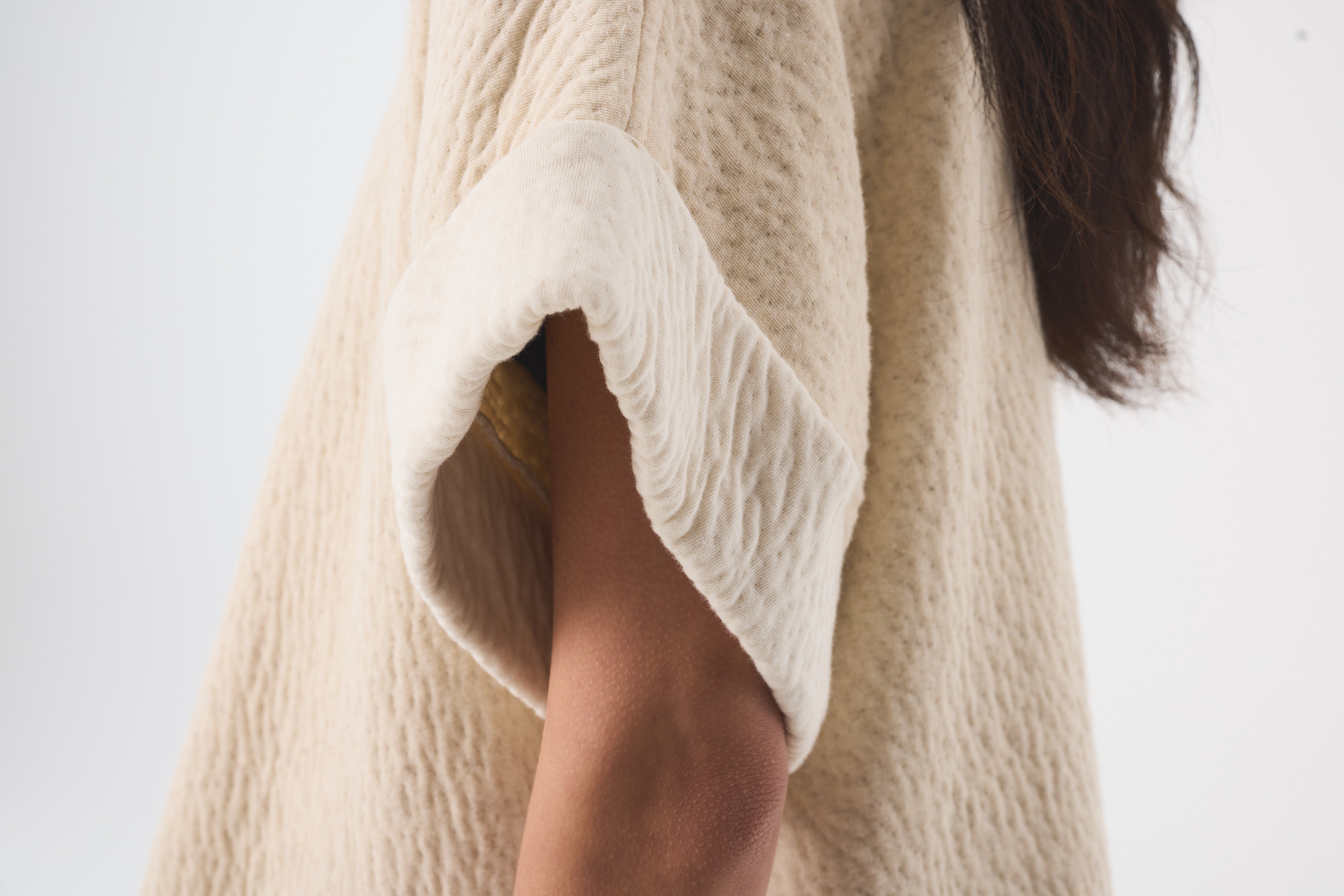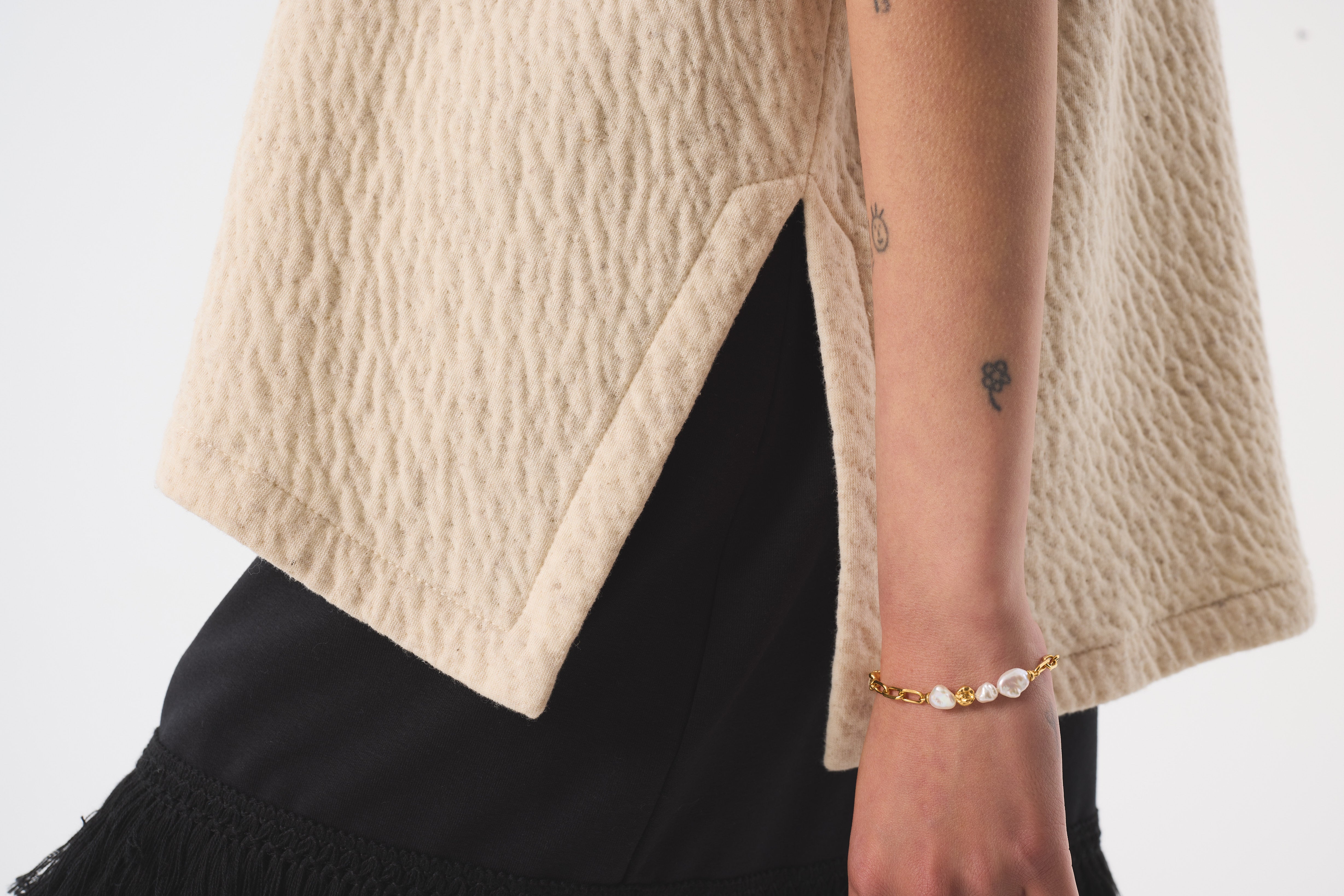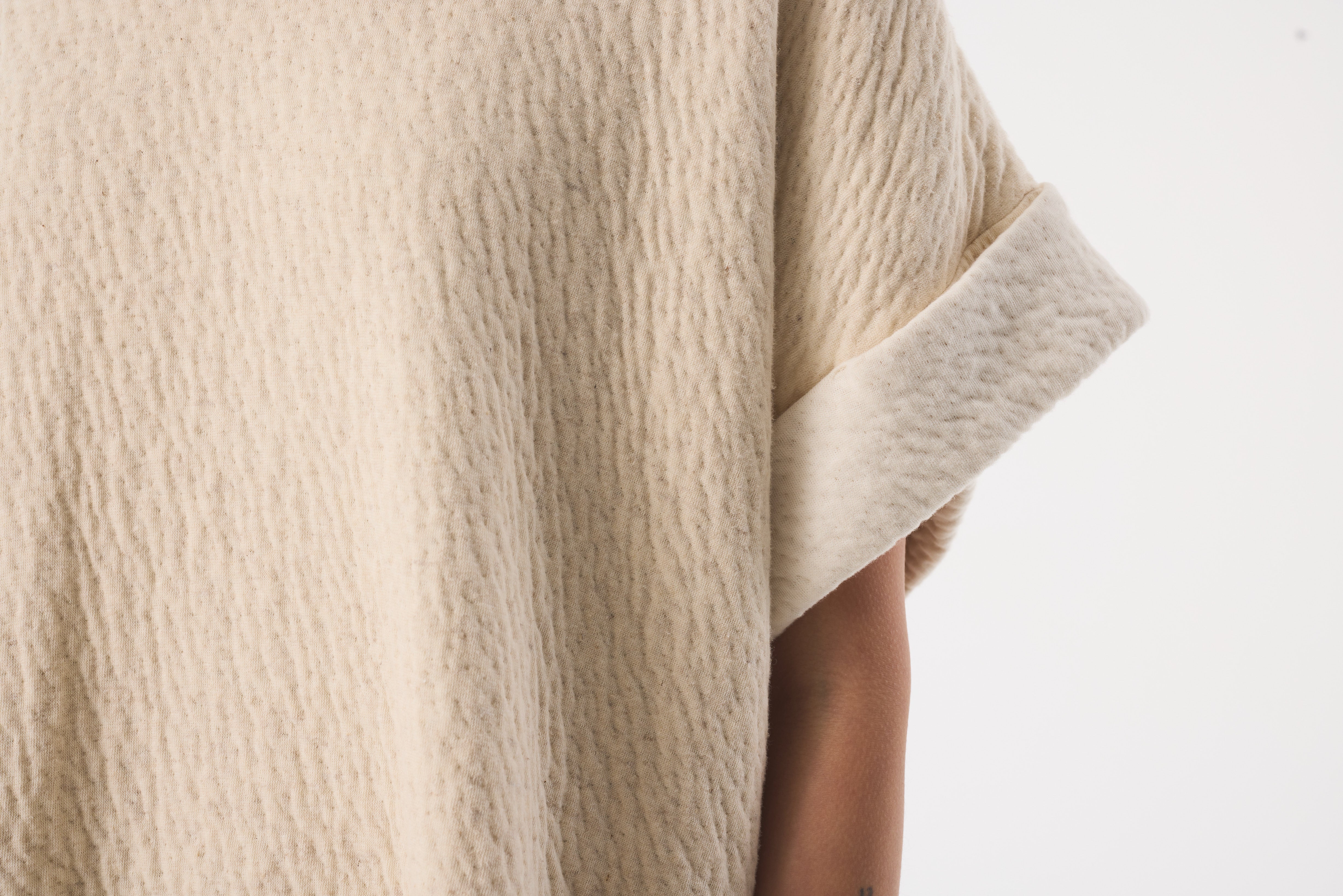 Saoirse is our crew neck jersey top in undyed interlock jacquard, finished with softly rolled sleeves. A refined everyday layer with subtle texture and an easy, relaxed feel.