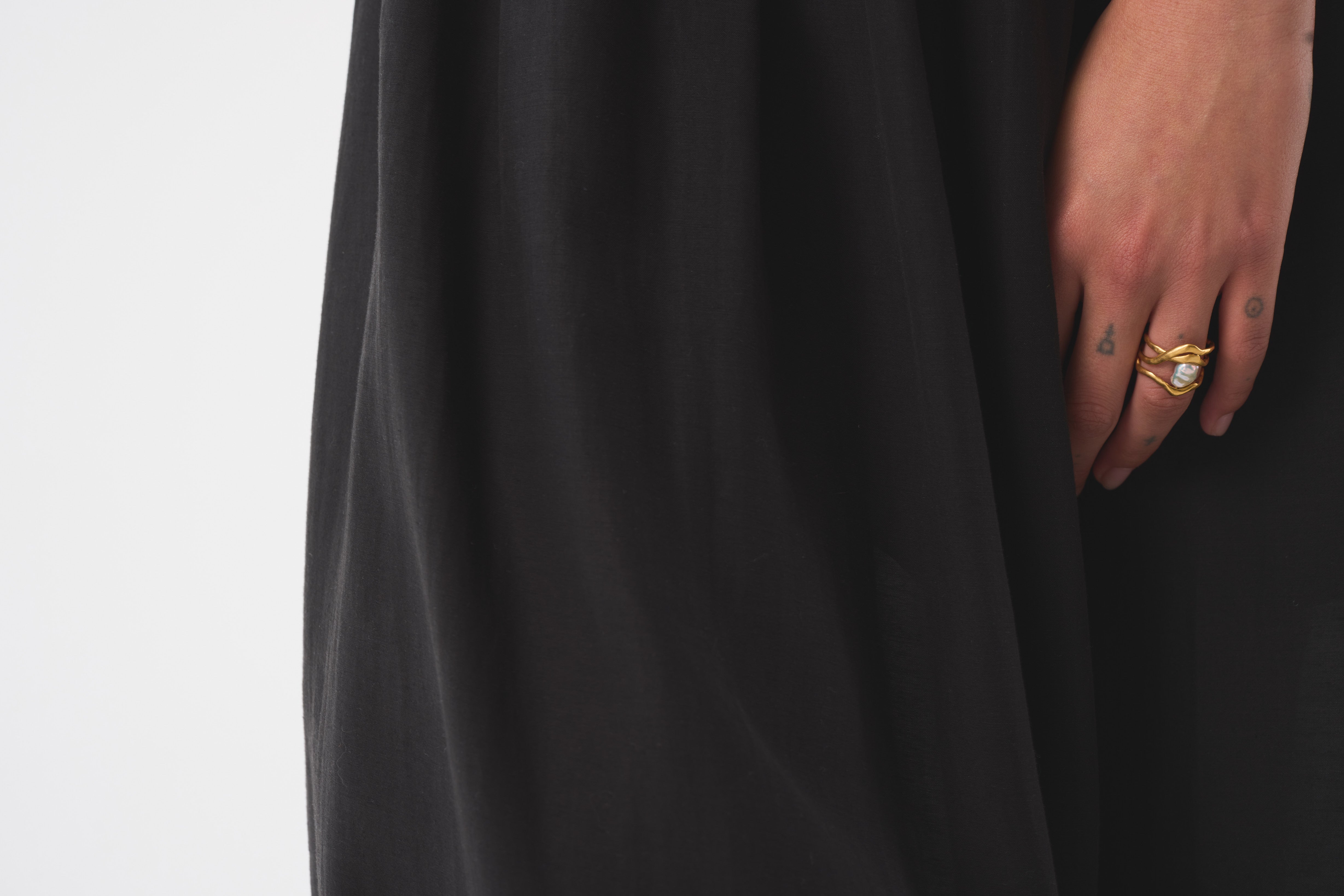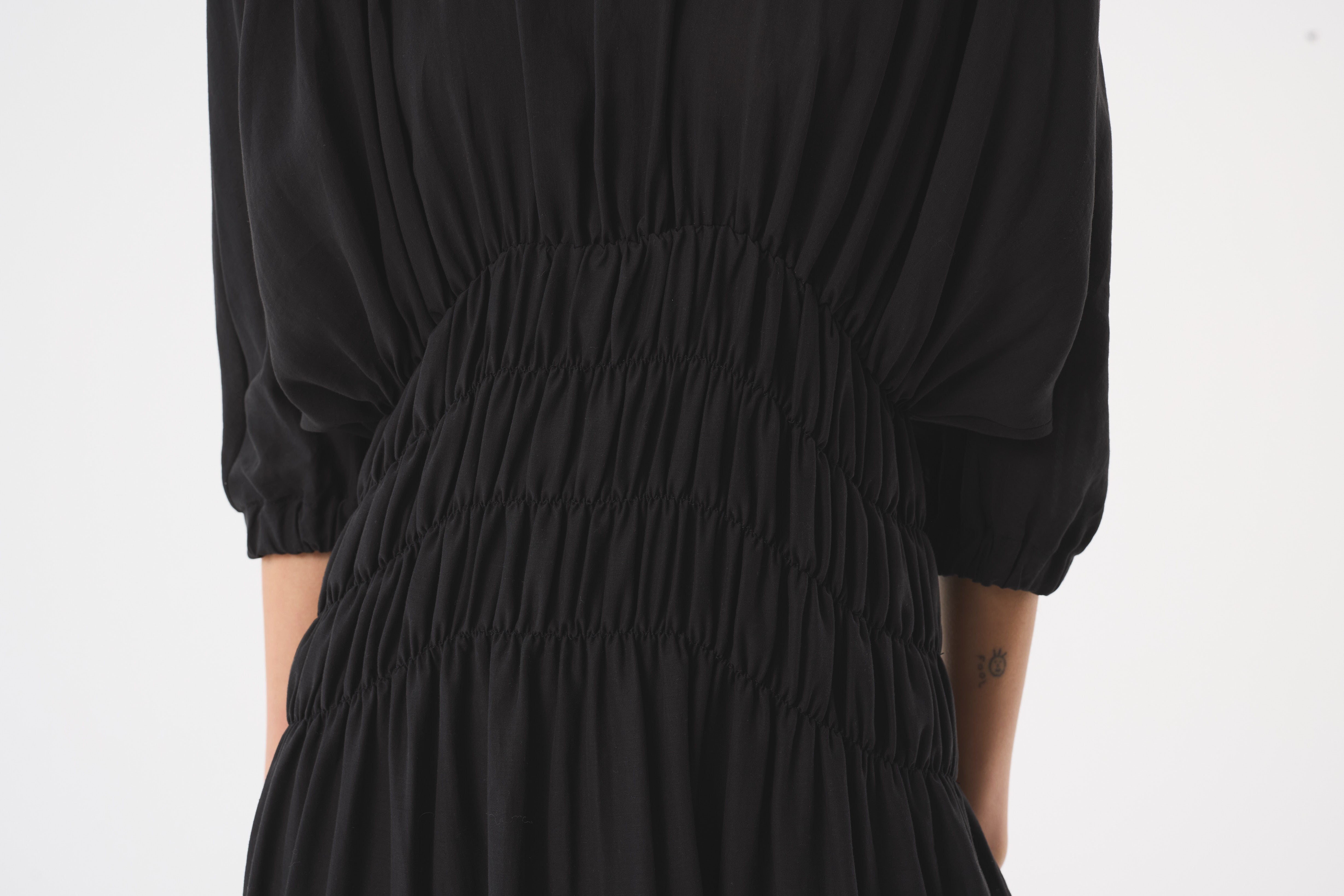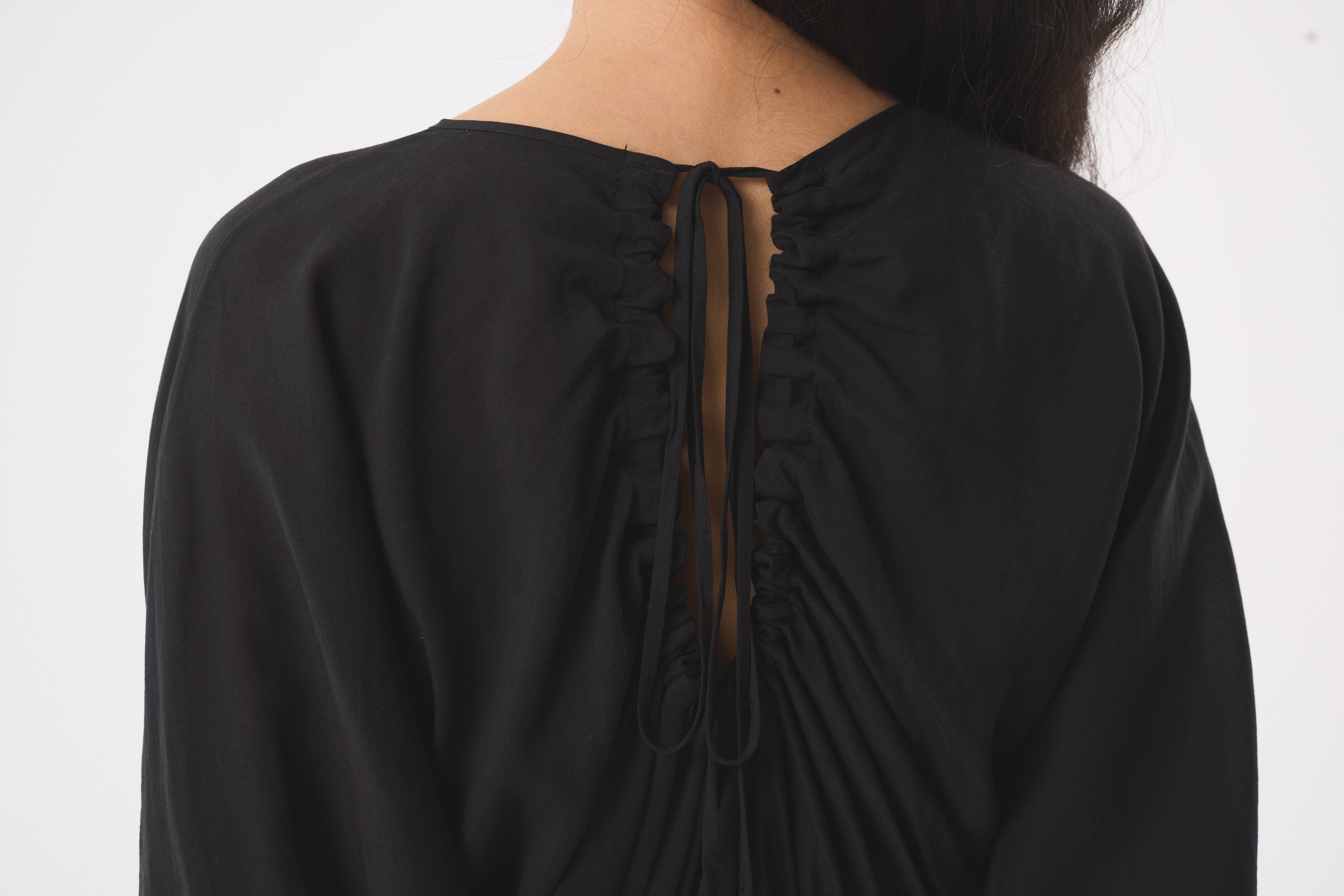 Selena is our gathered long maxi dress in sheer black TENCEL™ Lyocell luxe, designed with a fluid drape and open back cut-out for subtle drama. Light and airy with a soft sheen.