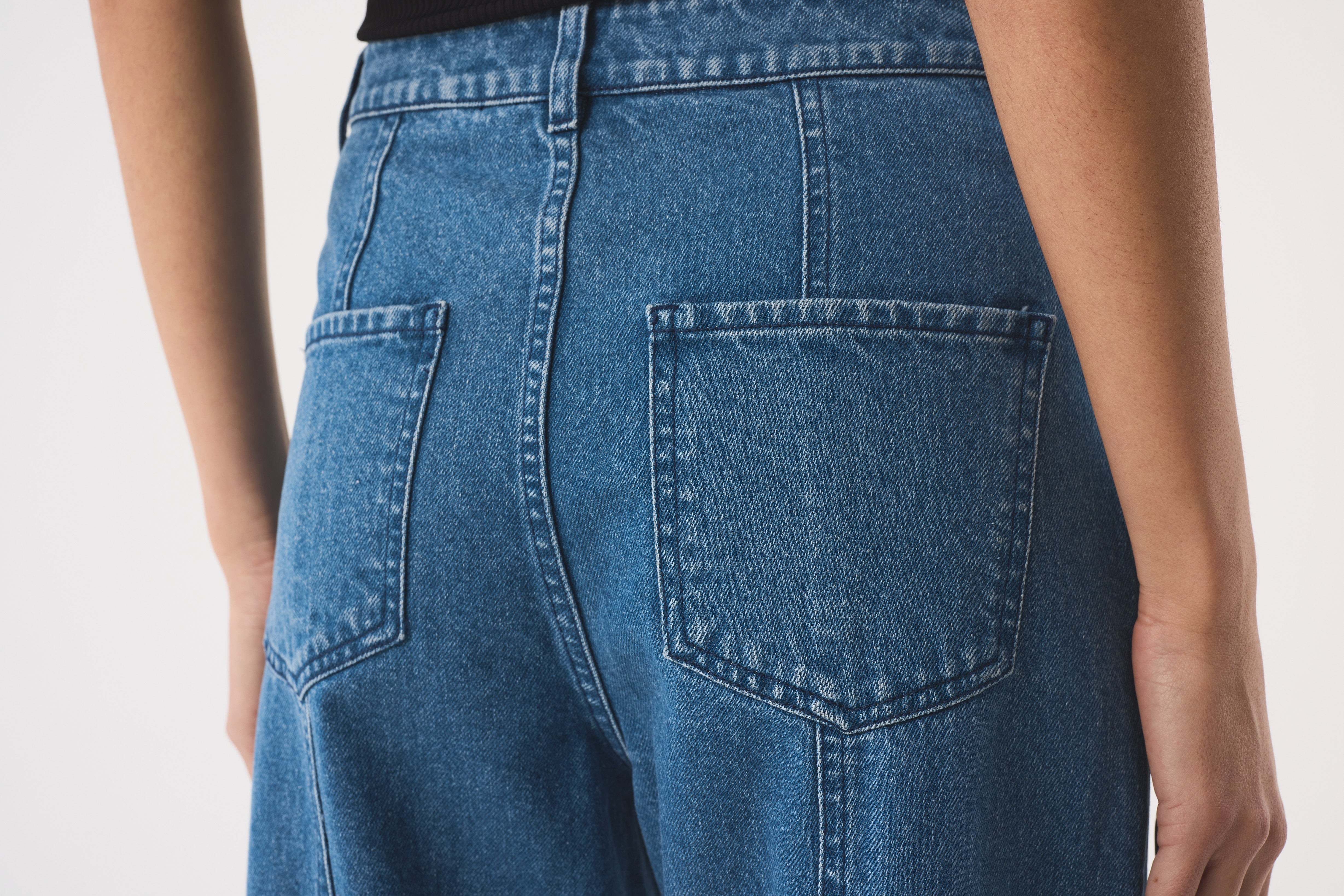 Our signature jean, Sol midwash has a vintage wash and is cut from 100% recycled cotton with a high-rise waist and a tapered leg that finishes in an asymmetric frayed hem. Finished with our distinctive gold kidney hardware at the fly to bring elevation and distinction to the workwear classic.