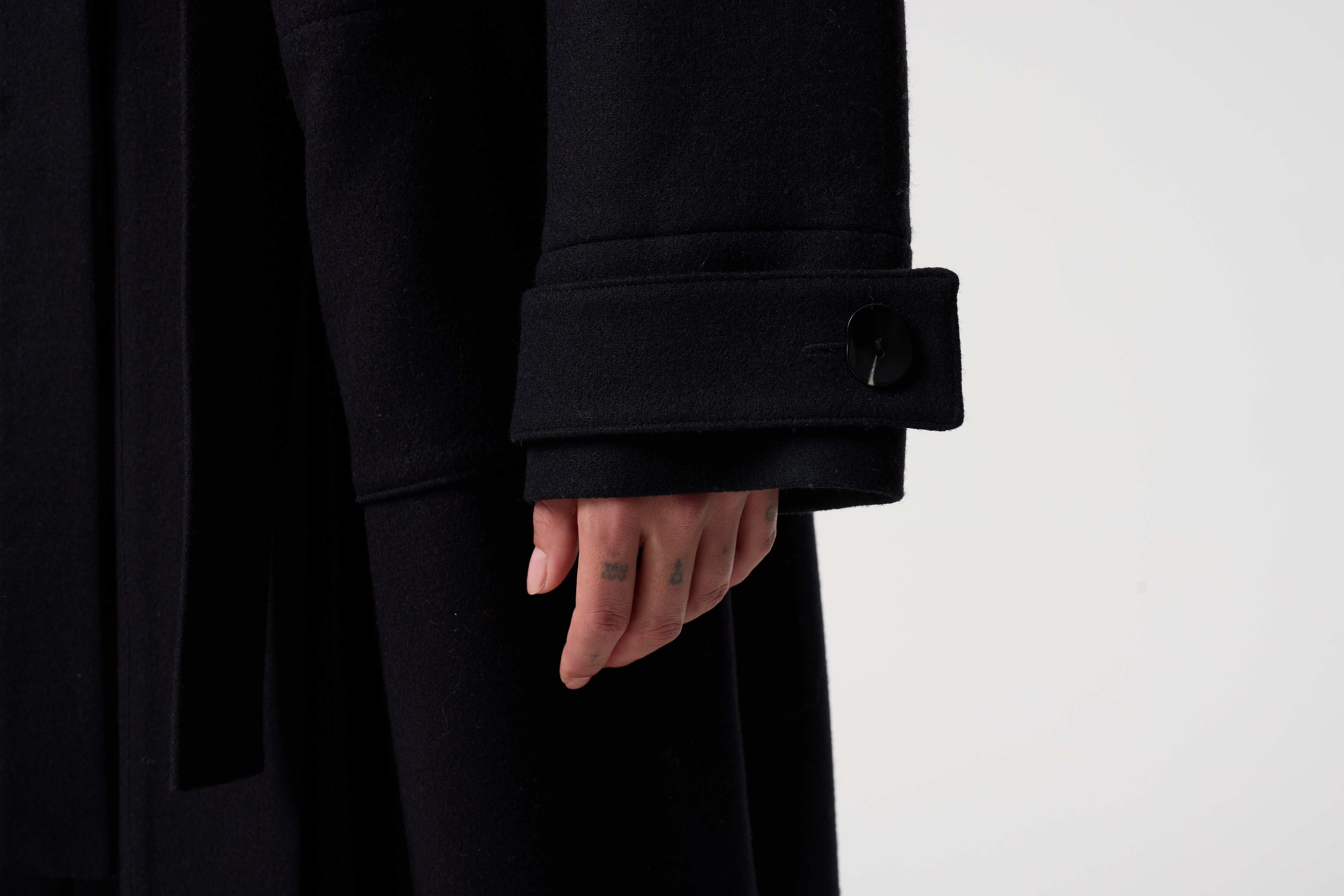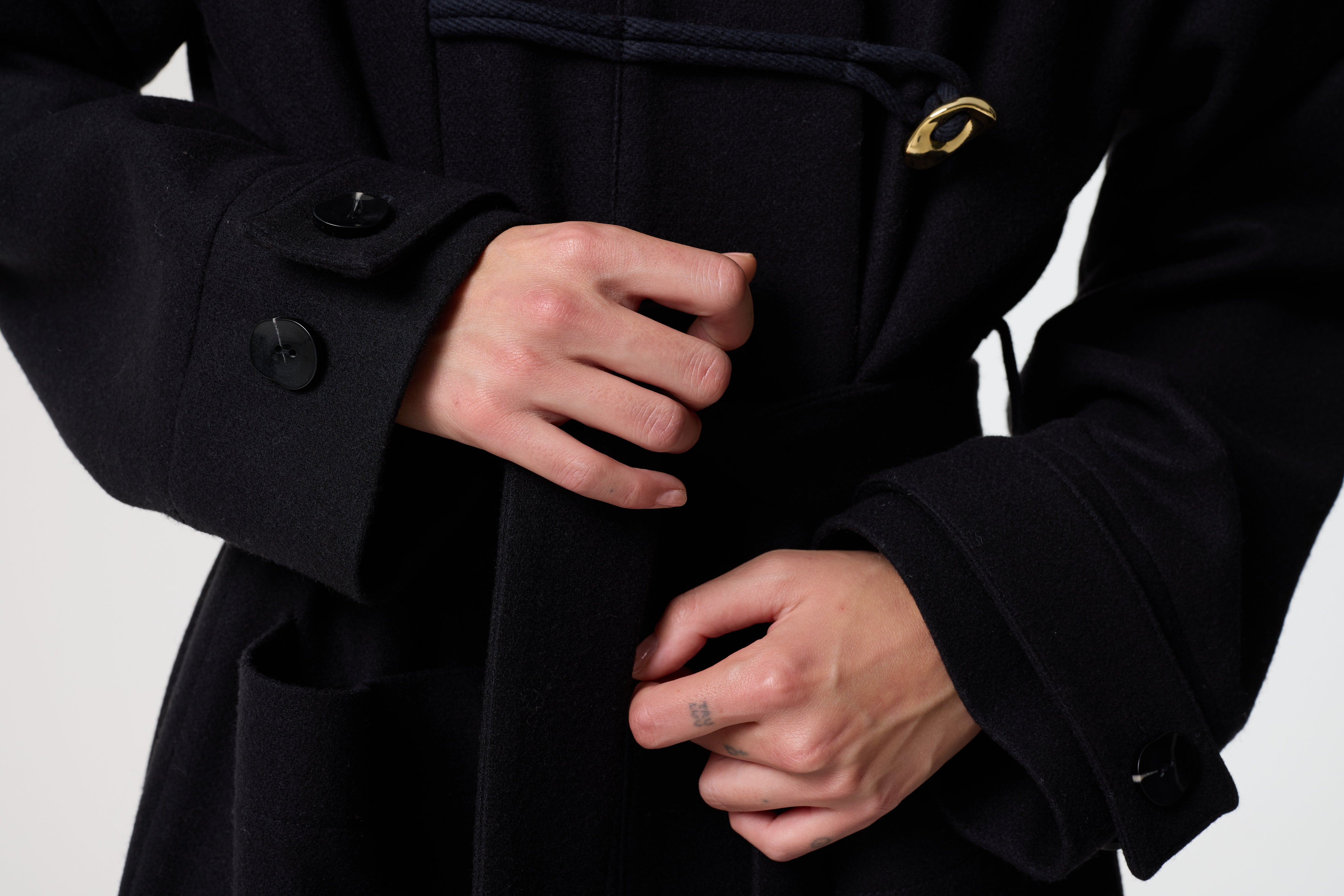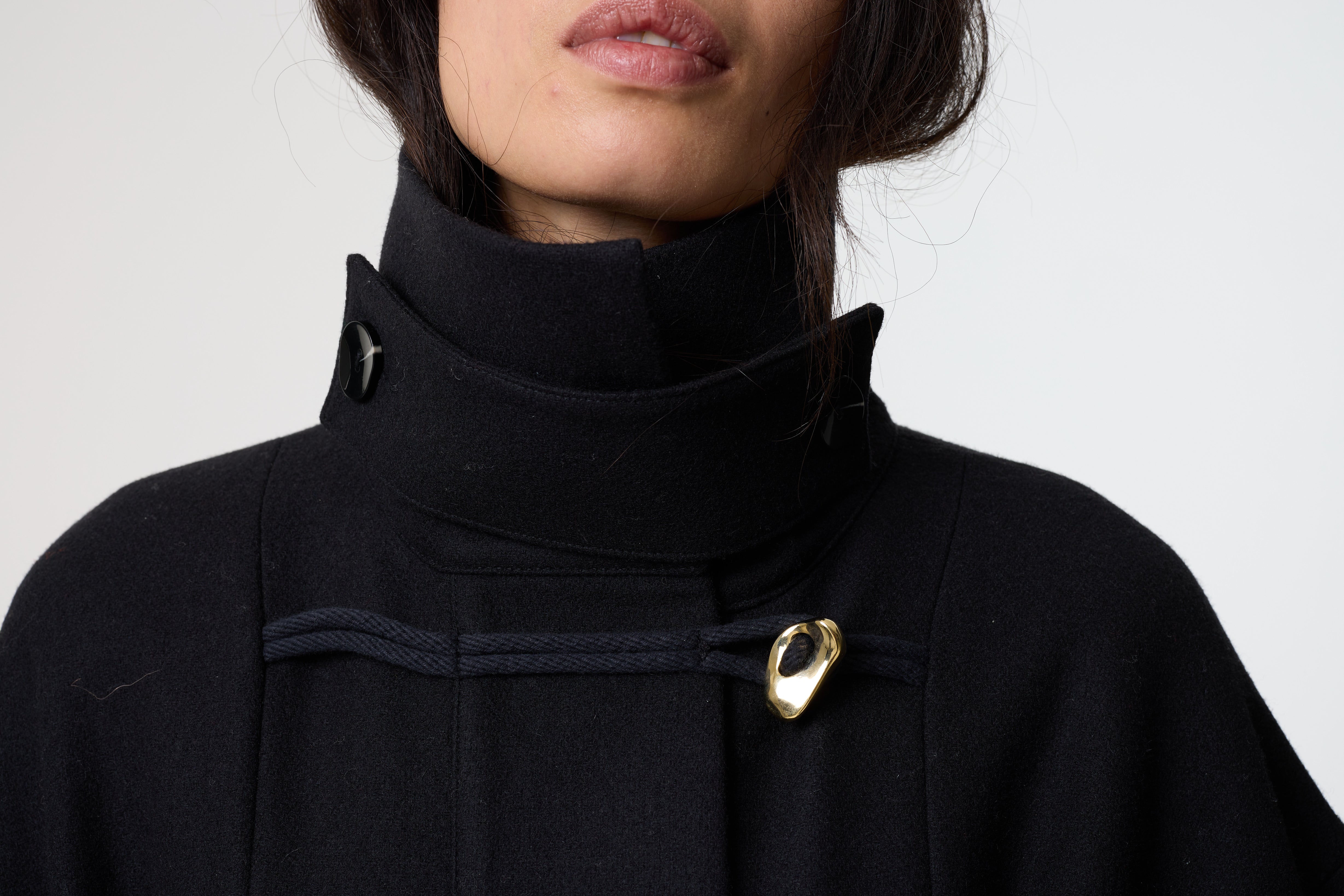 Our hero coat for Autumn Winter 25, Thalia is a modern duffle coat cut from felted wool in black. The classic toggle fastening is elevated with our distinctive gold hag stone-style buttons, inspired by natural hag stones. With a high collar to keep you warm on cold days, Thalia is a timeless outer layer for everyday wear.
