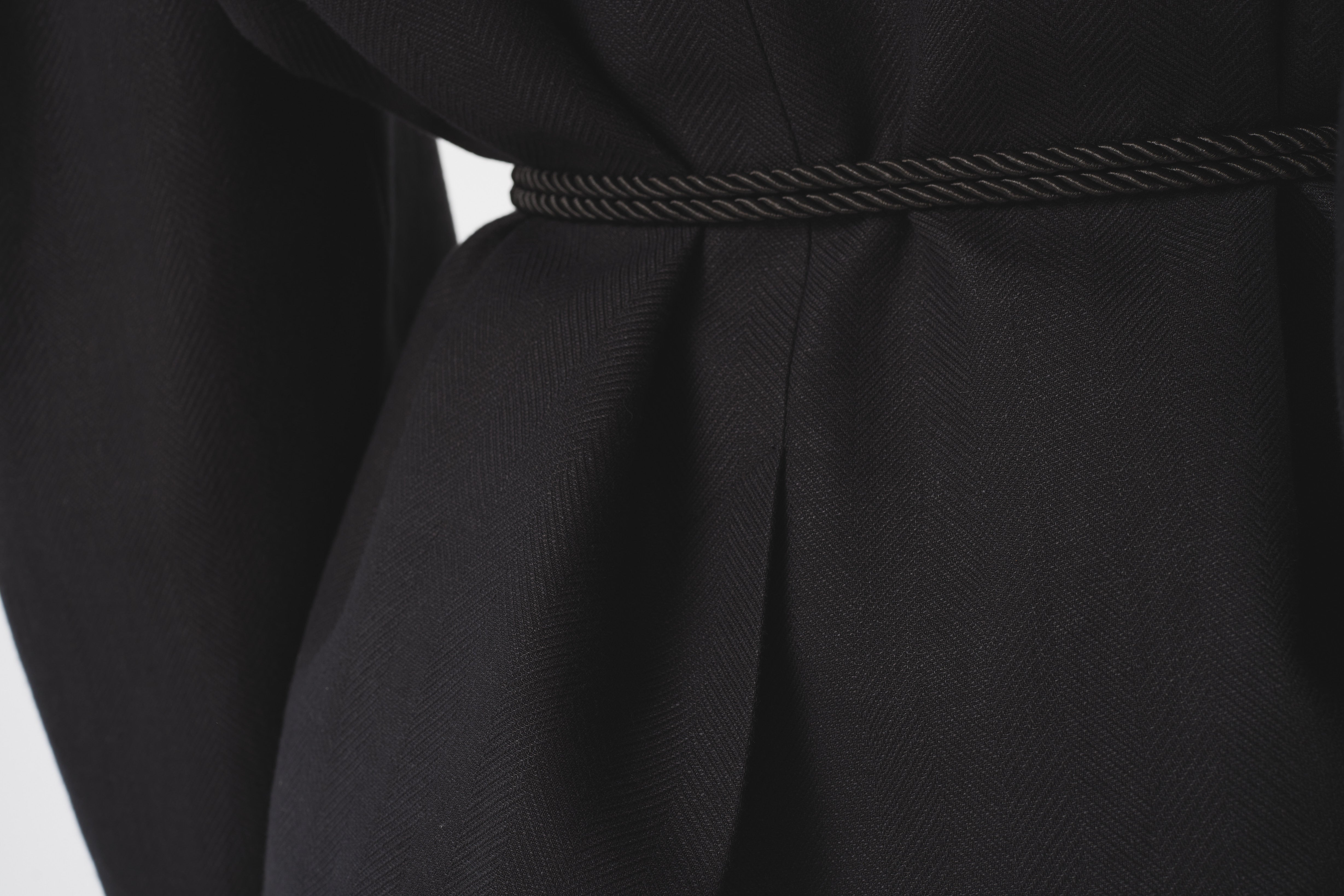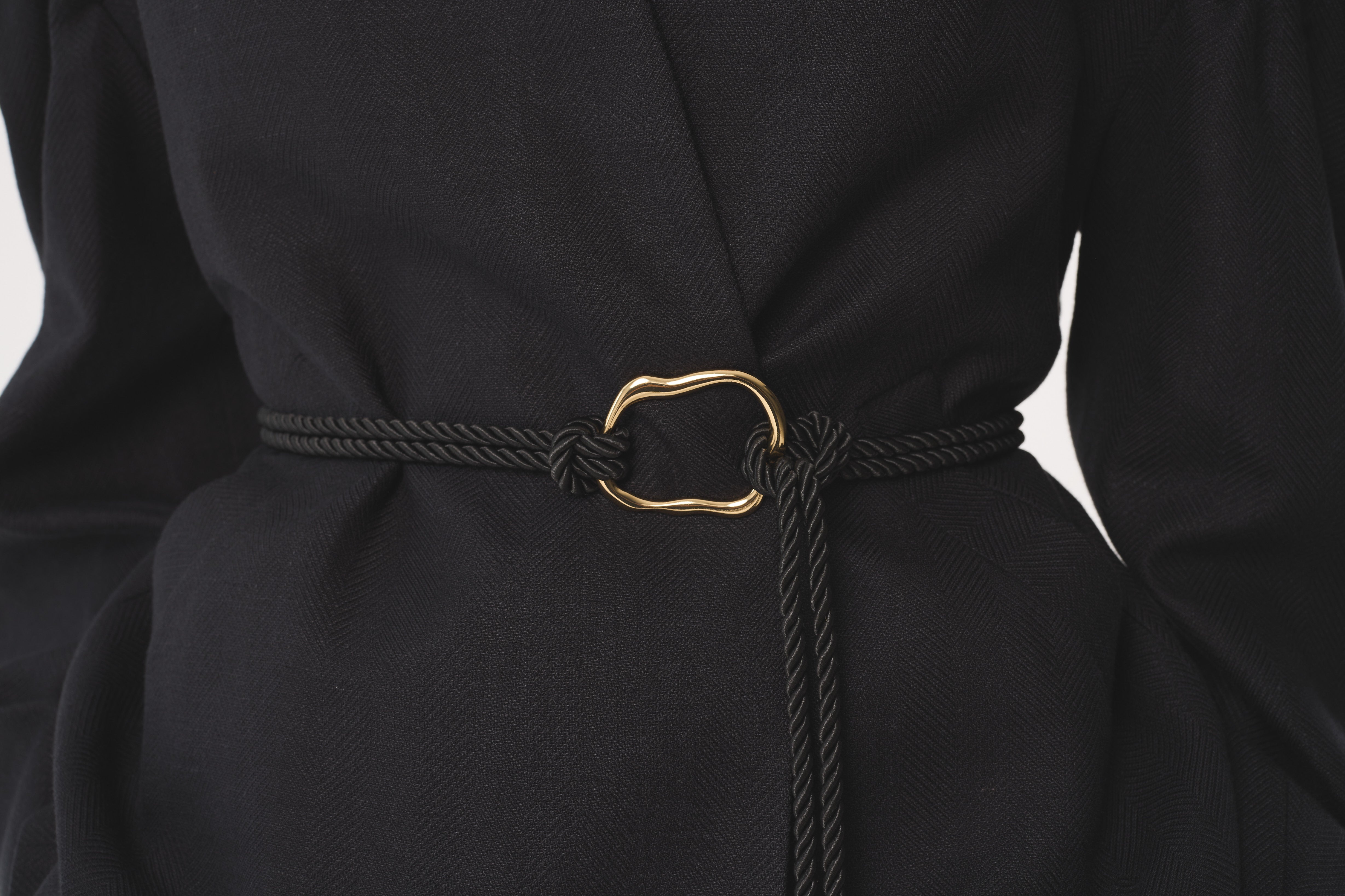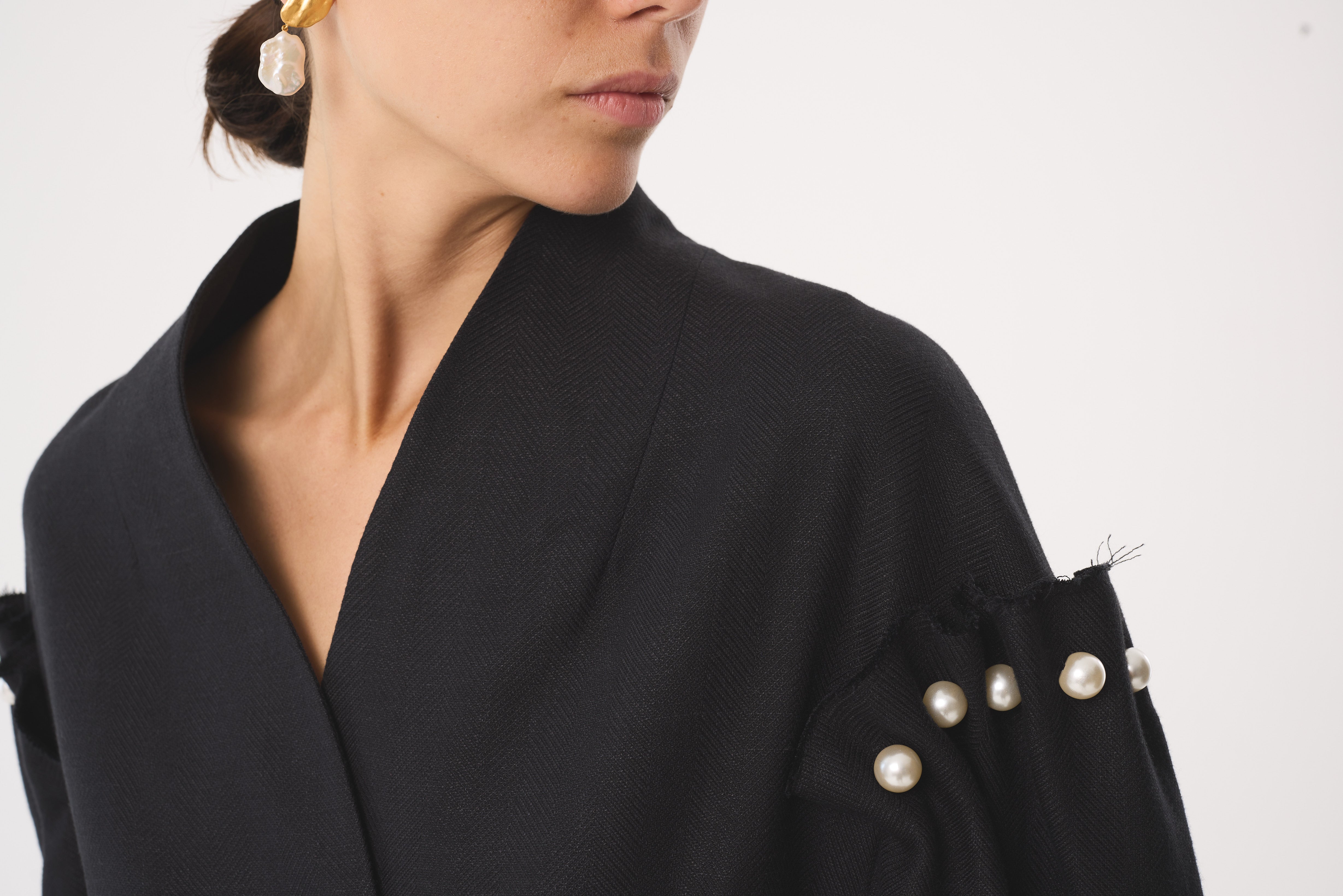 Ulla is our short wrap around jacket in black linen–wool–lyocell blend, detailed with faux pearl buttons at the shoulder and a soft tie belt with a gold ring detail. A clean, modern layer with subtle statement detailing.