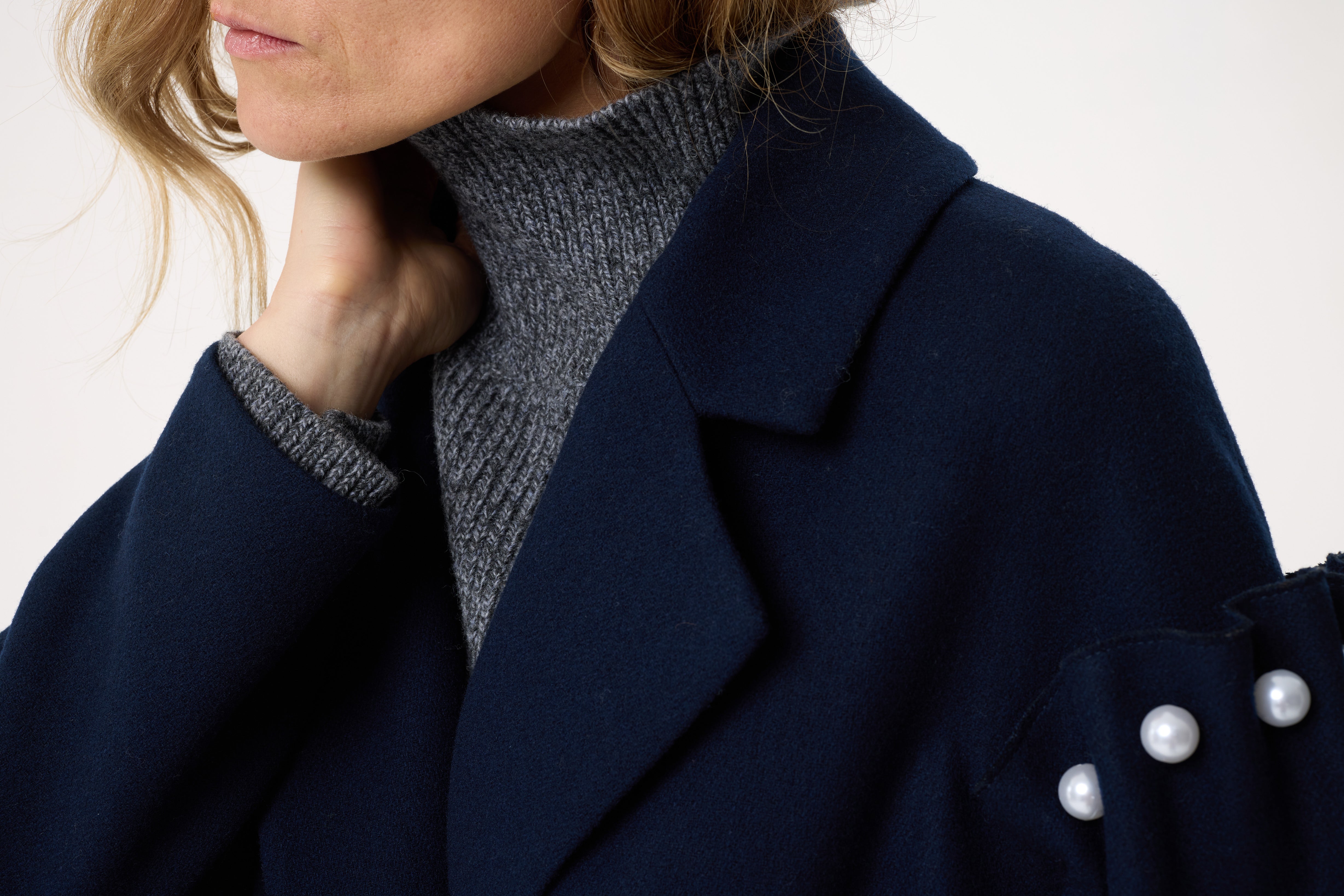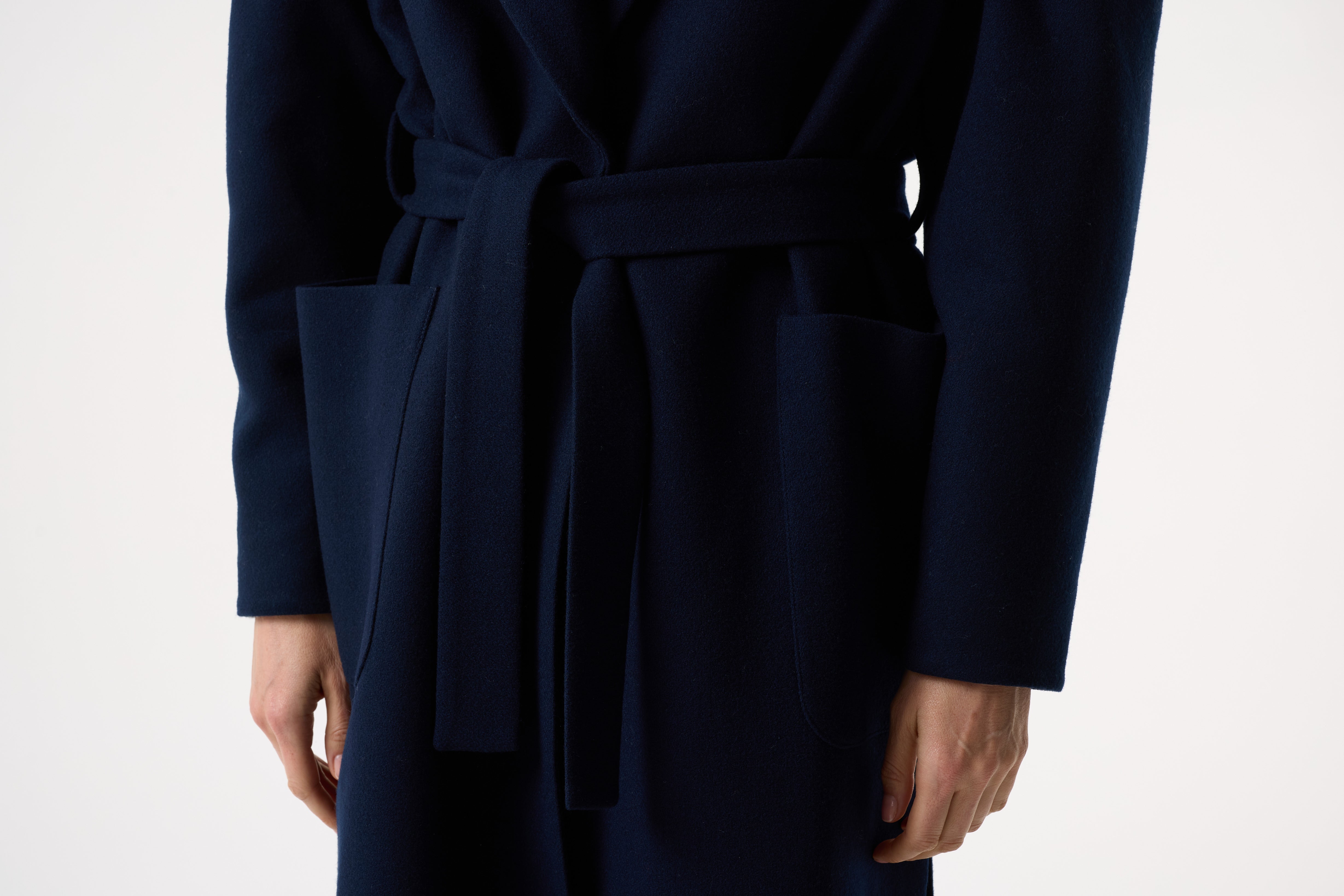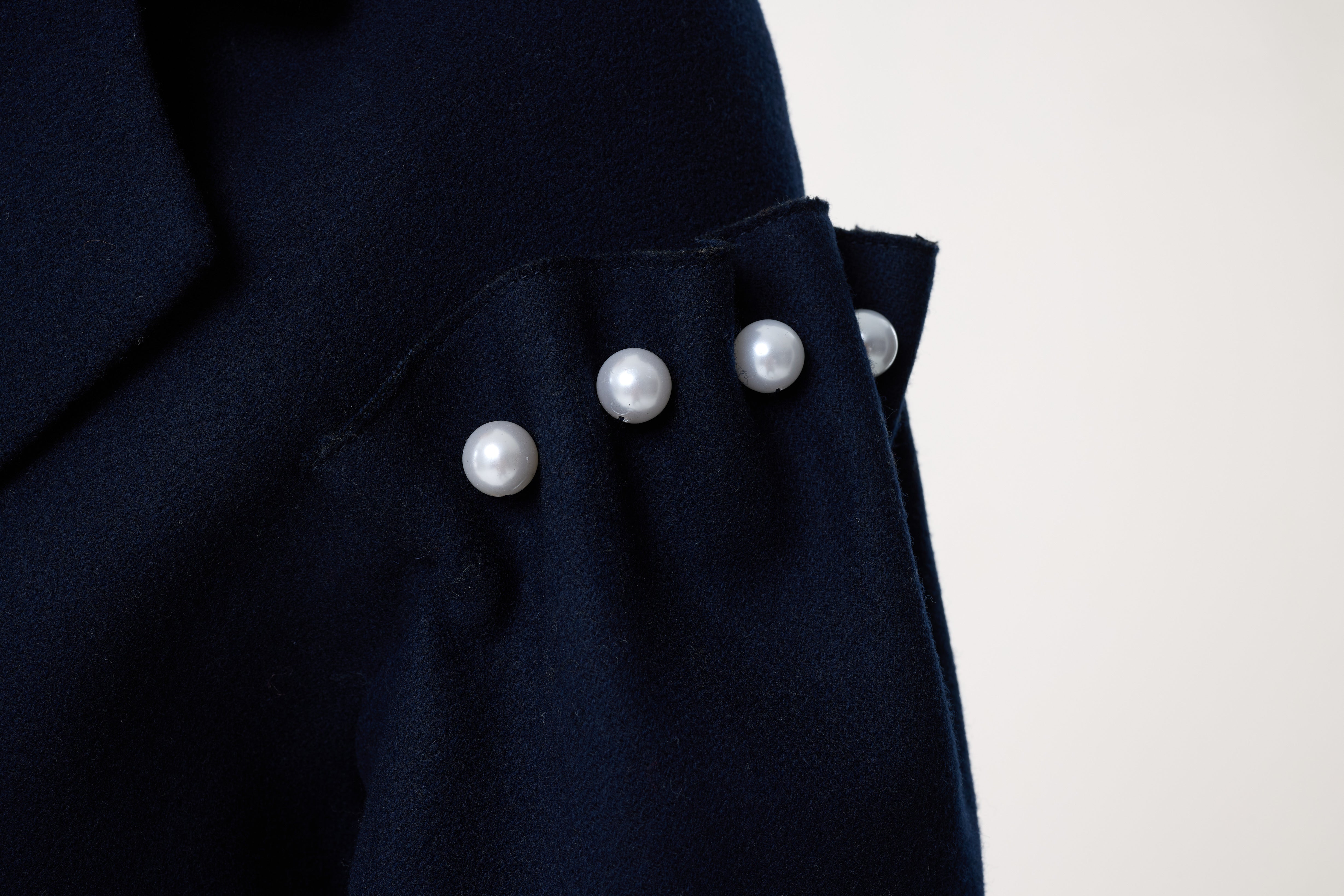 Amy's signature winter coat is back. The iconic Wren is crafted from soft navy non-mulesed wool, with a self-tie waist belt for versatile styling, and finished with our iconic faux pearl-studded shoulders for a distinctly AKYN elevation.