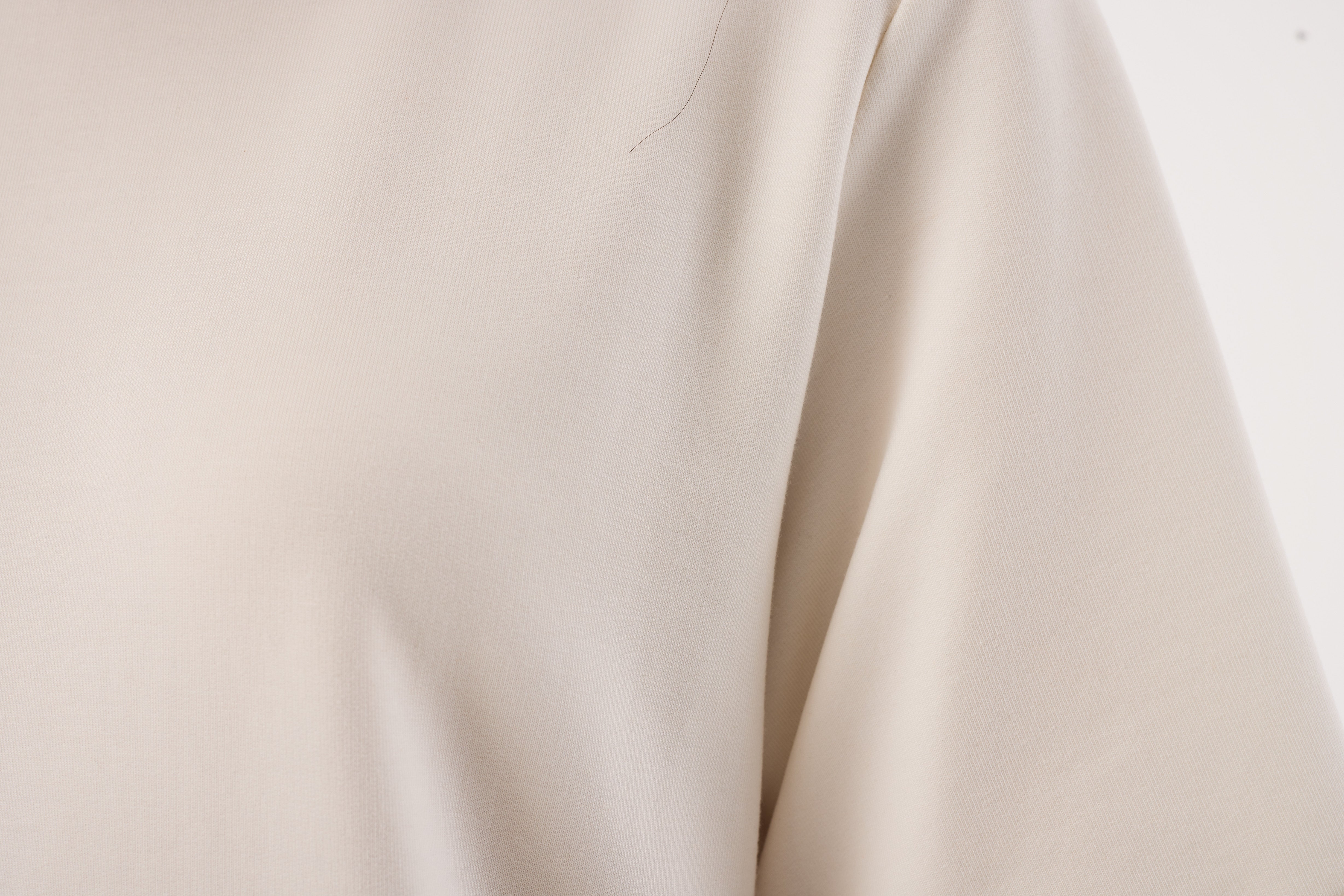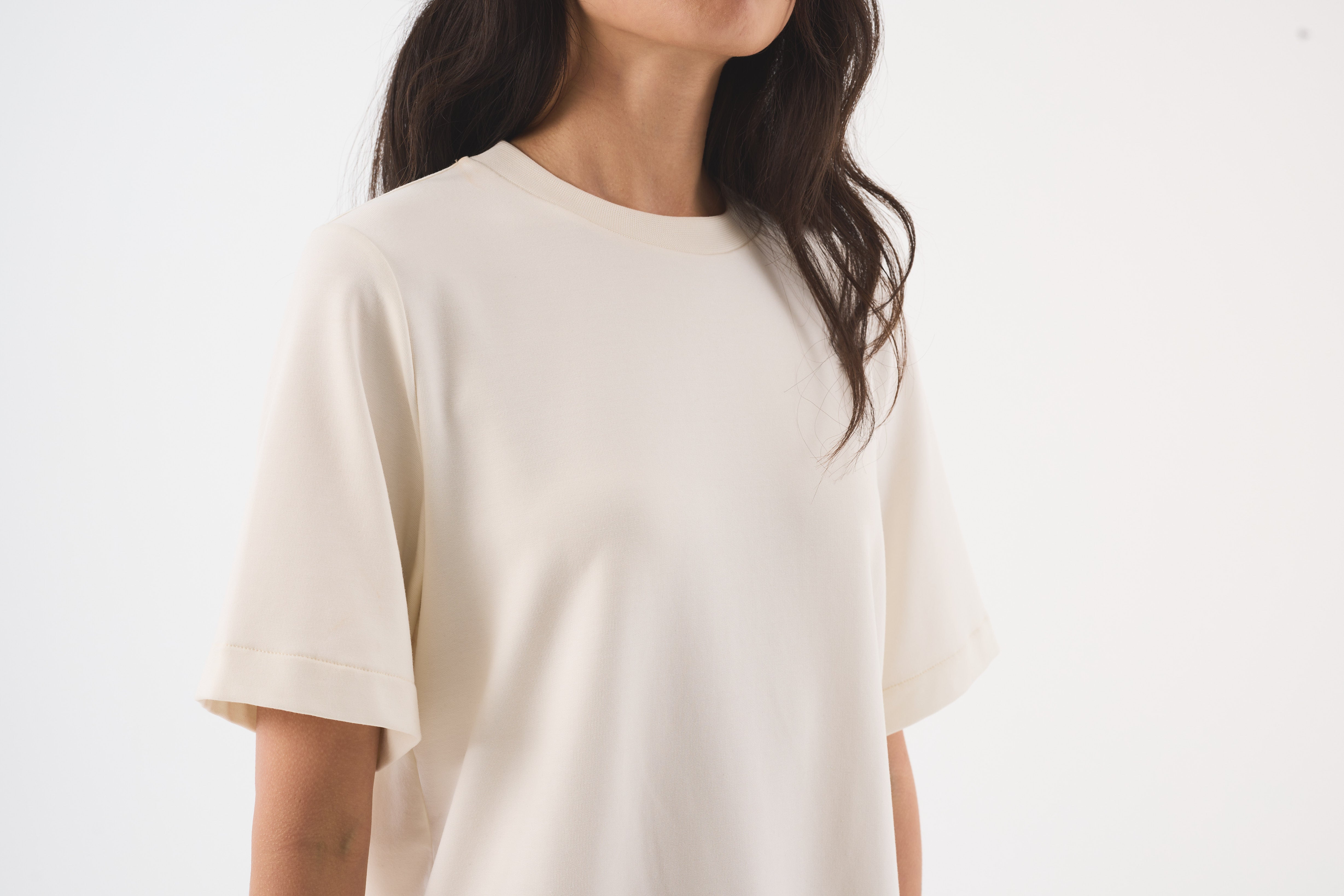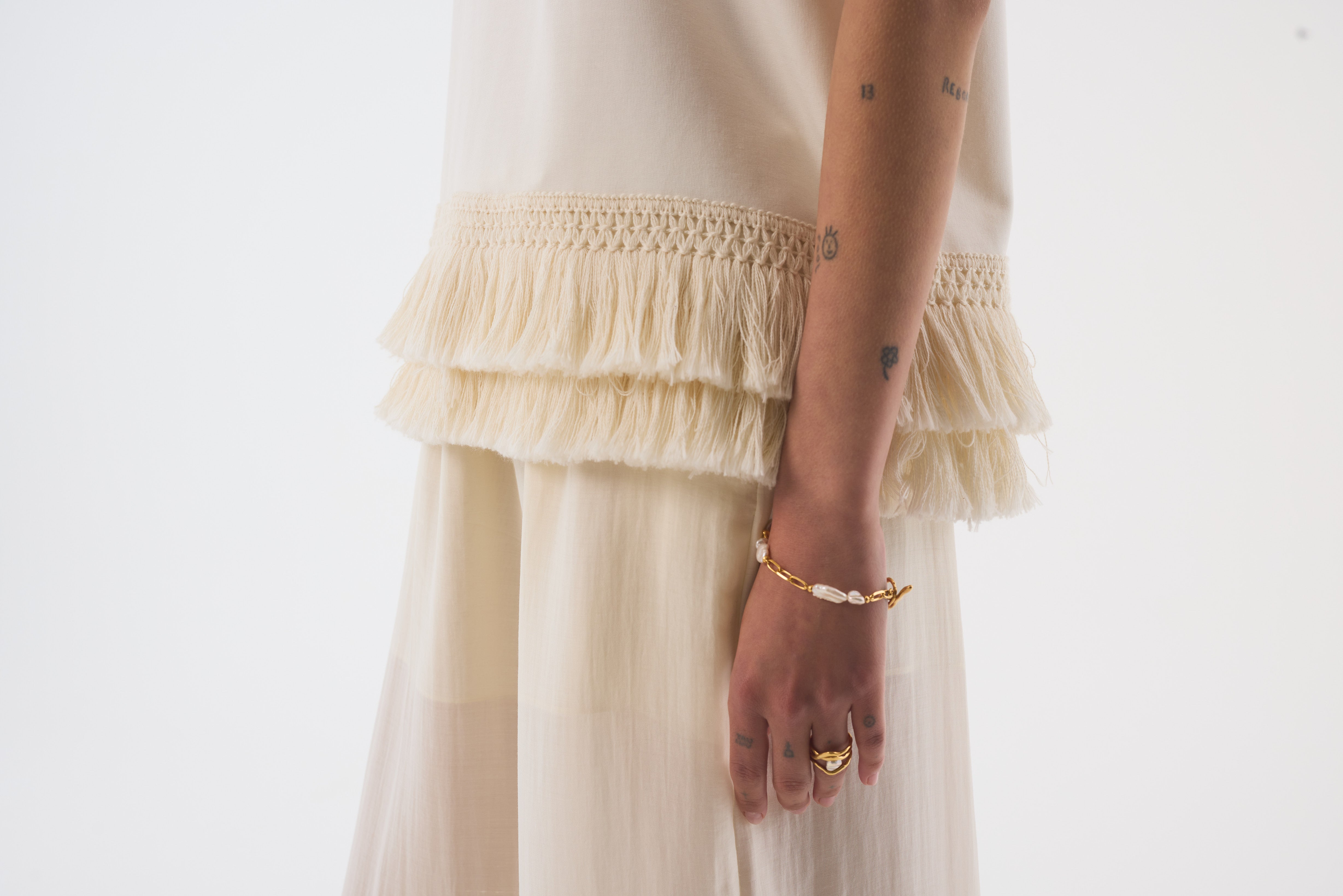 Xena is our T-shirt in soft undyed Italian fleece, finished with tonal cotton fringe for subtle texture and movement. A relaxed silhouette that brings a natural edge to everyday dressing.