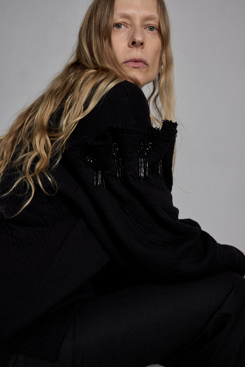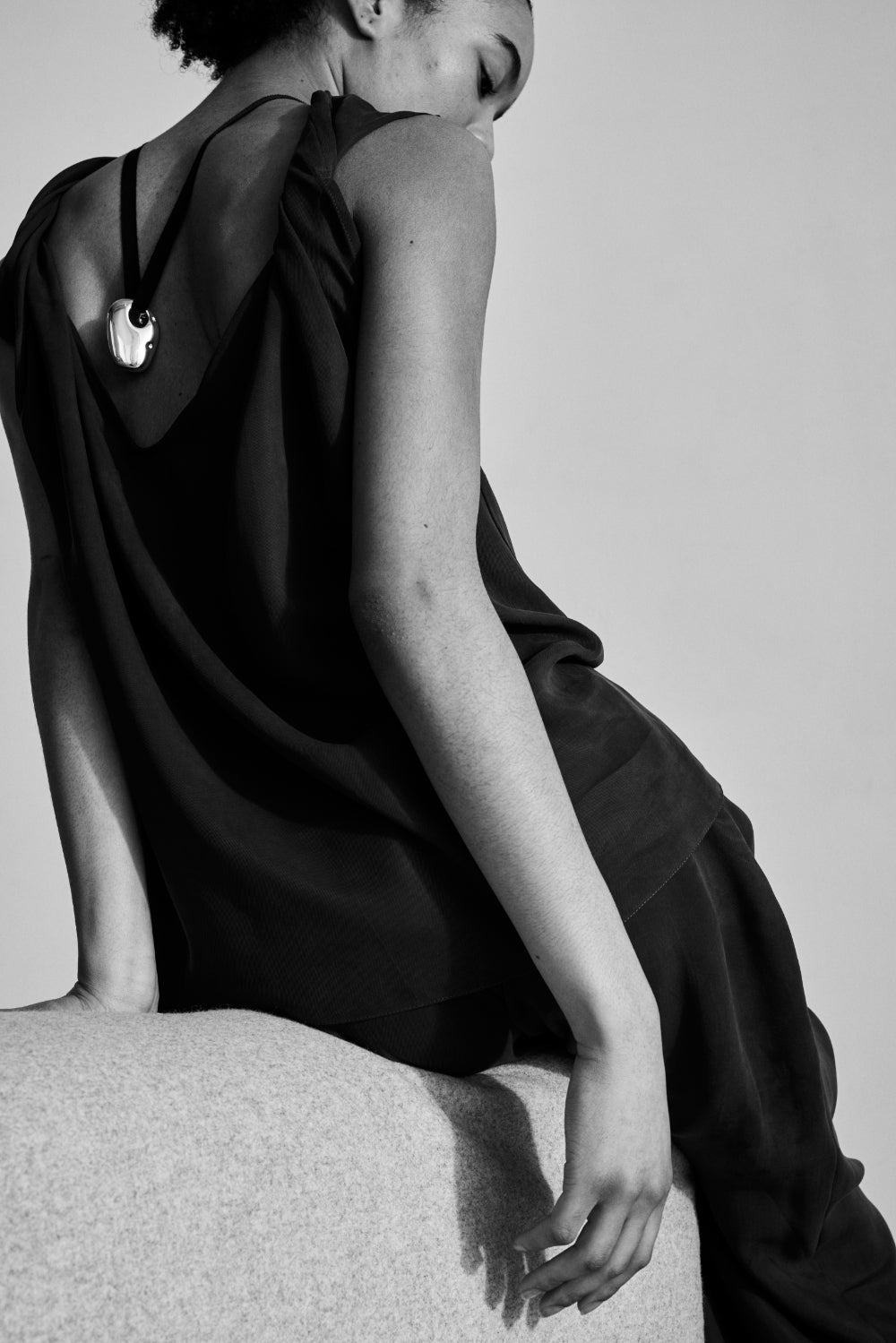 Collection 002 builds on creative director Amy Powney's signature designs, introducing an updated version of the iconic ‘pearl shoulder’ with cluster embellishments. Carrying forward the ethos of elevating core wardrobe staples through considered detail, epitomised this season by the distinctive cast hag stone button.