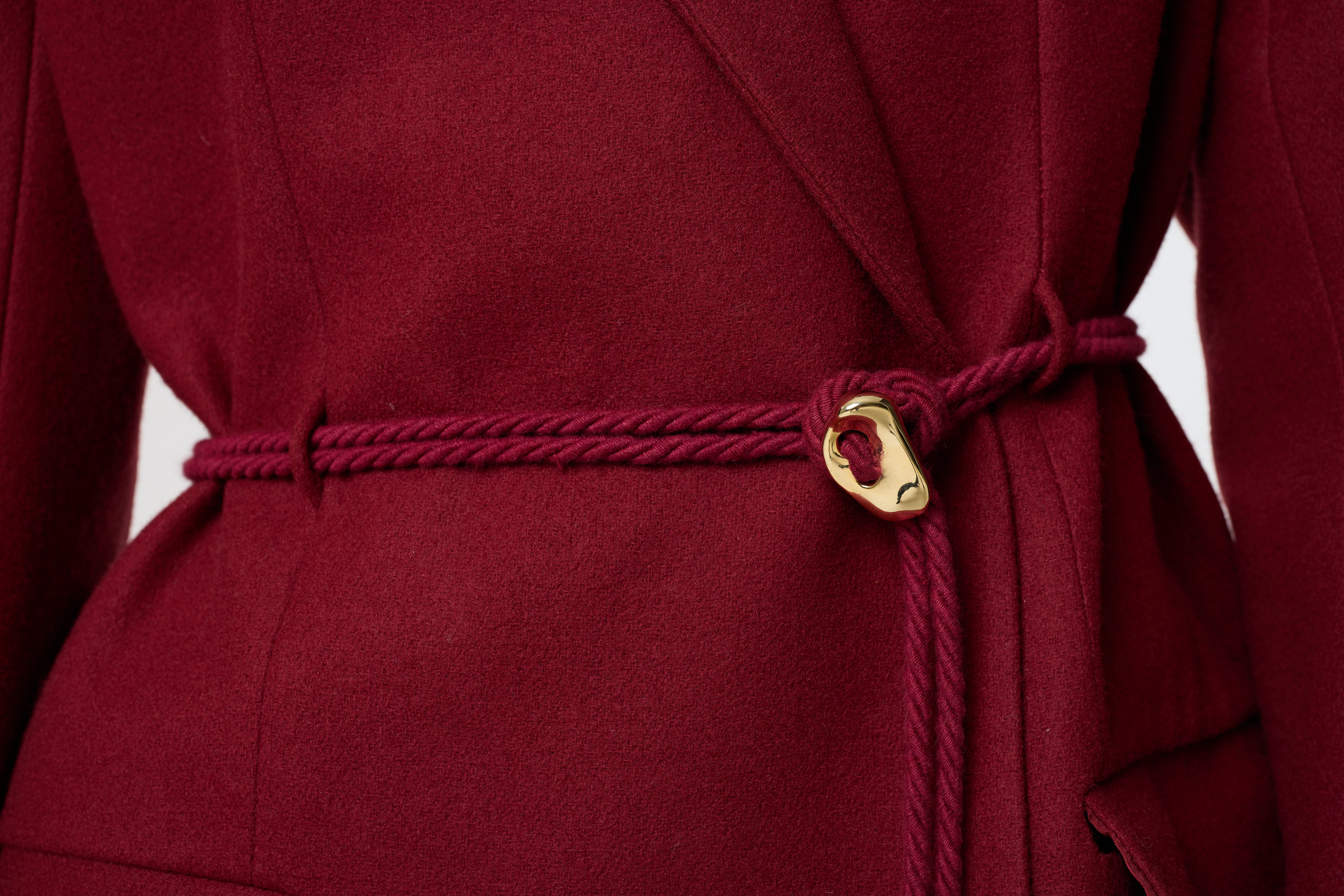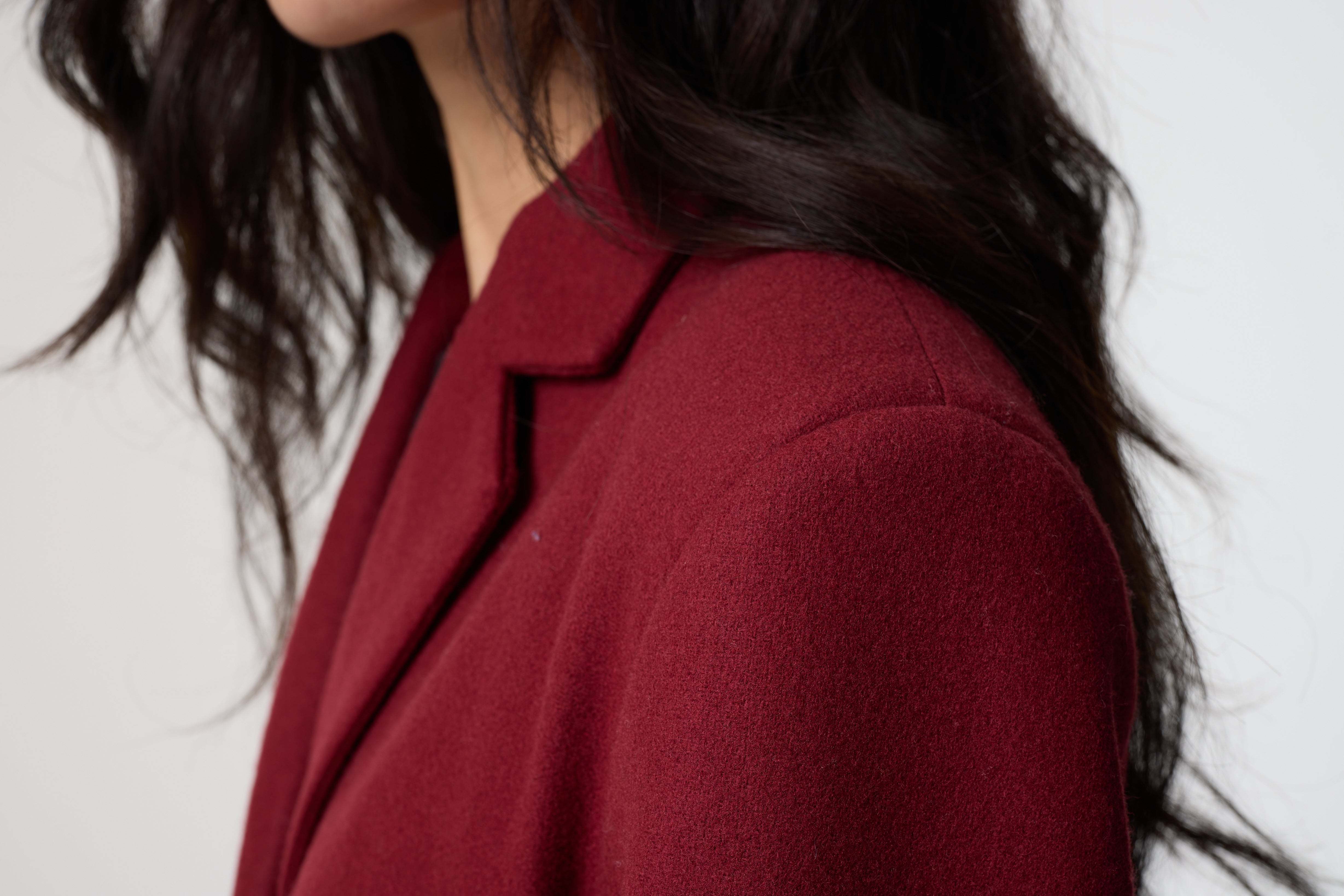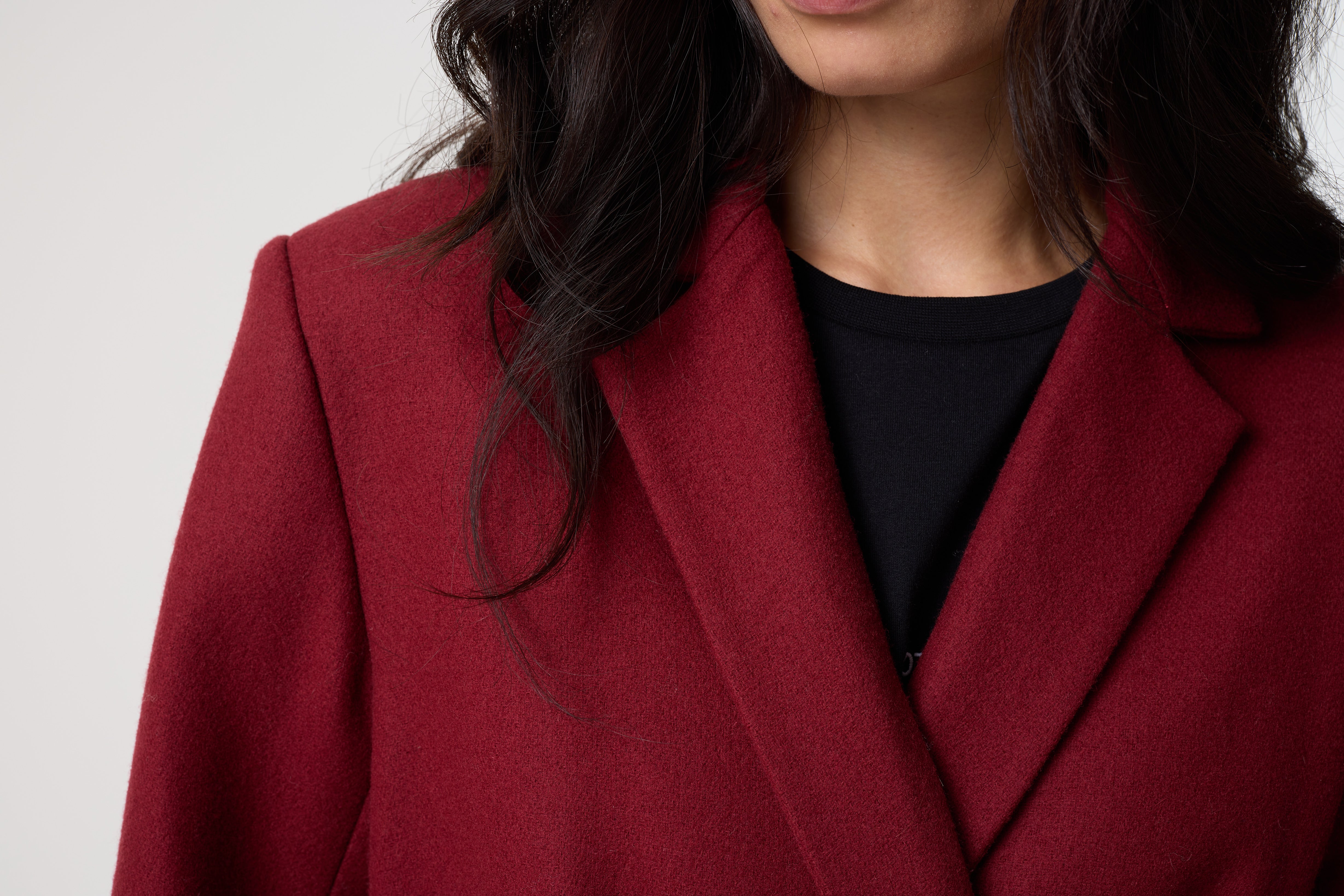 Alba is our tailored long coat in deep red, crafted from 100% wool and finished with a sculptural toggle belt. Designed with clean lines and a refined silhouette, it’s a striking outer layer that blends timeless tailoring with a bold, modern feel.