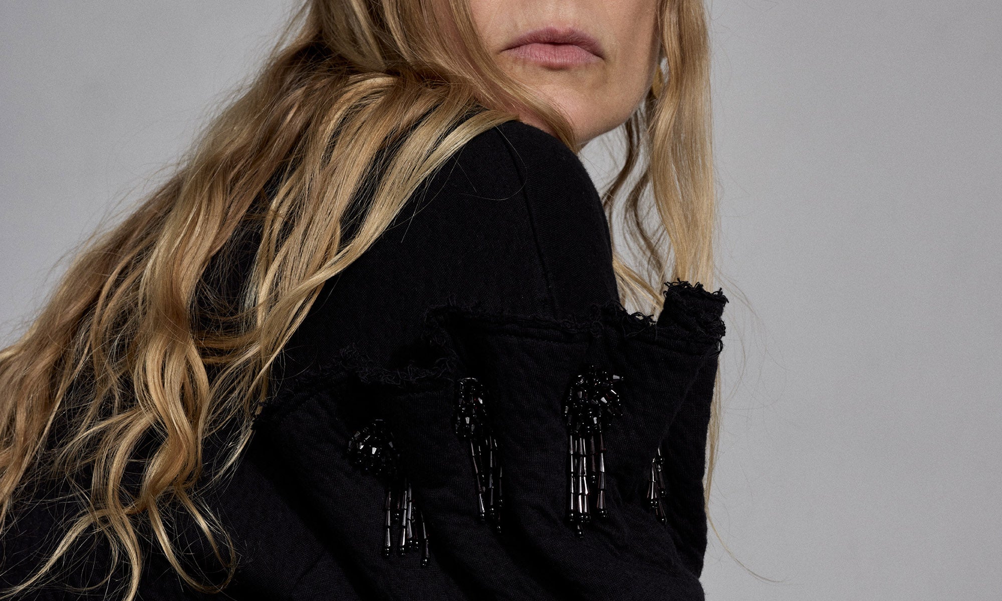 Aylin is a longer-line sweatshirt crafted from black interlock jacquard. Our iconic studded-shoulder detail has been reimagined with our bead cluster embellishment, elevating this casual winter staple for day to night dressing.