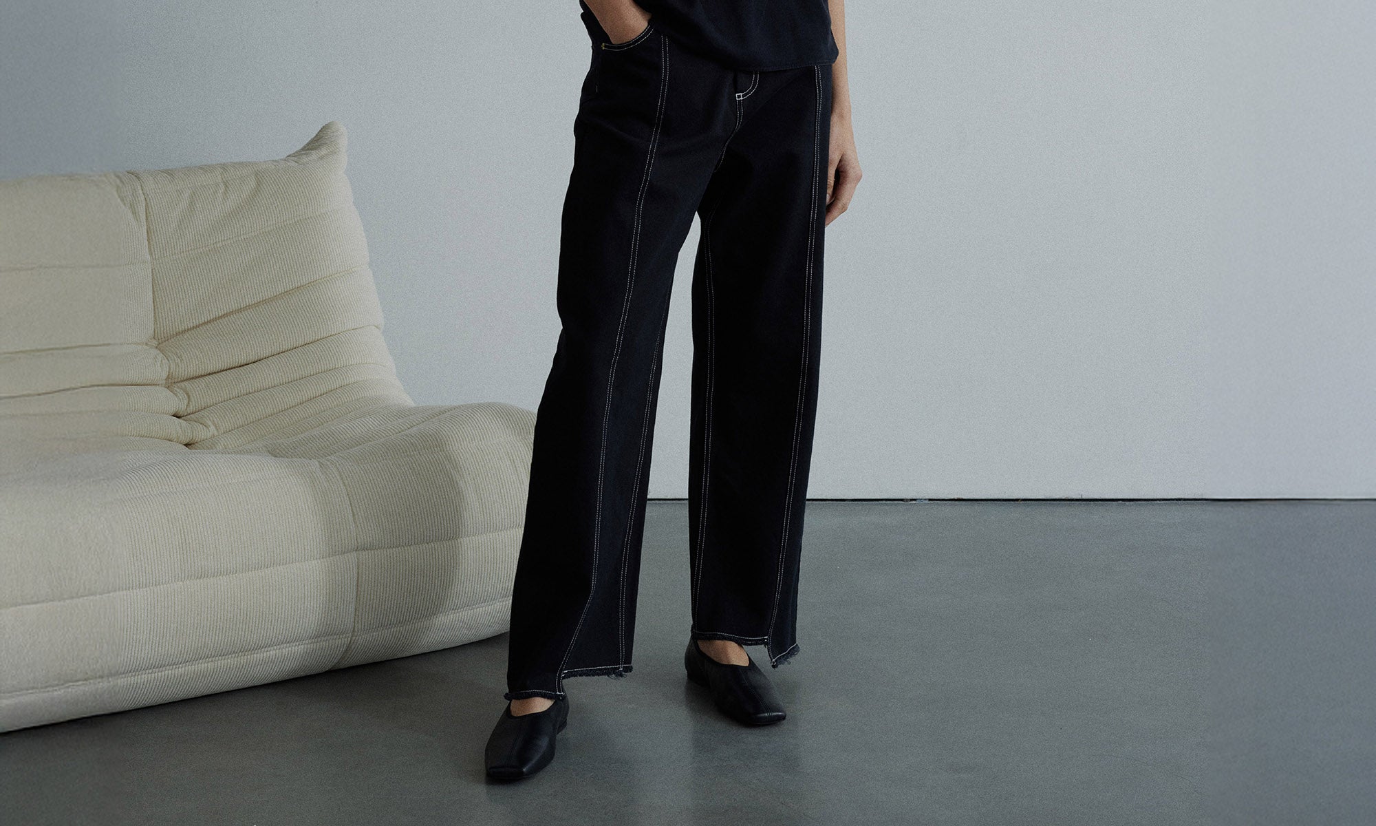 Our newest denim style has arrived. Blake is a wide barrel leg jean cut from a blend of undyed organic and recycled cotton in ecru. Designed with a mid-rise waist and a gently tapered leg, it finishes in a stepped, frayed hem that adds a subtle, deconstructed edge. A distinctive gold button brings a refined elevation to this everyday staple.