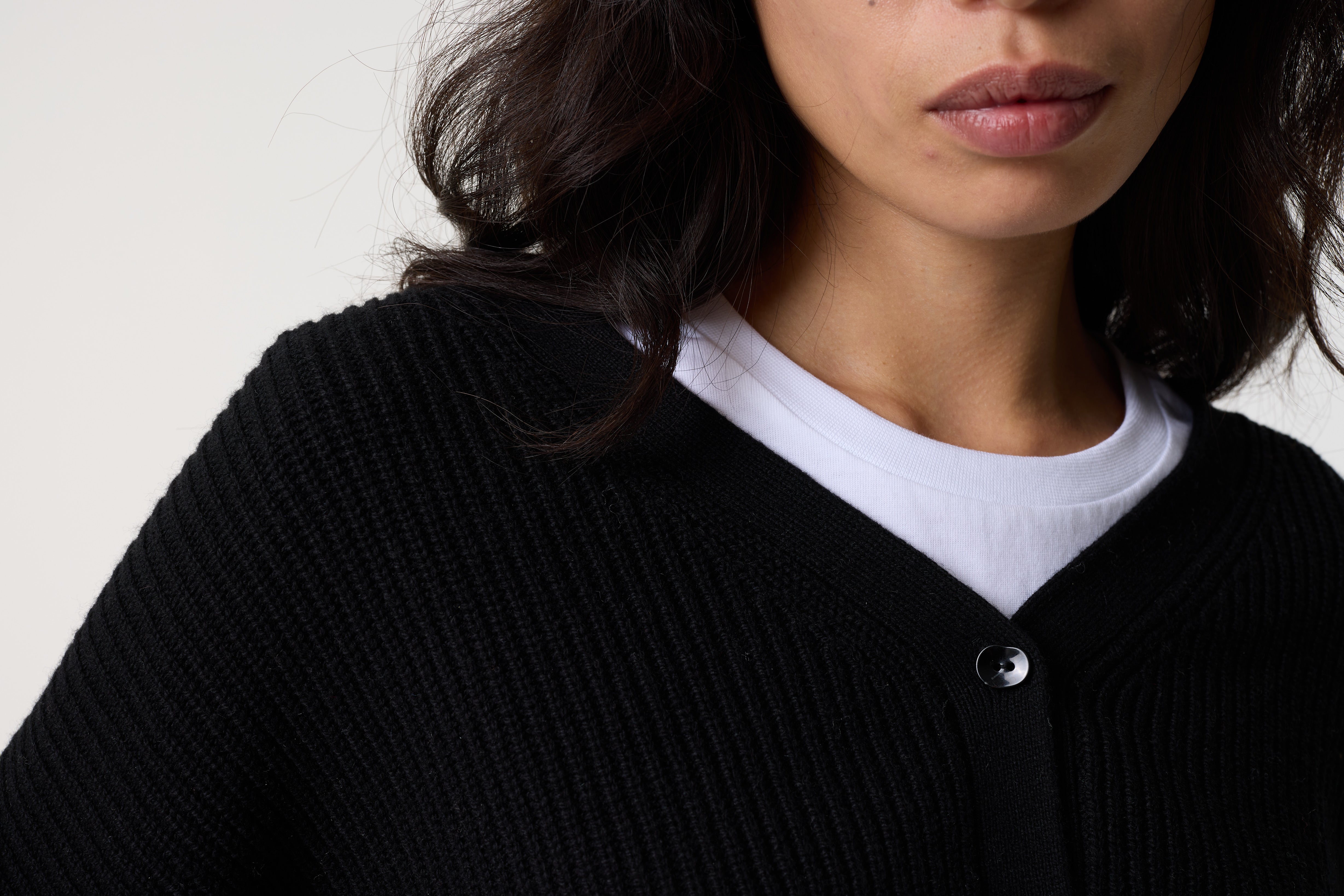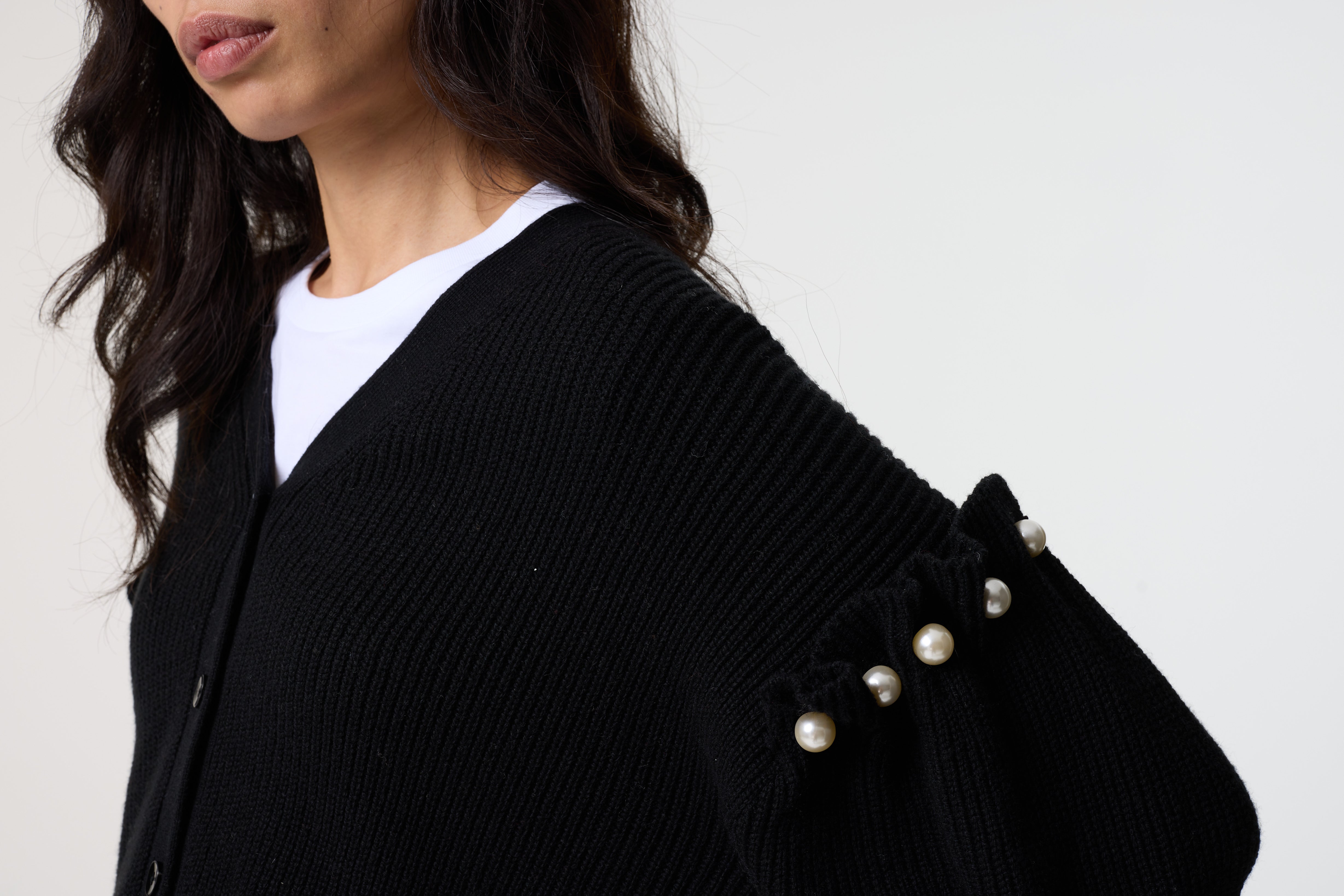 Zelia is our cropped cardigan in soft black knit, detailed with faux pearl-studded shoulders and faux pearl buttons down the front. Gently rounded sleeves and a relaxed silhouette add a playful edge to this everyday staple.